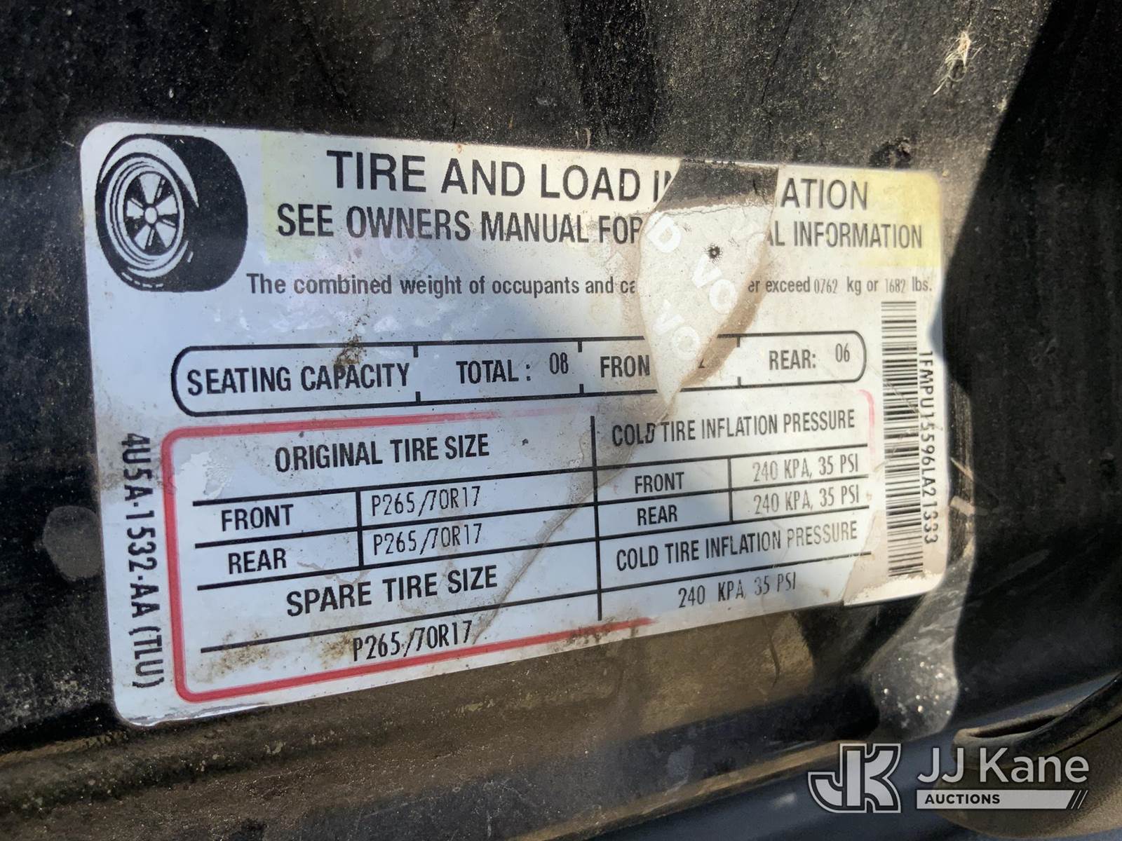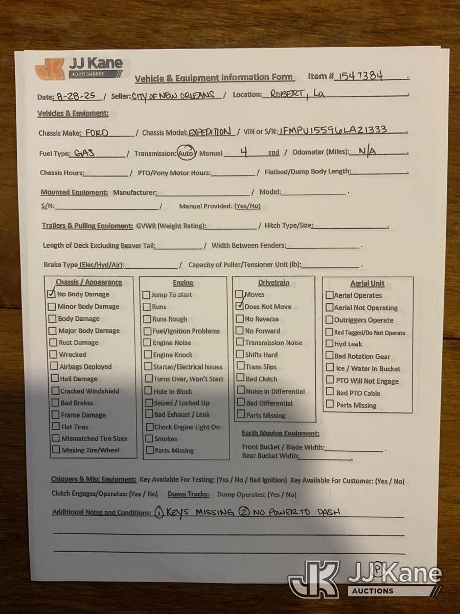 2006 Ford Expedition 4-Door Sport Utility Vehicle, 8-cyl gas, Auto, A/C, True Mileage Unknown (Not Running, Condition Unknown) (No Keys, No Power To Dash, Rear Seats Removed) This is a Titled Item NOTE: This unit is being sold AS IS/WHERE IS via Timed Auction and is located in Robert, LA. Call Jordan at (769) 231-2679 with questions. License # LA AB-154 (Buyer is responsible for removal. Assistance by consignor or JJ Kane Auctions is not assured.)