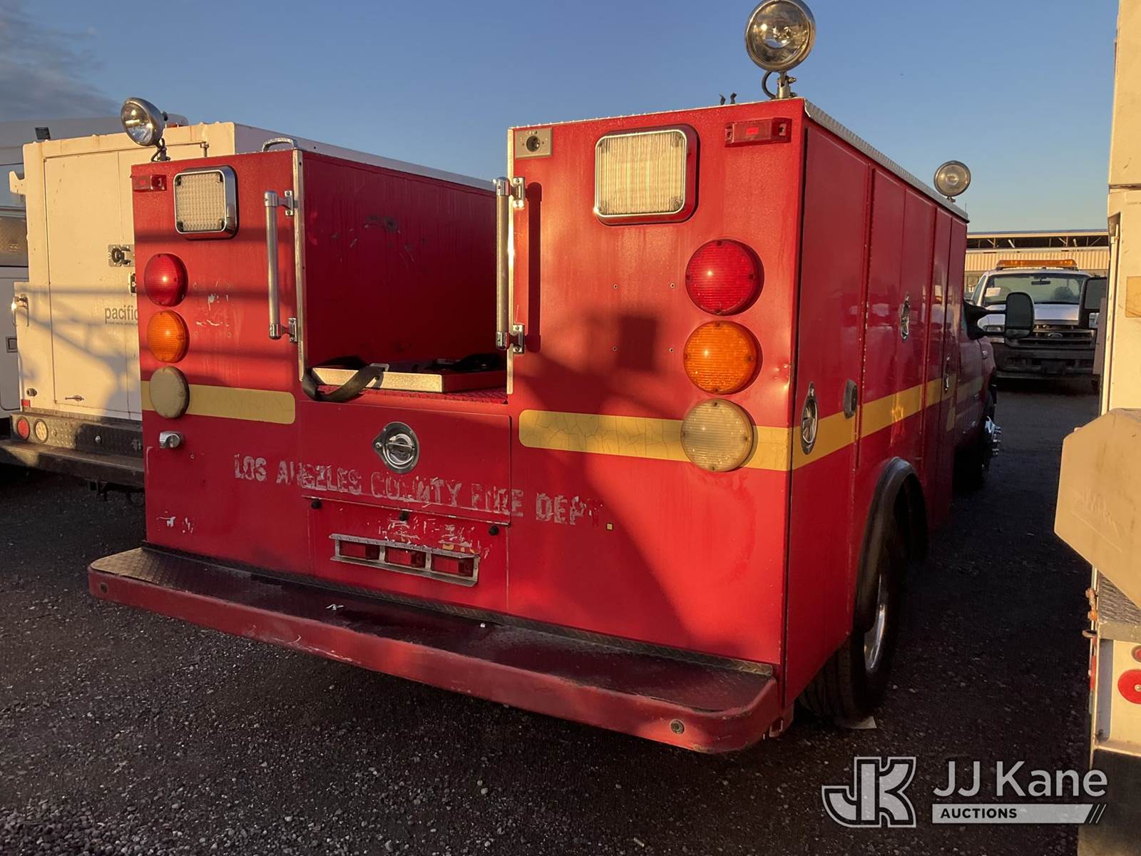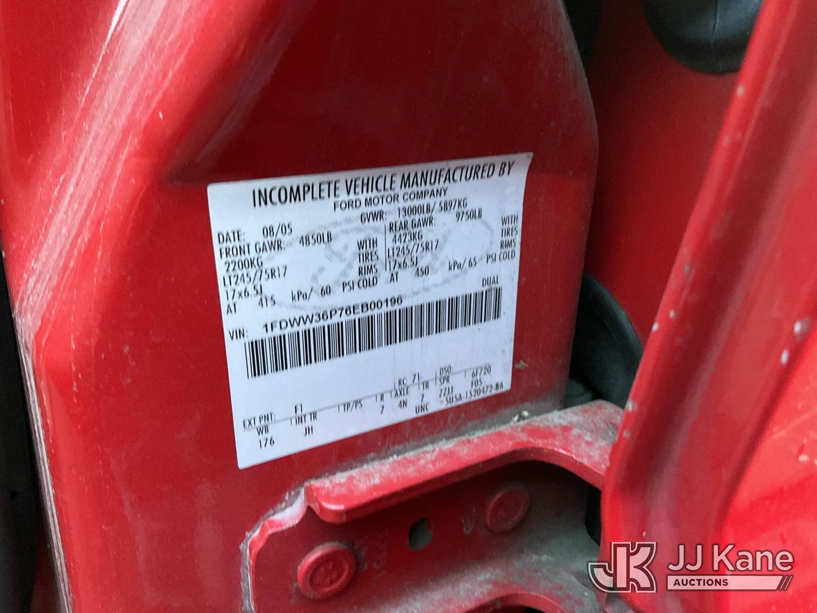 2006 Ford F-350 SD Fire Truck, s/n 1FDWW36P76EB00196, 6.0L V8 OHV 32V TURBO DIESEL 6-spd, RWD, A/C, (Exempt from Odometer Disclosure - Reads 178,530 miles) (Runs & Moves) (Bent Driveline, No Horn, Interior Stripped Of Parts, Missing Battery) (Bidding Restricted to Licensed Vehicle Dealers Only), May be subject to ARB Regulations This is a Titled Item NOTE: This unit is being sold AS IS/WHERE IS via Timed Auction and is located in Jurupa Valley, CA. Inspection & preview days for this unit are the 2 business days prior to the first day of items closing for this auction, item is located at 4510 Muth Way Jurupa Valley, CA 92509 and hours of operations are 8a-4p. For pre-sale questions, please contact please contact Office Staff @ (310) 353-7140. Dealer License Number 45696. (Buyer is responsible for removal. Assistance by consignor or JJ Kane Auctions is not assured.)
