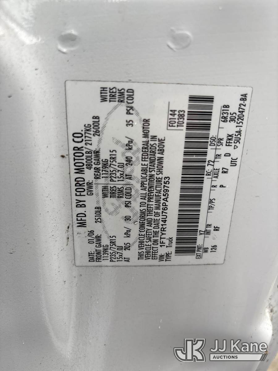 2006 Ford Ranger Extended-Cab Pickup Truck, 6-cyl gas, Auto, A/C, (99,179 miles) (Runs & Moves) This is a Titled Item NOTE: This unit is being sold AS IS/WHERE IS via Timed Auction and is located in Dixon, CA. Inspection & preview days for this unit are the 2 business days prior to the first day of items closing for this auction, item is located at 8668 Sparling Ln Dixon, CA 95620 and hours of operations are 8a-4p. For pre-sale questions, please contact JJ Kane Staff at (707) 678-8060 (dixon@jjkane.com). Dealer License Number 45696. (Buyer is responsible for removal. Assistance by consignor or JJ Kane Auctions is not assured.)