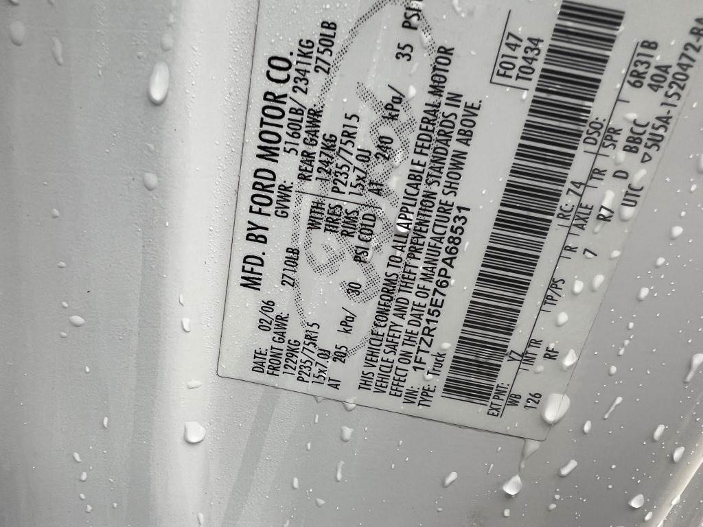 Location: Washougal WA ***County Government Surplus*** VIN: 1FTZR15E76PA68531 Engine: 4.0L 6cyl Gas Transmission: Automatic 6' Bed, Gem Top truck cap w/roof cross bars, A/C, AM/FM/CD, spring suspension, 235/75R15 tires.