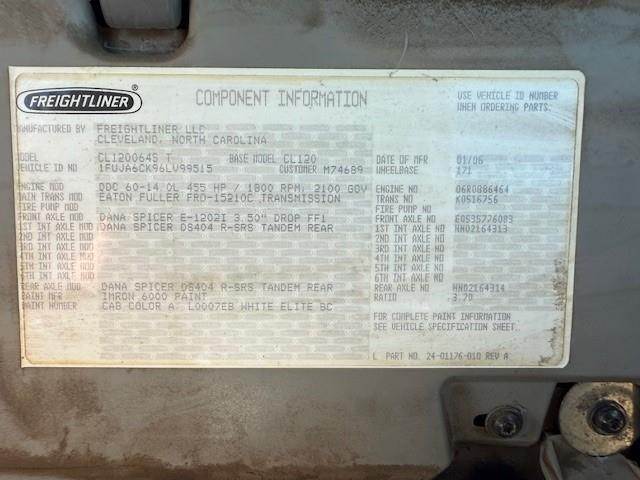 Series 60 Detroit 455 hp, FRO-15210C manual 10 speed transmission, 3.70 rear axle ratio, air ride suspension, air ride cab, 11R22.5 tires on steel wheels, dual 120 gallon fuel tanks, air slide 5th wheel, fender mirrors, heated mirrors, air ride driver seat,