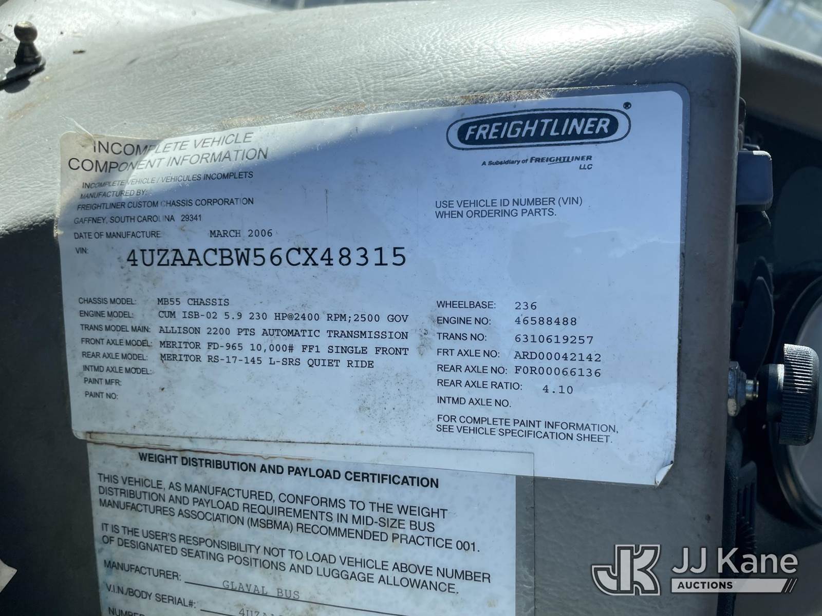 2006 Freightliner MB55 Chassis Bus, 5.9L L6 diesel, Auto, 4X2, A/C, (64,085 miles) (Runs and Moves. Paint Damage, Jump to Start. (Seller States: Air Leak) This is a Titled Item NOTE: This unit is being sold AS IS/WHERE IS via Timed Auction and is located in Riviera Beach, FL. For pre-sale questions or to schedule an inspection, please call Gregg Martini @ 561-519-5775. Removals require 24-hr Notice by Appointment Only, Buyer/Hauler must present copy of Paid-in-Full JJ Kane Release Form upon arrival. Purchaser acknowledges ALL lots must be removed within 10 business days of Auction, or a towing & storage fee may be incurred. (Buyer is responsible for removal. Assistance by consignor or JJ Kane Auctions is not assured.)