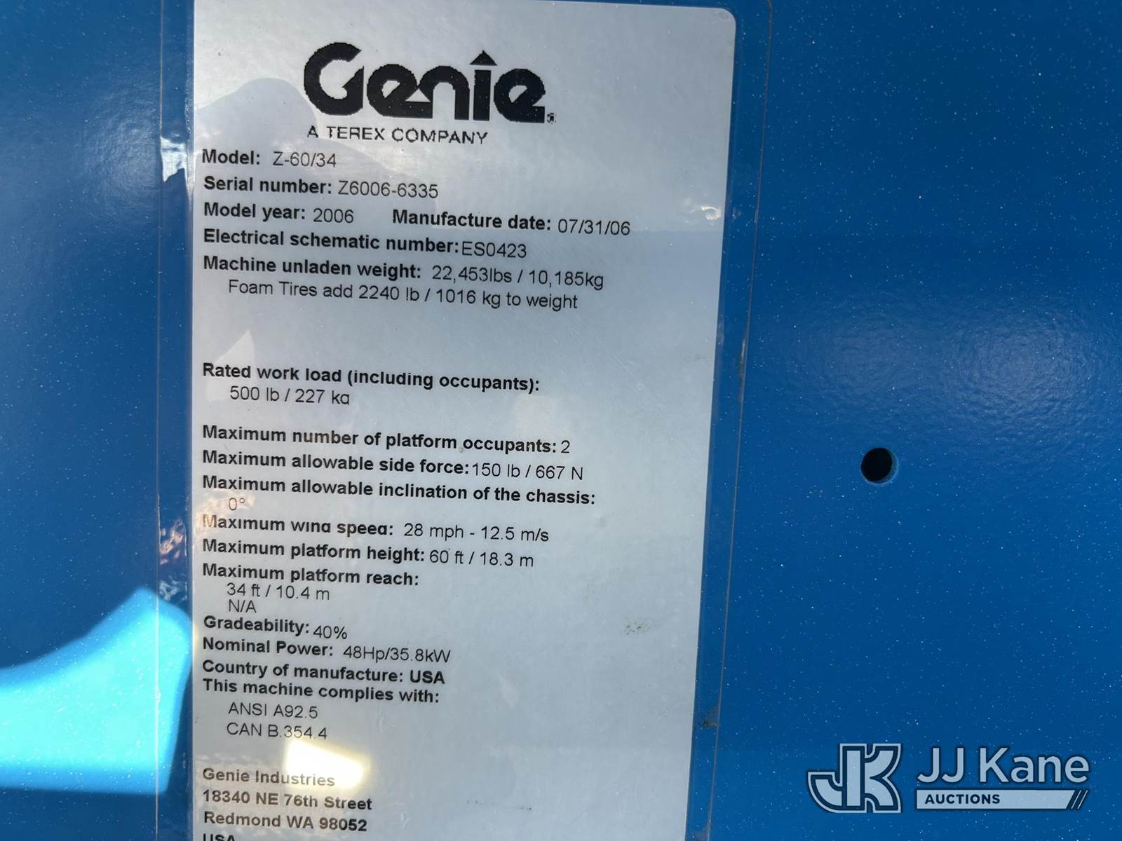 2006 Genie Z60-34 Self-Propelled Telescopic Manlift, s/n Z6006-6335, Deutz diesel, 4wd, Hydrostatic, with 60 ft platform height, 34 ft. horizontal reach, 500-lb lift capacity, operating weight approx. 22,500, (Runs, Moves & Operates) NOTE: This unit is being sold AS IS/WHERE IS via Timed Auction and is located in Byron, CA. (Buyer is responsible for removal. Assistance by consignor or JJ Kane Auctions is not assured.)