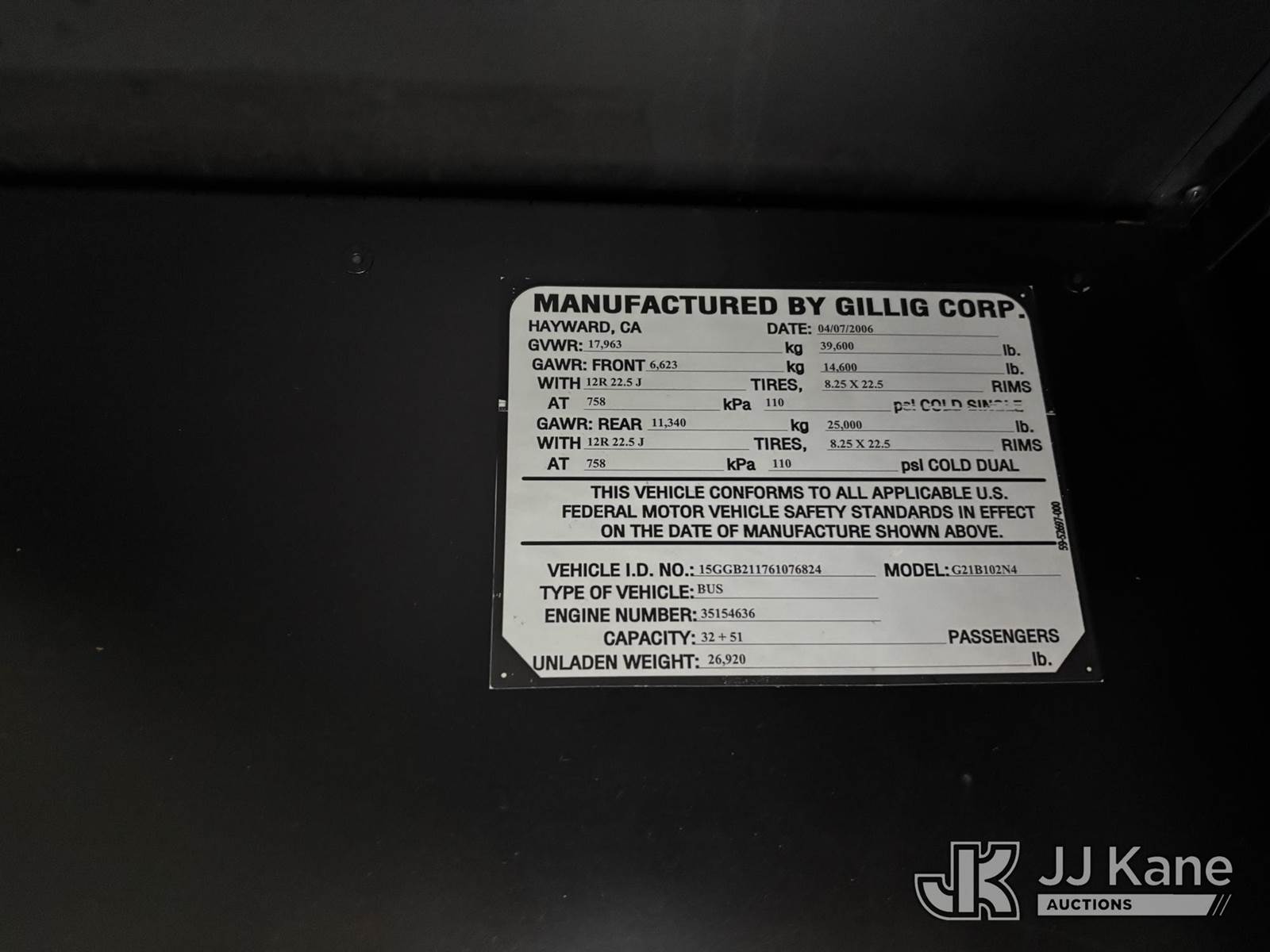 2006 Gillig Low Floor G21B102N4 Passenger Bus, s/n 15GGB211761076824, 10.0L diesel, Auto, True Mileage Unknown (Not Running, Condition Unknown) (Seller States: Will need a flatbed trailer to move.) This is a Titled Item NOTE: This unit is being sold AS IS/WHERE IS via Timed Auction and is located in (Everett RTA), WA. For pre-sale questions or concerns about the vehicle, to schedule an inspection or vehicle pick-up please contact Ry Hampton at 206-247-8928 or ry.hampton@jjkane.com. (Buyer is responsible for removal. Assistance by consignor or JJ Kane Auctions is not assured.)