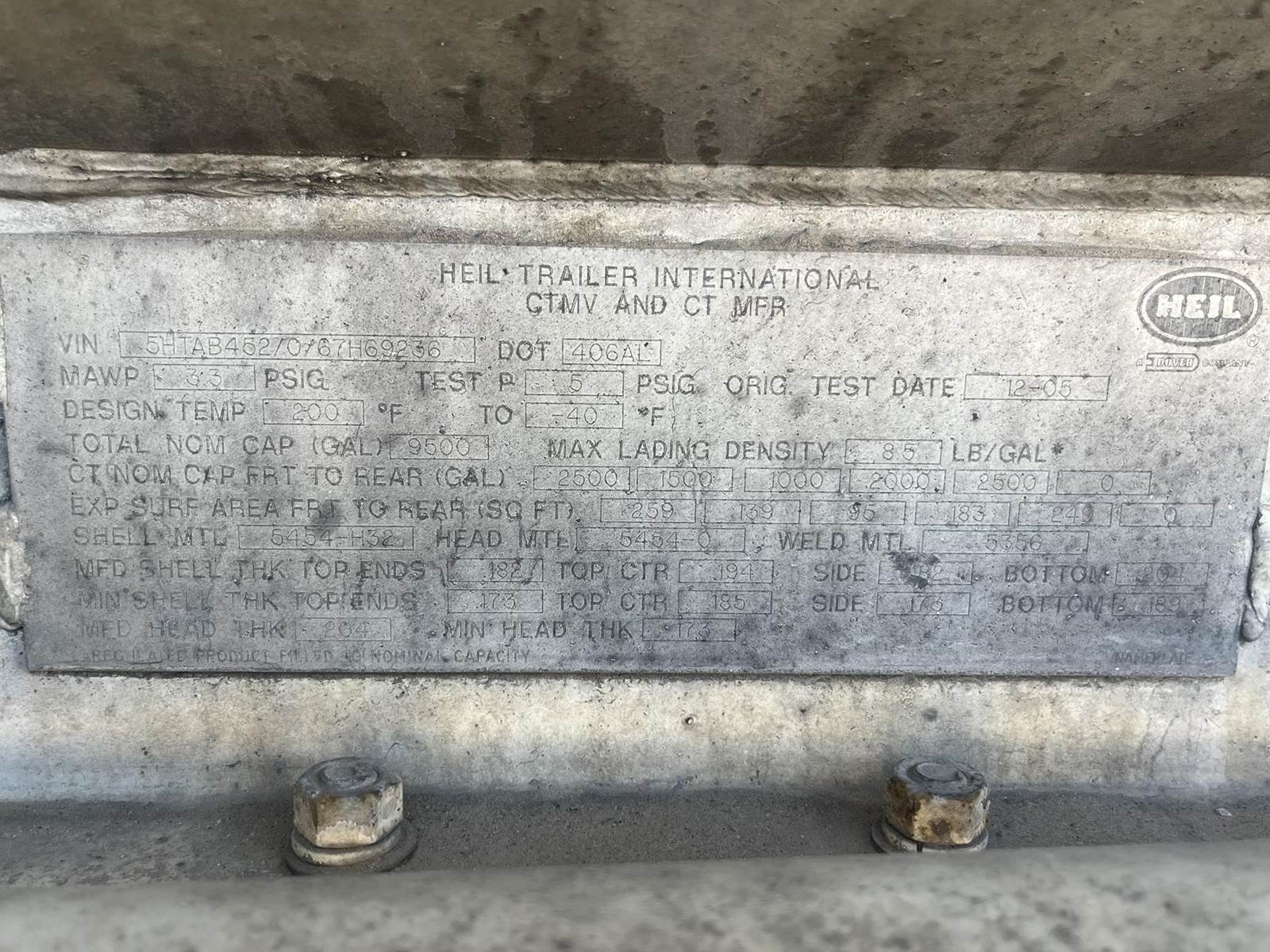 2006 Heil Fuel Trailer, - 9500 gal, - DOT 406, - 5 Compartments, 2500 - 1500 - 1000 - 2000 - 2500, - Aluminum tank, - Vapor recovery, -...