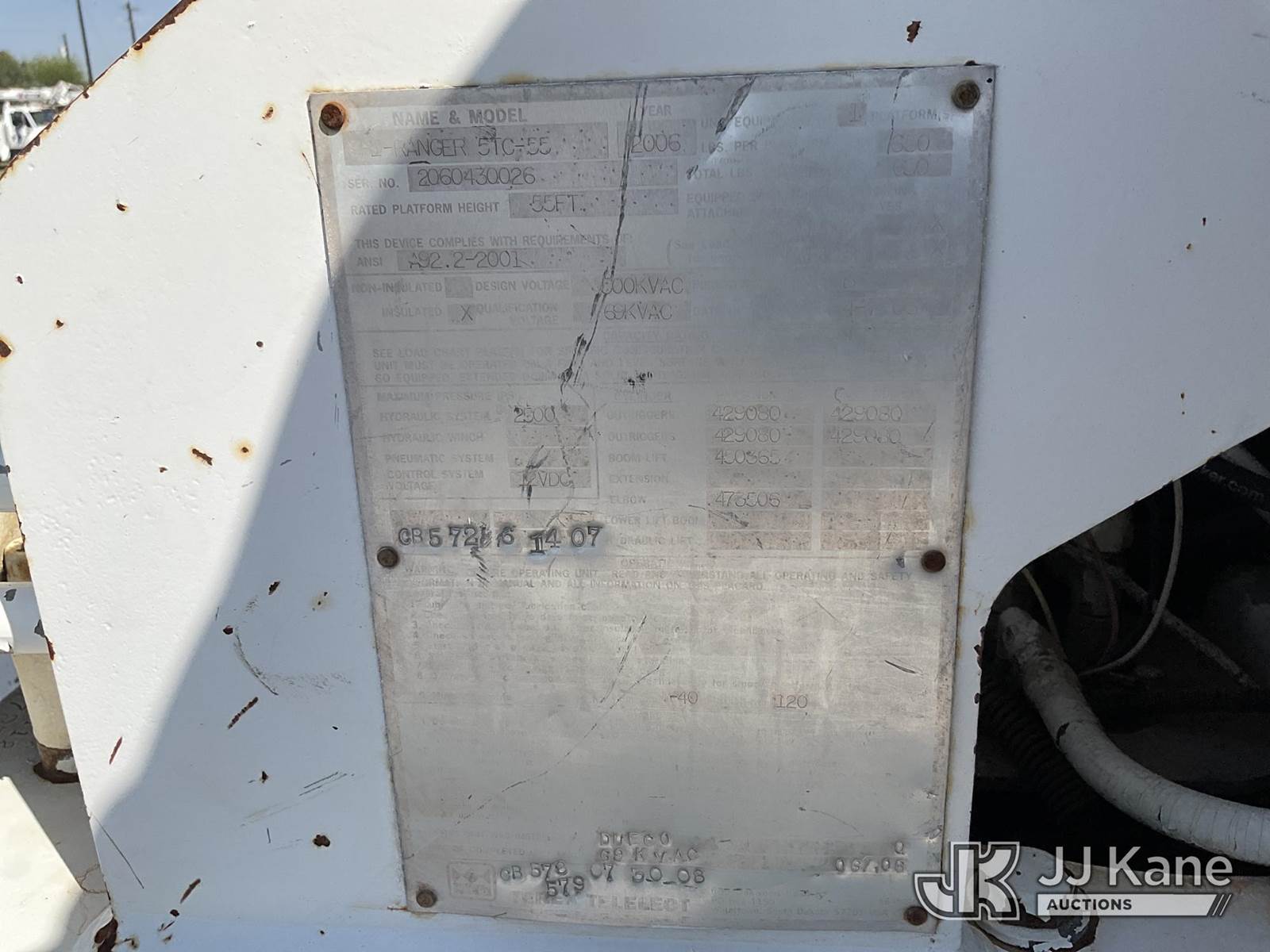 HiRanger 5TC-55, 60 ft, Bucket Truck s/n 2060430026, with 4 hyd. outriggers, two-man bucket, rear mounted on 2006 Sterling Acterra Utility Truck, 6.4L Auto, 4X2, diesel, A/C, (76,402 miles) (Runs, Moves, & Upper Operates) This is a Titled Item NOTE: This unit is being sold AS IS/WHERE IS via Timed Auction and is located in Victoria, TX. For more information & removal arrangements please contact Charles de Kanter @ 281-910-7147. Removal by appointment only, Buyer/Hauler must present copy of paid invoice upon arrival. Purchaser acknowledges ALL lots must be removed within 7 business days of Auction, or a storage fee may be incurred. For Removal and Pick Up information, please reference the hauler sheet sent out after purchase. (Missing manuals, See Auction Company for Manufacturers Information to obtain manuals) (Buyer is responsible for removal. Assistance by consignor or JJ Kane Auctioneers is not assured.)