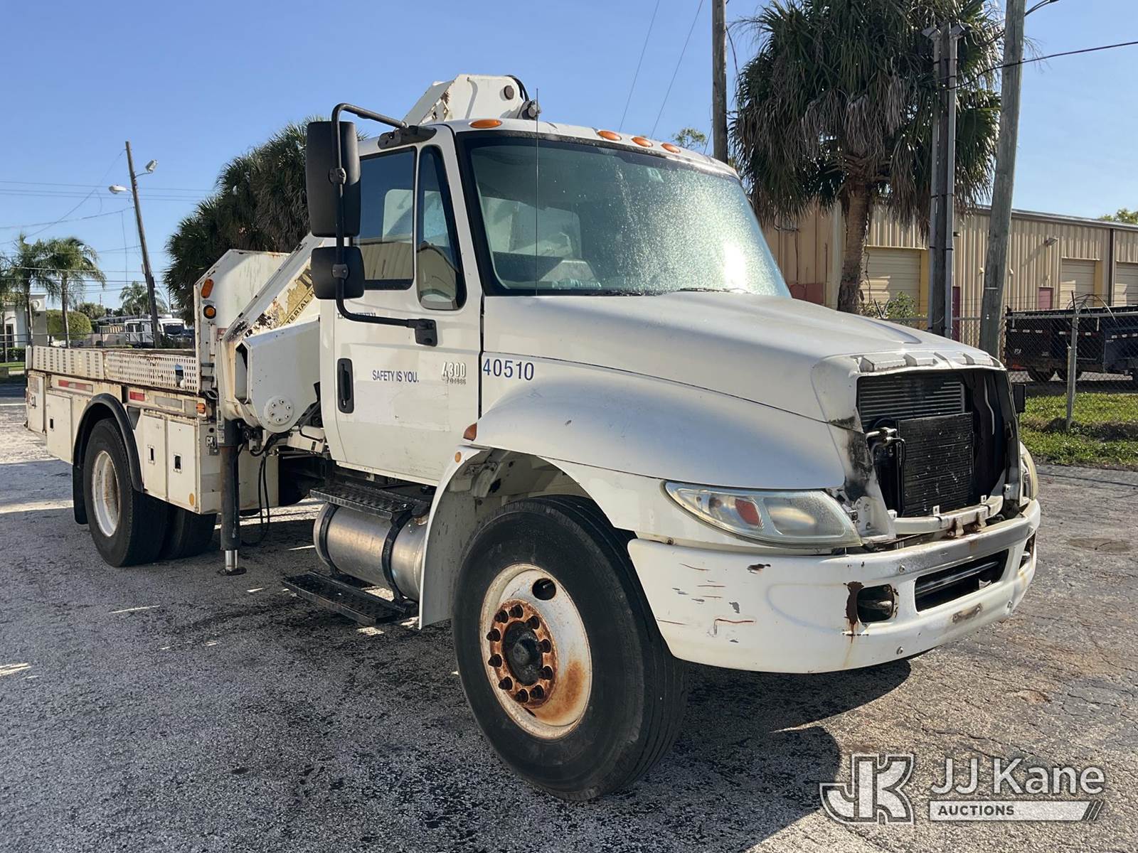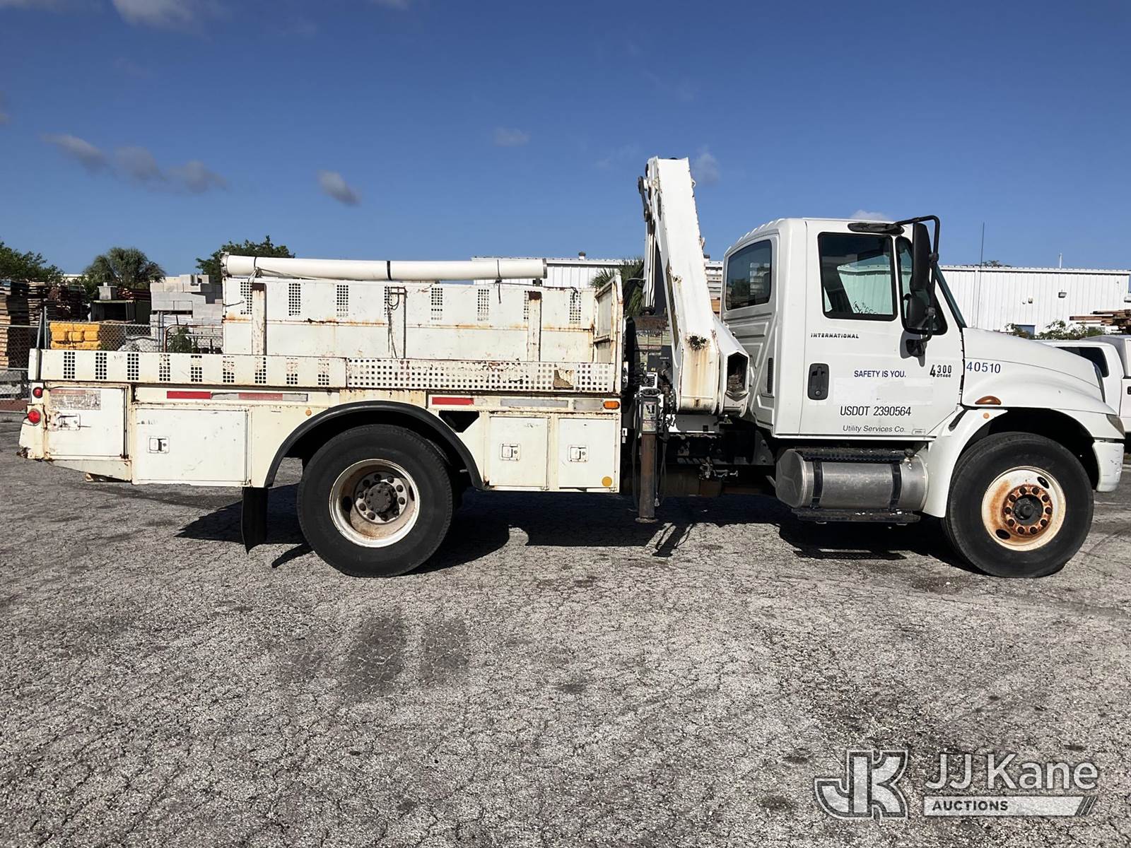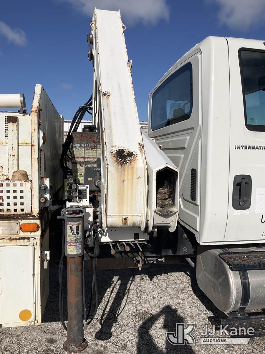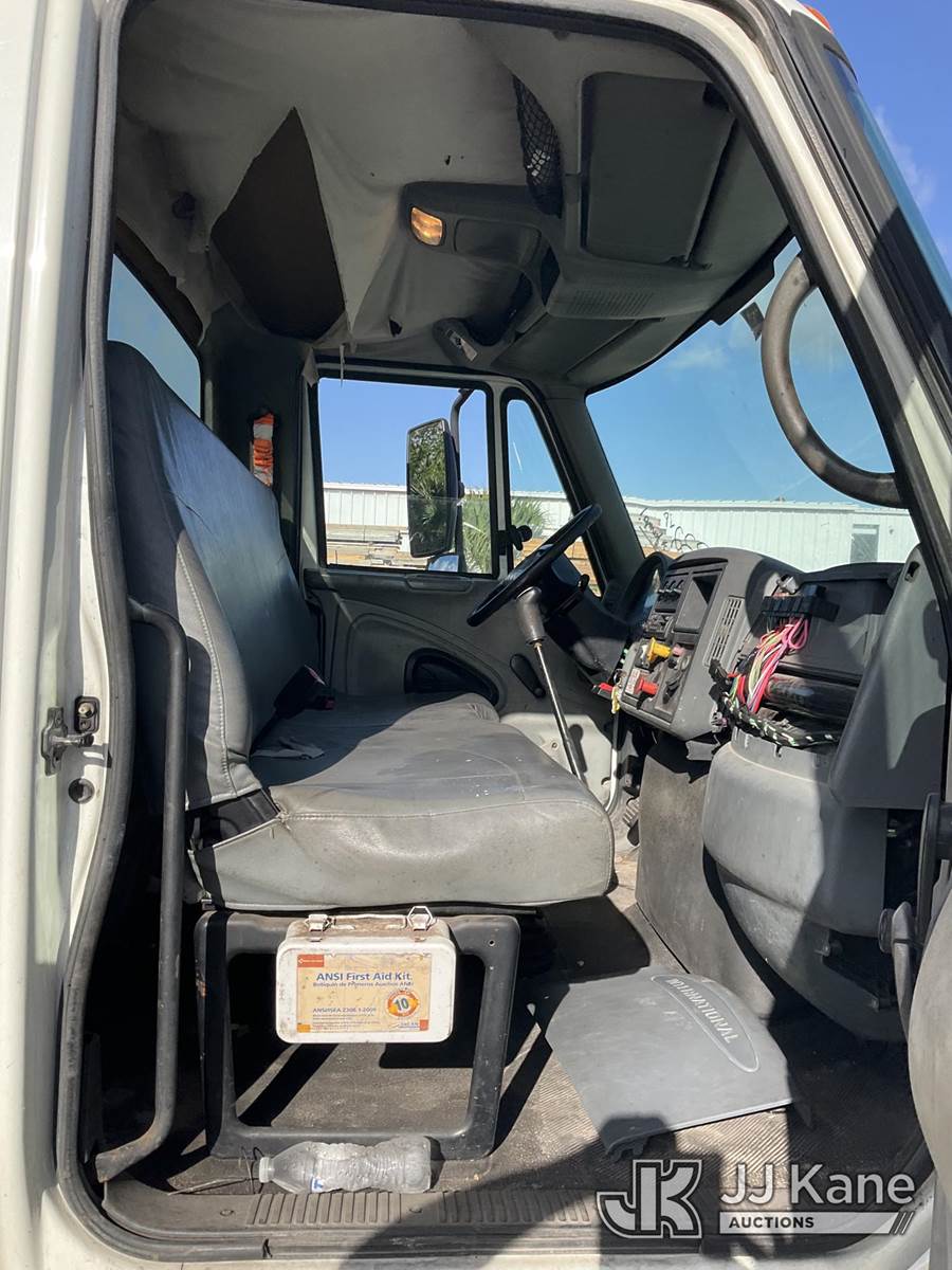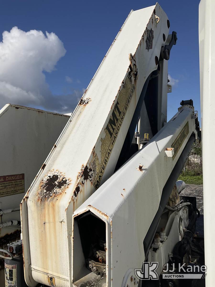 IMT 11/76-K3, 6,835 Lb Knuckleboom Crane s/n 761036, with 30 ft. reach, dual controls & 2 hyd outriggers, mounted behind cab on 2006 International 4300 URD/Flatbed Truck, 7.6L L6 Diesel, 6-spd, A/C, (Exempt from Odometer Disclosure - Reads 134,530 miles) (Runs & Moves With Jump, Blown Hydraulic Hoses, Boom Operating Condition Unknown, ABS Light On, Body Damage & Rust, Interior & Engine Grill Damaged) (FL Residents Purchasing Titled Items – tax, title & registration fees will be collected at the maximum rate of $400.00 under 25,999 and $800.00 for Over 26,000 and $250.00 for Trailers – Proof of insurance is mandatory; Out of State Residents Purchasing Title Items – tax will be collected based upon your state rate) (Reads 7,833 hours) This is a Titled Item NOTE: This unit is being sold AS IS/WHERE IS via Timed Auction and is located in West Palm Beach, FL. Inspection & preview days for this unit are the 2 business days prior to the first day of items closing for this auction, item is located at 2570 Old Okeechobee Rd West Palm Beach, FL 33409 and hours of operations are 8a-4p. For pre-sale questions, please contact Andy Garcia @ (561) 215-0085. (Missing manuals, See Auction Company for Manufacturers Information to obtain manuals) (Buyer is responsible for removal. Assistance by consignor or JJ Kane Auctions is not assured.)