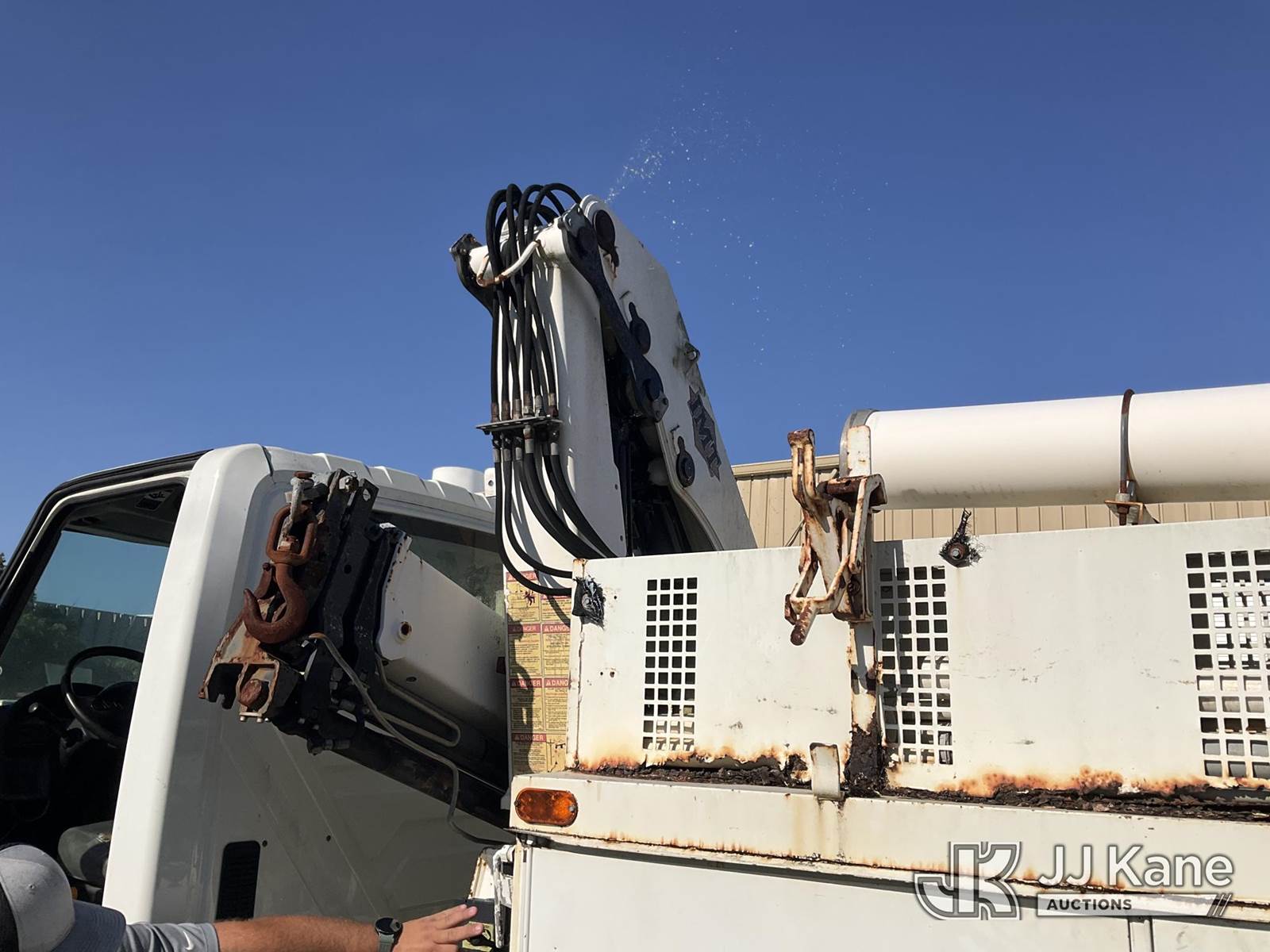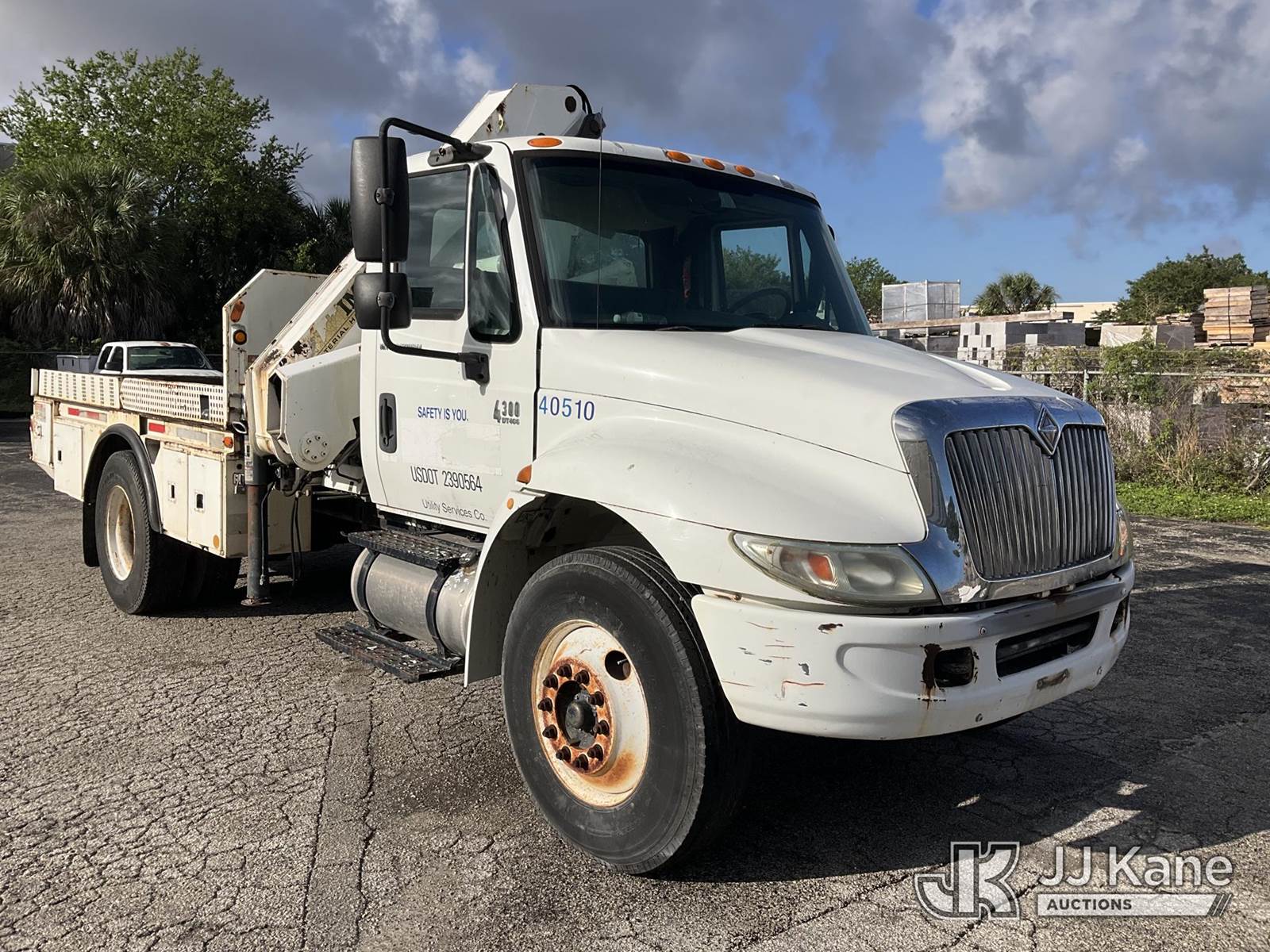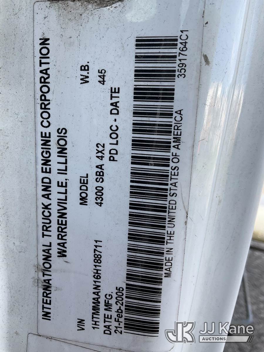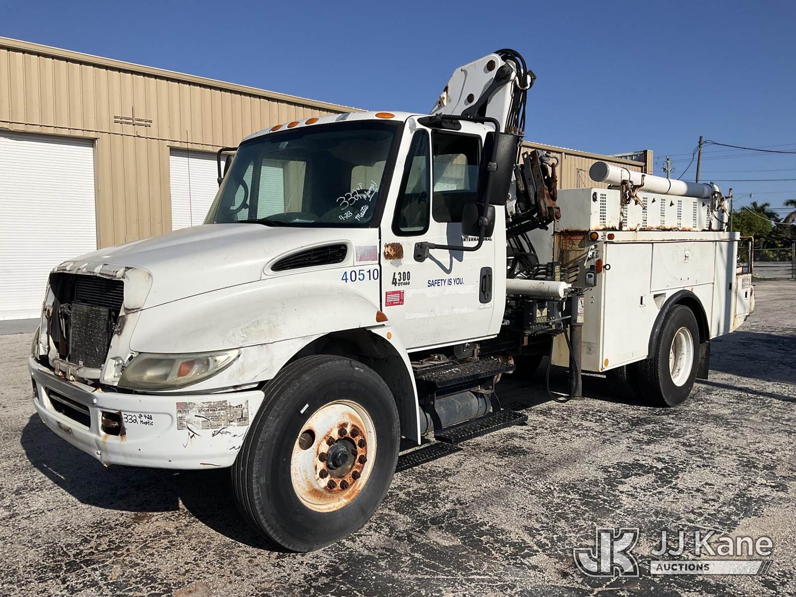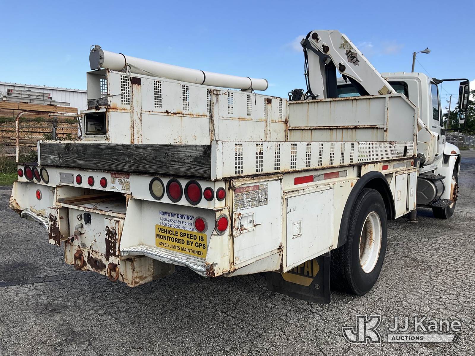 IMT 11/76-K3, 6,835 Lb Knuckleboom Crane s/n 761036, with 30 ft. reach, dual controls & 2 hyd outriggers, mounted behind cab on 2006 International 4300 URD/Flatbed Truck, 7.6L L6 Diesel, 6-spd, A/C, (Exempt from Odometer Disclosure - Reads 134,530 miles) (Runs & Moves With Jump, Blown Hydraulic Hoses, Boom Operating Condition Unknown, ABS Light On, Body Damage & Rust, Interior & Engine Grill Damaged) (FL Residents Purchasing Titled Items – tax, title & registration fees will be collected at the maximum rate of $400.00 under 25,999 and $800.00 for Over 26,000 and $250.00 for Trailers – Proof of insurance is mandatory; Out of State Residents Purchasing Title Items – tax will be collected based upon your state rate) (Reads 7,833 hours) This is a Titled Item NOTE: This unit is being sold AS IS/WHERE IS via Timed Auction and is located in West Palm Beach, FL. Inspection & preview days for this unit are the 2 business days prior to the first day of items closing for this auction, item is located at 2570 Old Okeechobee Rd West Palm Beach, FL 33409 and hours of operations are 8a-4p. For pre-sale questions, please contact Andy Garcia @ (561) 215-0085. (Missing manuals, See Auction Company for Manufacturers Information to obtain manuals) (Buyer is responsible for removal. Assistance by consignor or JJ Kane Auctions is not assured.)