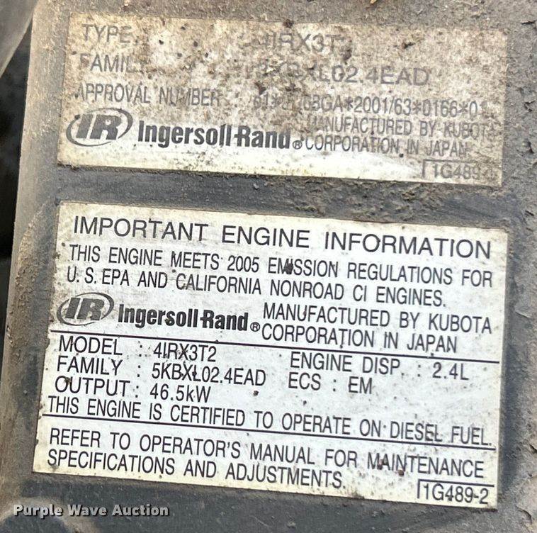Rotair D185 T4F air compressor, Hours: 1,358 on meter, Serial: C36542, Engine, Kubota V2403, Serial: 7DF7439, Cylinders: 4, Fuel type:...