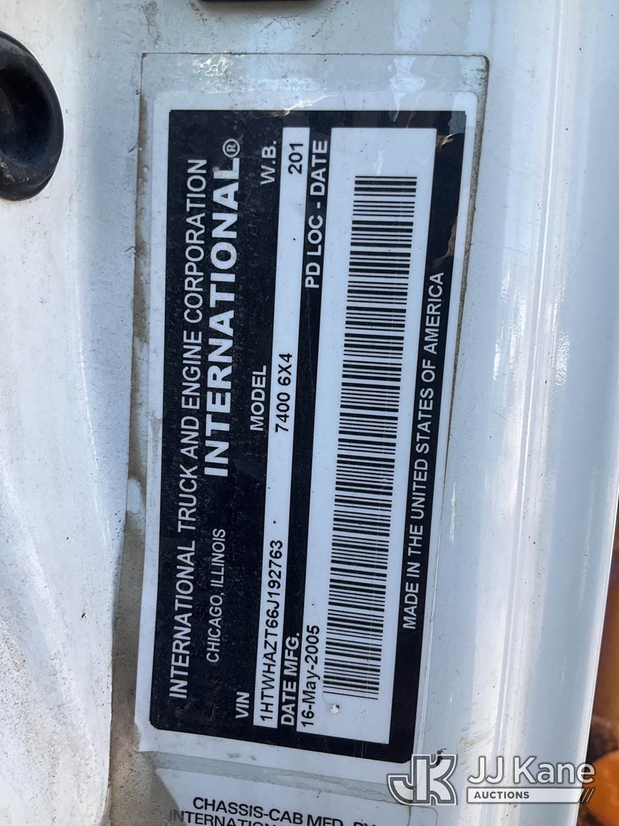 2006 International 7400 T/A Dump Truck, 9.3L L6 DIESEL 6X4, Auto, A/C, with Front end Plow mount, (Exempt from Odometer Disclosure - Reads 76,379 miles) (Runs, Moves, Unable To Operate Dump-Condition Unknown) (Paint/Body/Rust Damage, Tailgate Removed) (Reads 7,840 hours) This is a Titled Item NOTE: This unit is being sold AS IS/WHERE IS via Timed Auction and is located in South Beloit, IL. Inspection & preview days for this unit are the 2 business days prior to the first day of items closing for this auction, item is located at 14354 Dearborn Ave South Beloit, IL and hours of operations are 8a-4p. For pre-sale questions, please contact Derek Eklund at (608) 904-0618 or (derek.eklund@jjkane.com). (Buyer is responsible for removal. Assistance by consignor or JJ Kane Auctions is not assured.)
