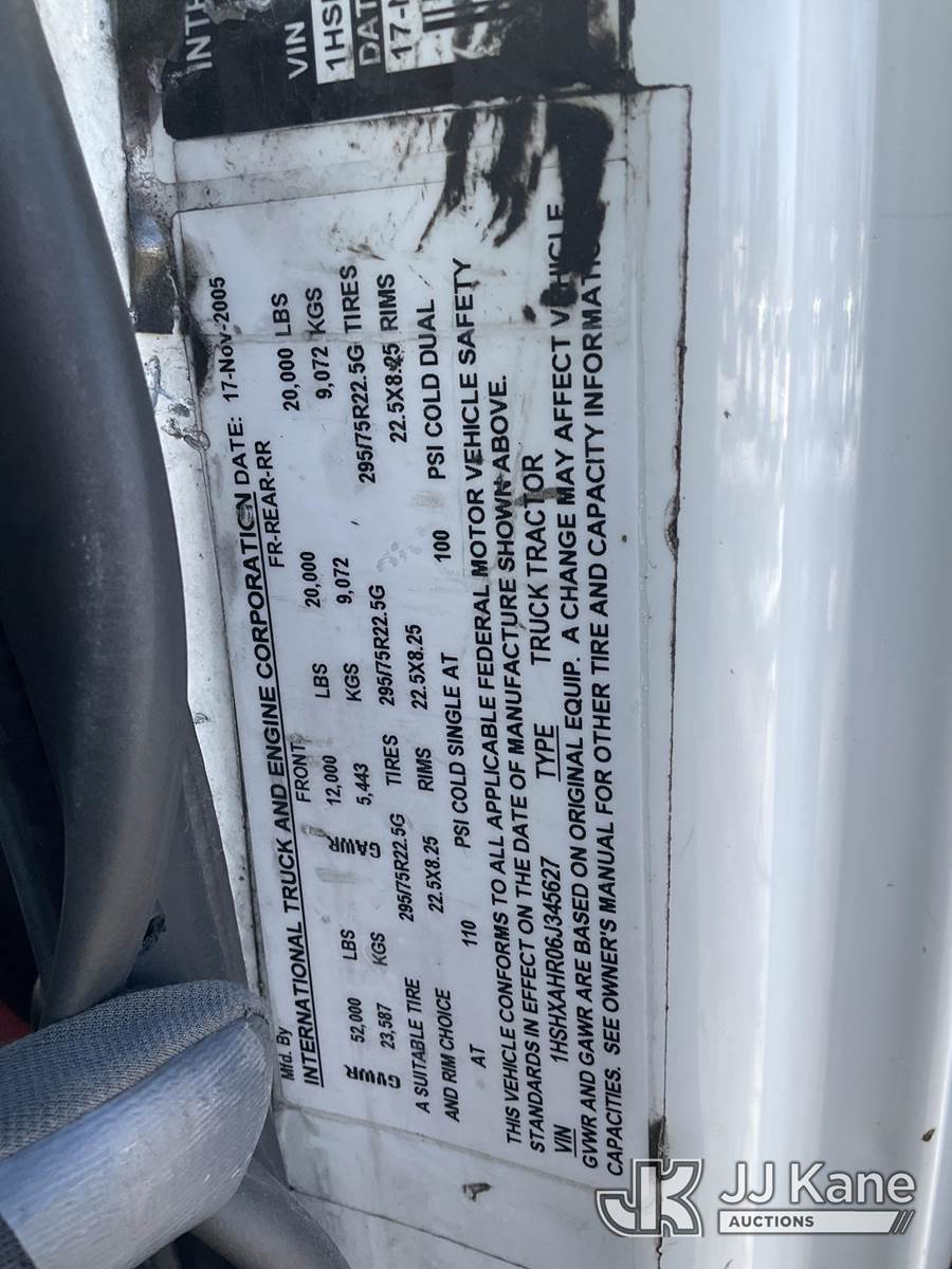 2006 International 8600 T/A Truck Tractor, 10.8L L6 DIESEL 6X4, Auto, A/C, with air slide 5th wheel hitch, (Exempt from Odometer Disclosure - Reads 145,801 miles) (Runs & Moves) (Reads 9,646 hours) This is a Titled Item NOTE: This unit is being sold AS IS/WHERE IS via Timed Auction and is located in South Beloit, IL. Inspection & preview days for this unit are the 2 business days prior to the first day of items closing for this auction, item is located at 14354 Dearborn Ave South Beloit, IL and hours of operations are 8a-4p. For pre-sale questions, please contact Derek Eklund at (608) 904-0618 or (derek.eklund@jjkane.com). (Buyer is responsible for removal. Assistance by consignor or JJ Kane Auctions is not assured.)