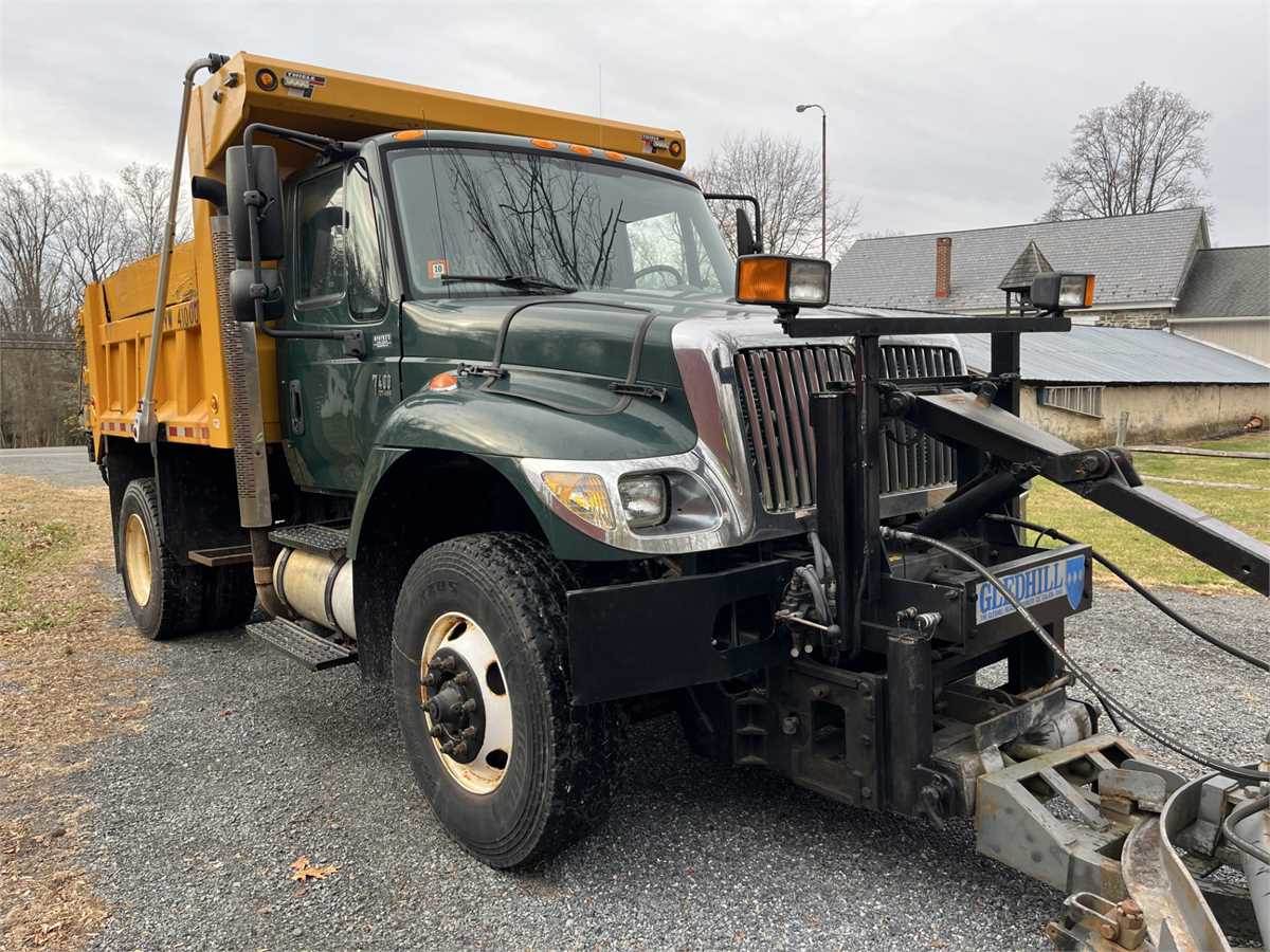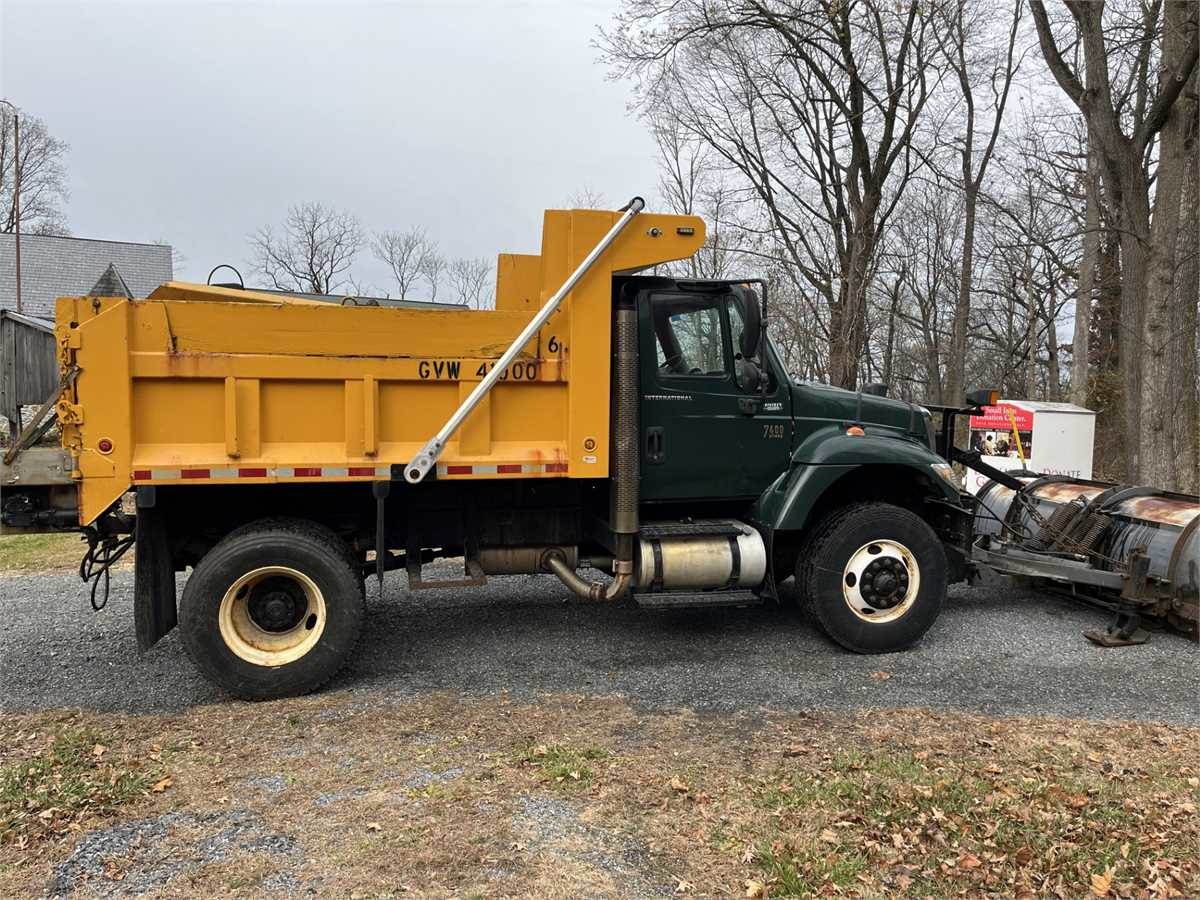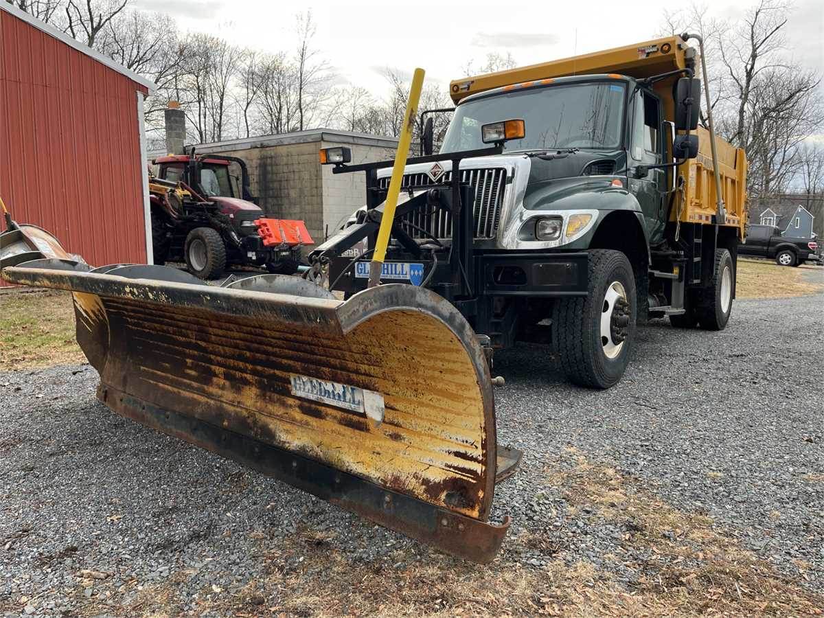 2006 International 7400 Dump Truck with snowplow and salt spreader. Side Plow assembly included with vehicle. Vehicle has DT466E Engine. Vehicle runs and drives but will need battery box, batteries and air tanks.
