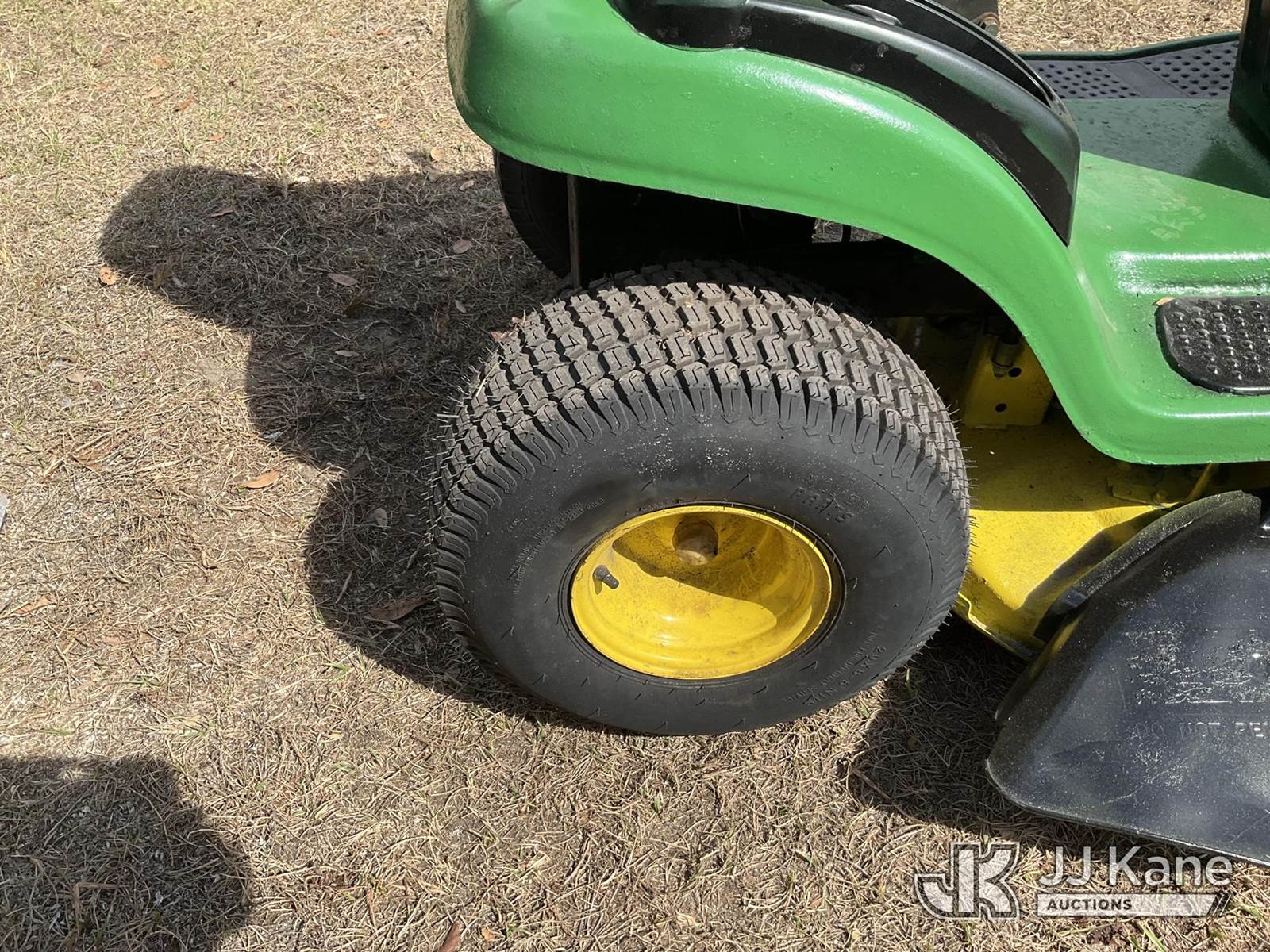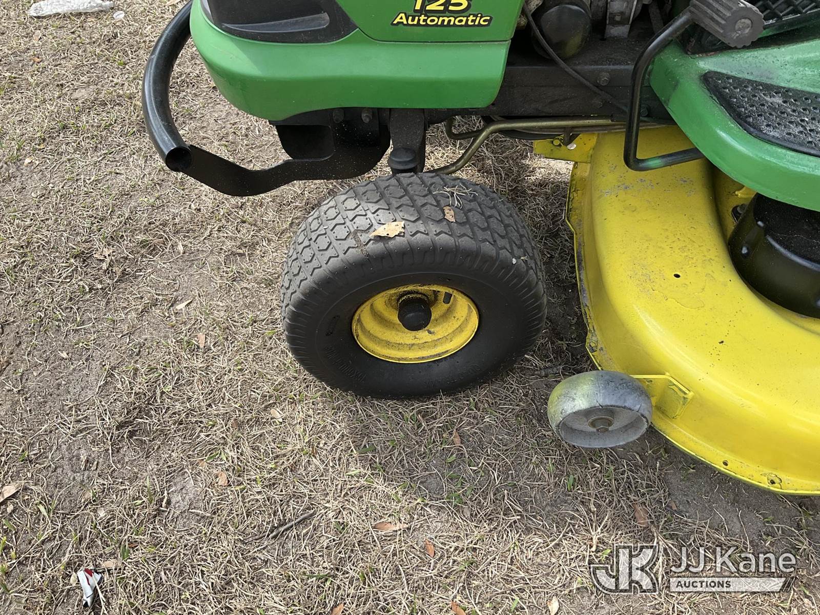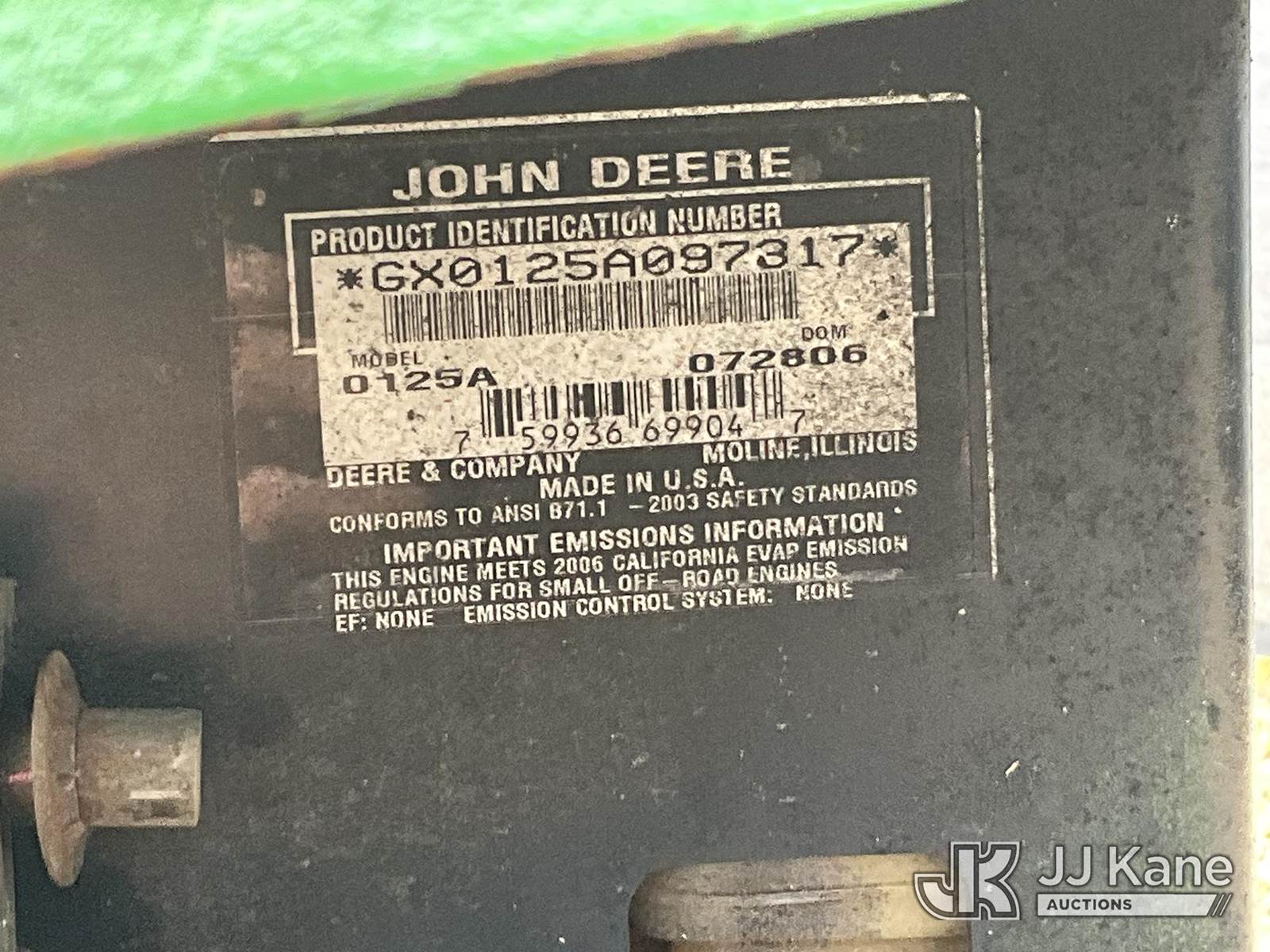 2006 John Deere 125A Lawn Tractor, s/n GX0125A097317, gas, (Runs, Moves, Operates) (Reads 689 hours) NOTE: This unit is being sold AS IS/WHERE IS via Timed Auction and is located in Thonotosassa, FL. Inspection & preview days for this unit are the 2 business days prior to the first day of items closing for this auction, item is located at 11720 N US 301 Thonotosassa, Fl 33592 and hours of operations are 8a-4p. For pre-sale questions, please contact Office Staff @ (813) 986-2485. (Buyer is responsible for removal. Assistance by consignor or JJ Kane Auctions is not assured.)