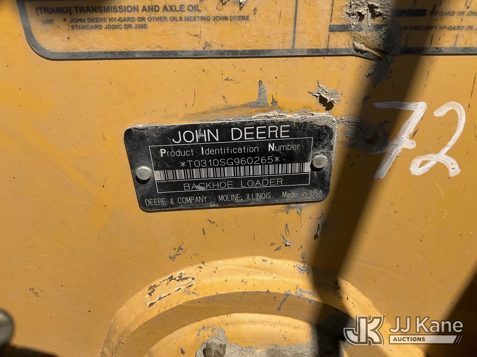2006 John Deere 310G Tractor Loader Backhoe, s/n T0310SG960265, John Deere diesel, 3-spd, with 4 in 1 bucket & ROPS, (Runs, Moves, & Operates) Per Seller Front tires need replacing, Leather seat has tears, Front grille is dented, windshield wipers don’t work, damaged dash panel) (Reads 3,765 hours) May be subject to ARB Regulations NOTE: This unit is being sold AS IS/WHERE IS via Timed Auction and is located in Jurupa Valley, CA. Inspection & preview days for this unit are the 2 business days prior to the first day of items closing for this auction, item is located at 4510 Muth Way Jurupa Valley, CA 92509 and hours of operations are 8a-4p. For pre-sale questions, please contact please contact Office Staff @ (310) 353-7140. Dealer License Number 45696. (Buyer is responsible for removal. Assistance by consignor or JJ Kane Auctions is not assured.)