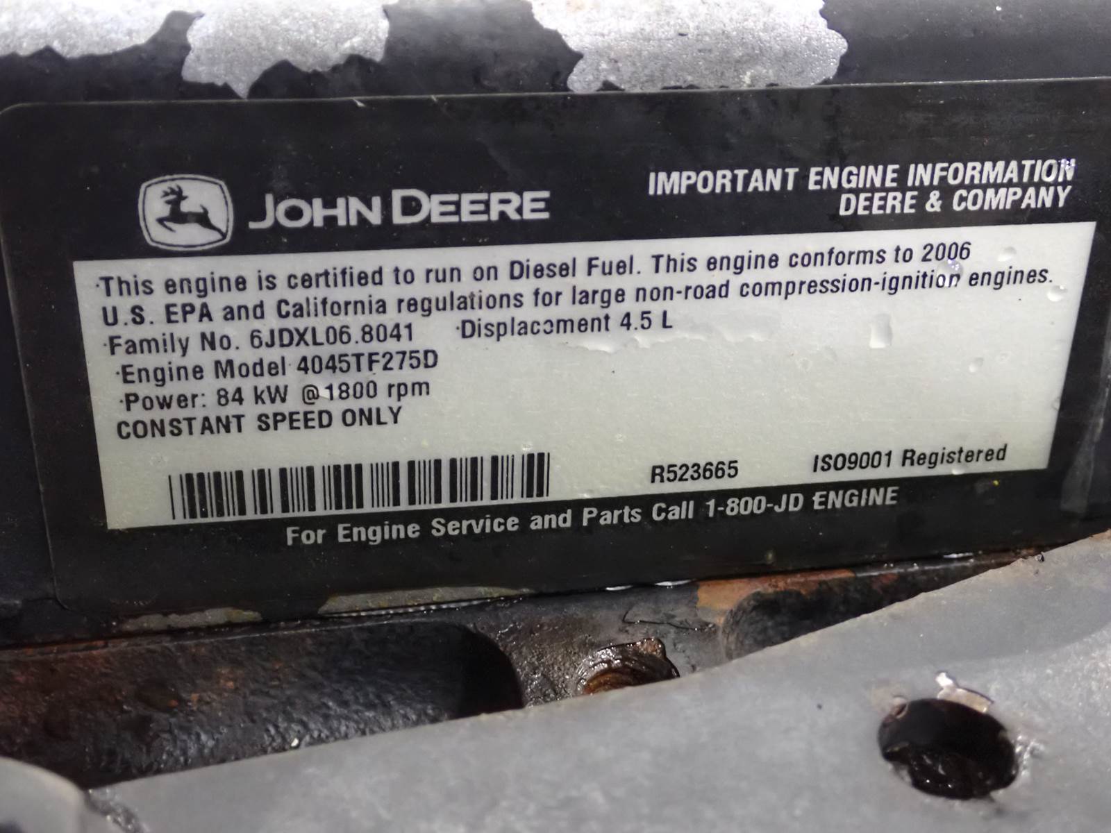 John Deere 4045TF275 diesel engine, turbocharged, mechanical fuel system w/ electronic governor, 84 KW at 1800 RPM rating, 3499 hours,...