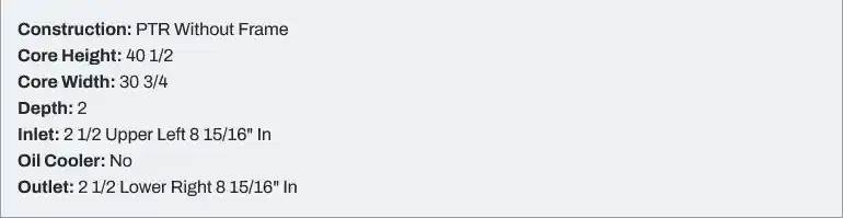 Kenworth Radiator - 40 1/2 x 30 3/4 x 2 (PTR Without Frame) Fits: 2006 & newer Kenworth T660 2008-2015 Kenworth W900 2014 Kenworth T880, Dimensions: 40 1/2 x 30 3/4 x 2 (PTR Without Frame), Engine Make: N/A, Engine Model: N/A, Material: ALUMINUM / PLASTIC