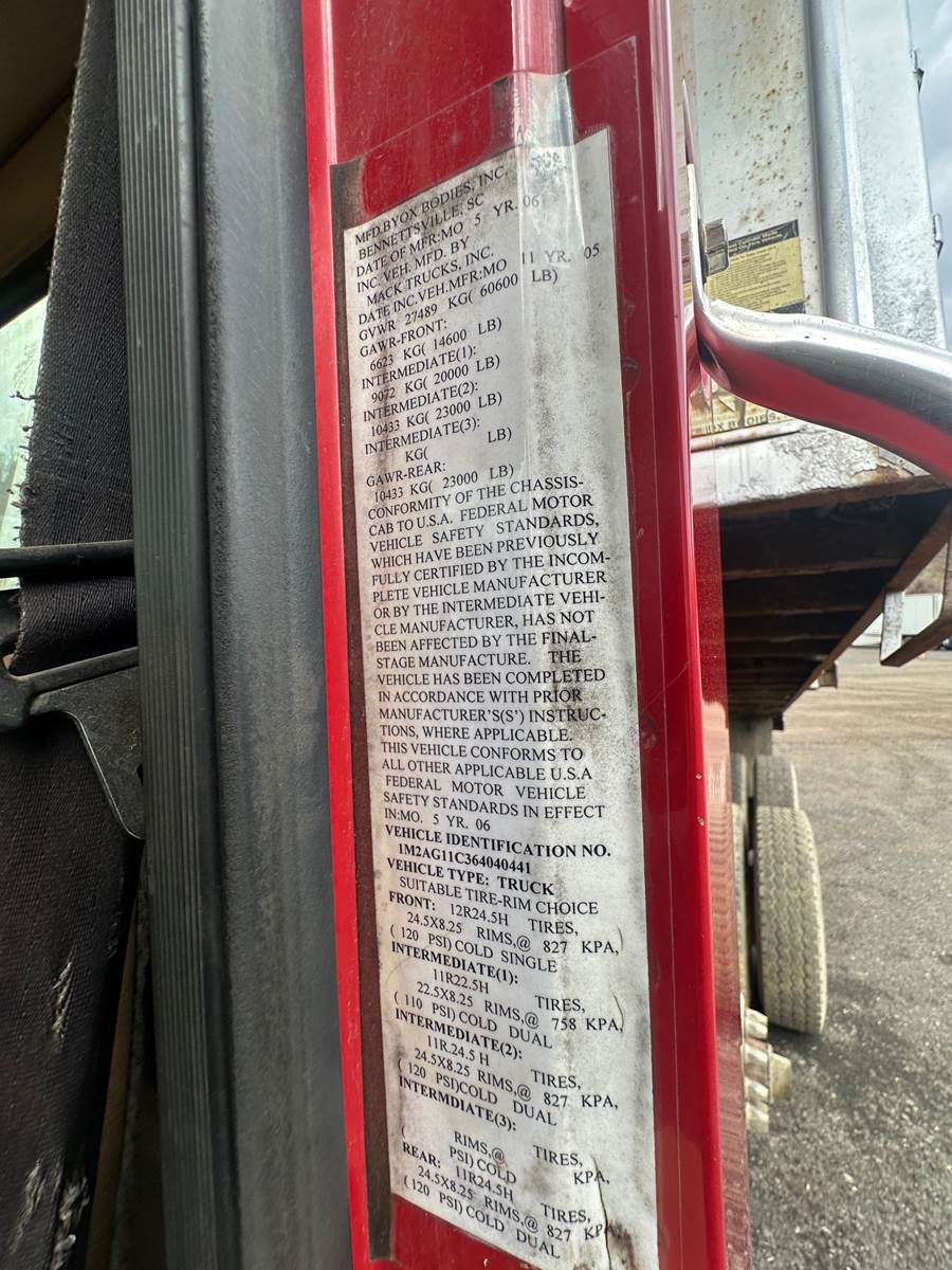 2006 Mack Granite CV713 Triaxle Dump Truck- 427 HP Mack Diesel, 10-Spd Manual Trans, Front Axle Rating- 14,600, Non-Steer Lift Axle- 20K, Rears- 46K Axle Rating, 17'5" Steel Ox Body, Camelback Suspension, Pintle, Air/Electric to Rear, CALL FOR VIDEOS!!!!
