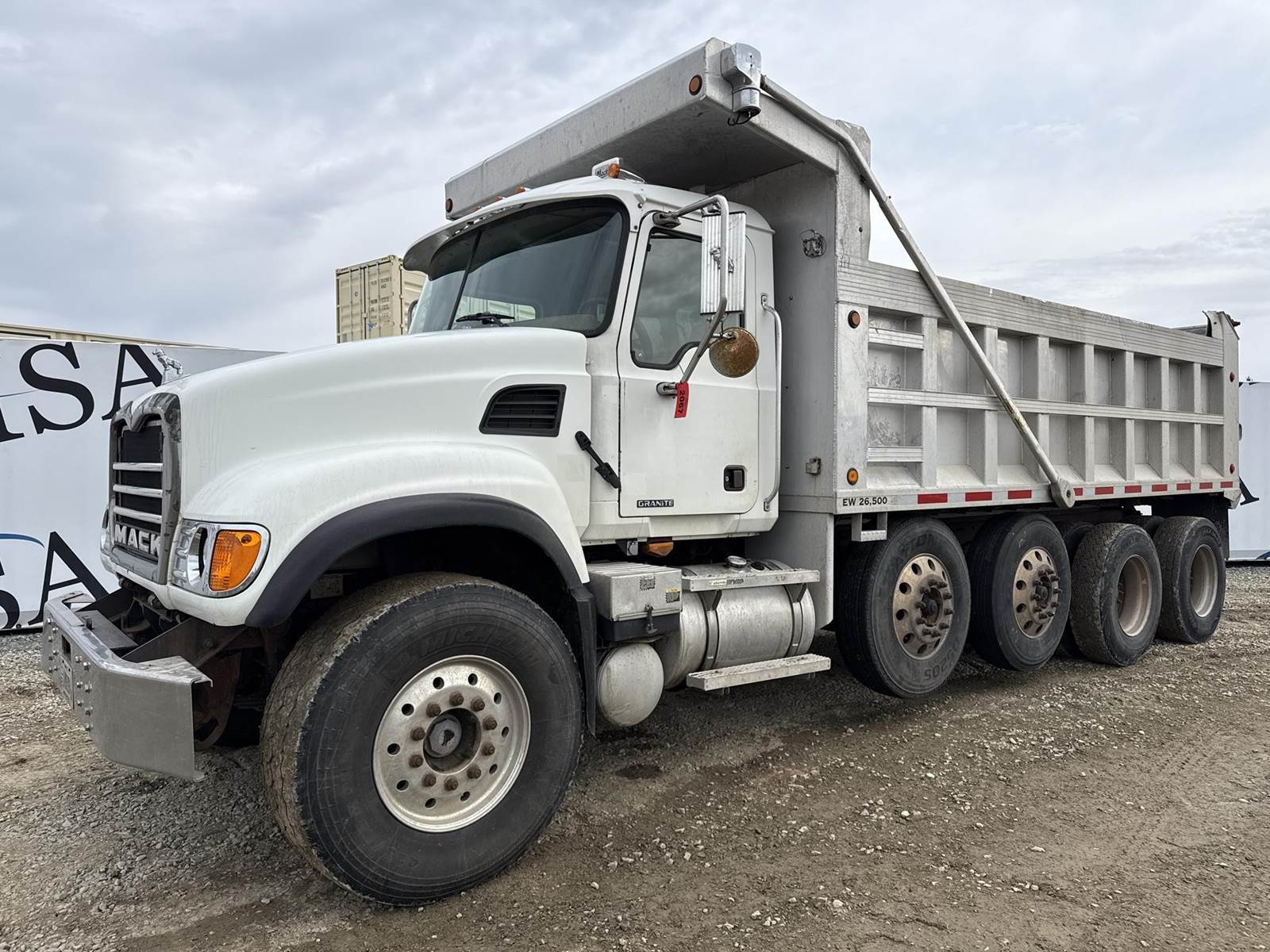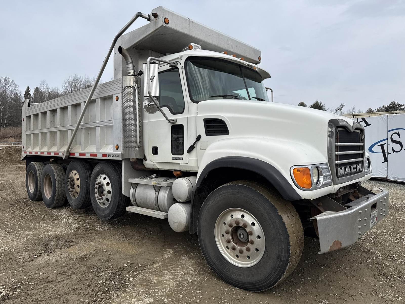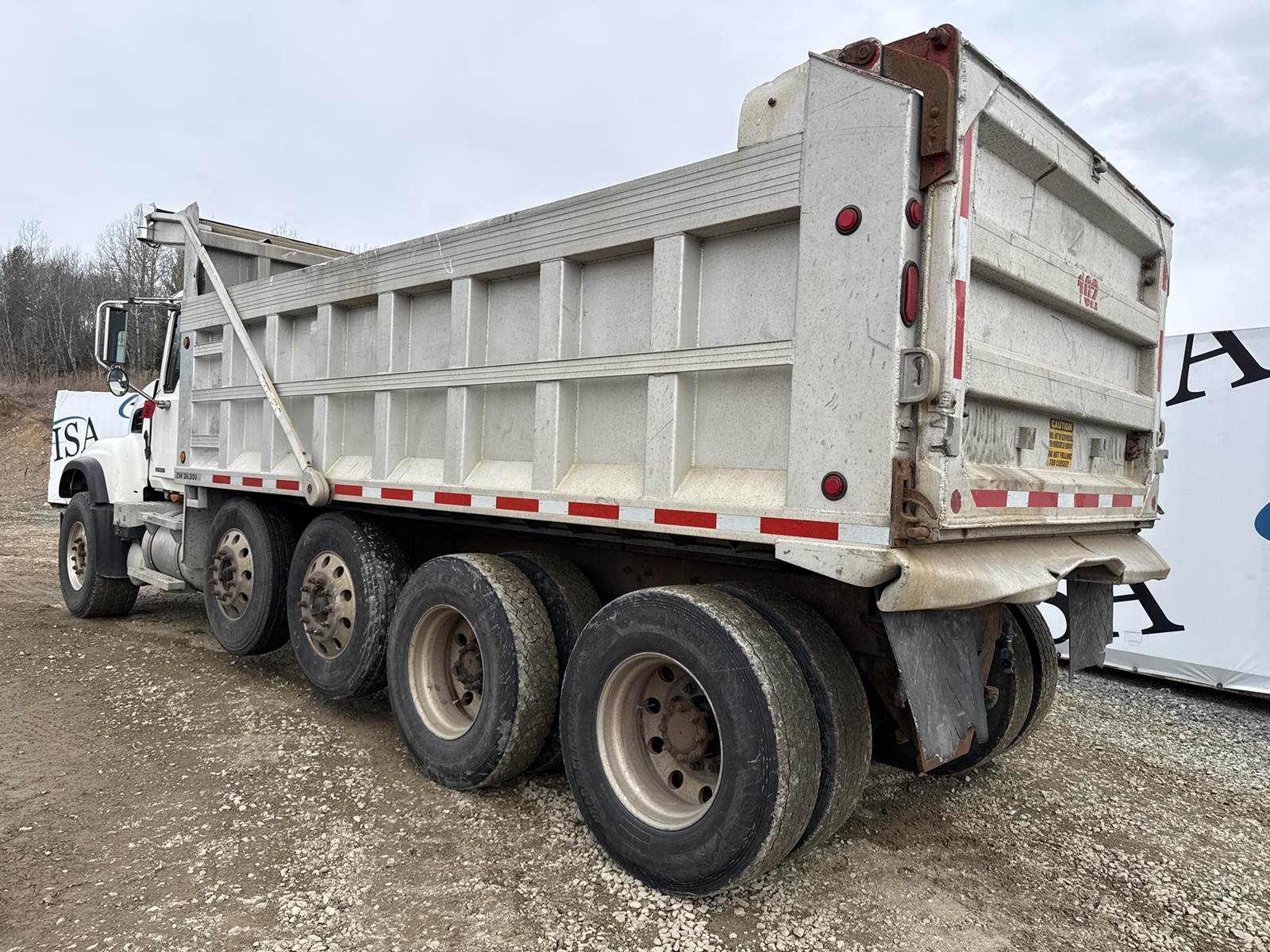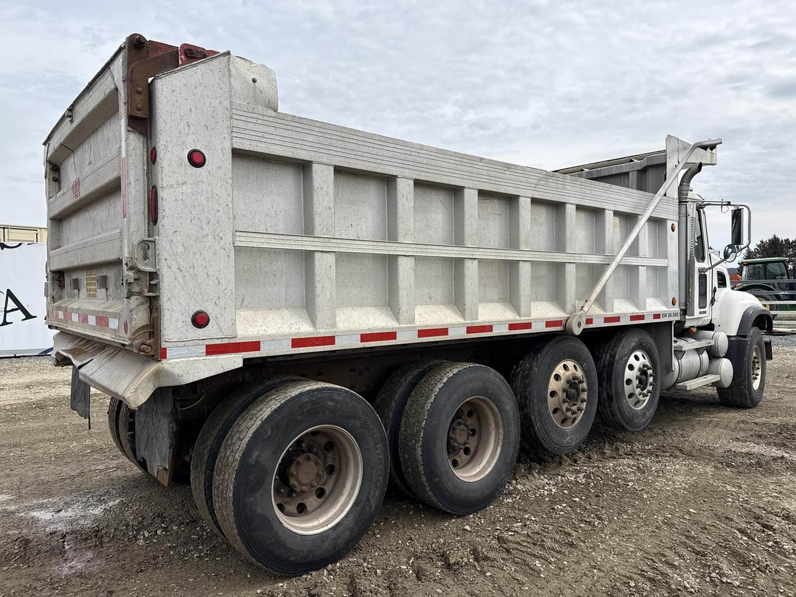 6 Cylinder Mack Turbo Diesel Engine, Maxitorque 10 Speed, Multi-Speed Reverse Manual Transmission, Camelback Suspension, Engine Brake, Inter Axle Lock, PTO, Approx 18' Dump Box, Air Trip Tailgate, Tarper, Steerable Air Lift Pusher Axles, Pintle Hitch W/ Air to the Rear, Air Ride Drivers Seat, Heat, A/C, Radio, Cruise Control, Full Aluminum Rims, 425/65R22.5 Front Tires, 11R22.5 Pushers and Drive Tires