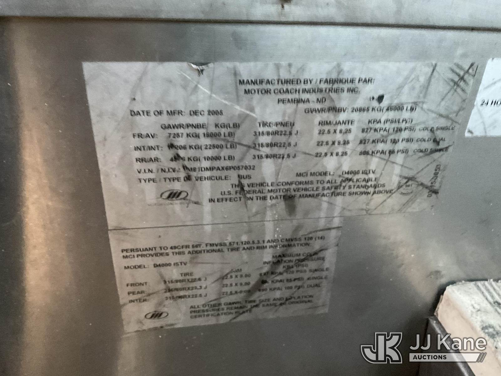 2006 MCI D4000-ISTV Bus, s/n 1M81DMPAX6P057032, 12.7L L6 DIESEL Auto, True Mileage Unknown (Not Running, Condition Unknown) (Stripped of Parts, Broken Ignition) (Branded Title - Police Vehicle) (Bidding Restricted to Licensed Vehicle Dealers Only), Subject to CARB Regs,CARB non Compliant,Cannot Operate on CA Roads/Highways until Compliant This is a Titled Item NOTE: This unit is being sold AS IS/WHERE IS via Timed Auction and is located in Jurupa Valley, CA. Inspection & preview days for this unit are the 2 business days prior to the first day of items closing for this auction, item is located at 4510 Muth Way Jurupa Valley, CA 92509 and hours of operations are 8a-4p. For pre-sale questions, please contact please contact Office Staff @ (310) 353-7140. Dealer License Number 45696. (Buyer is responsible for removal. Assistance by consignor or JJ Kane Auctions is not assured.)
