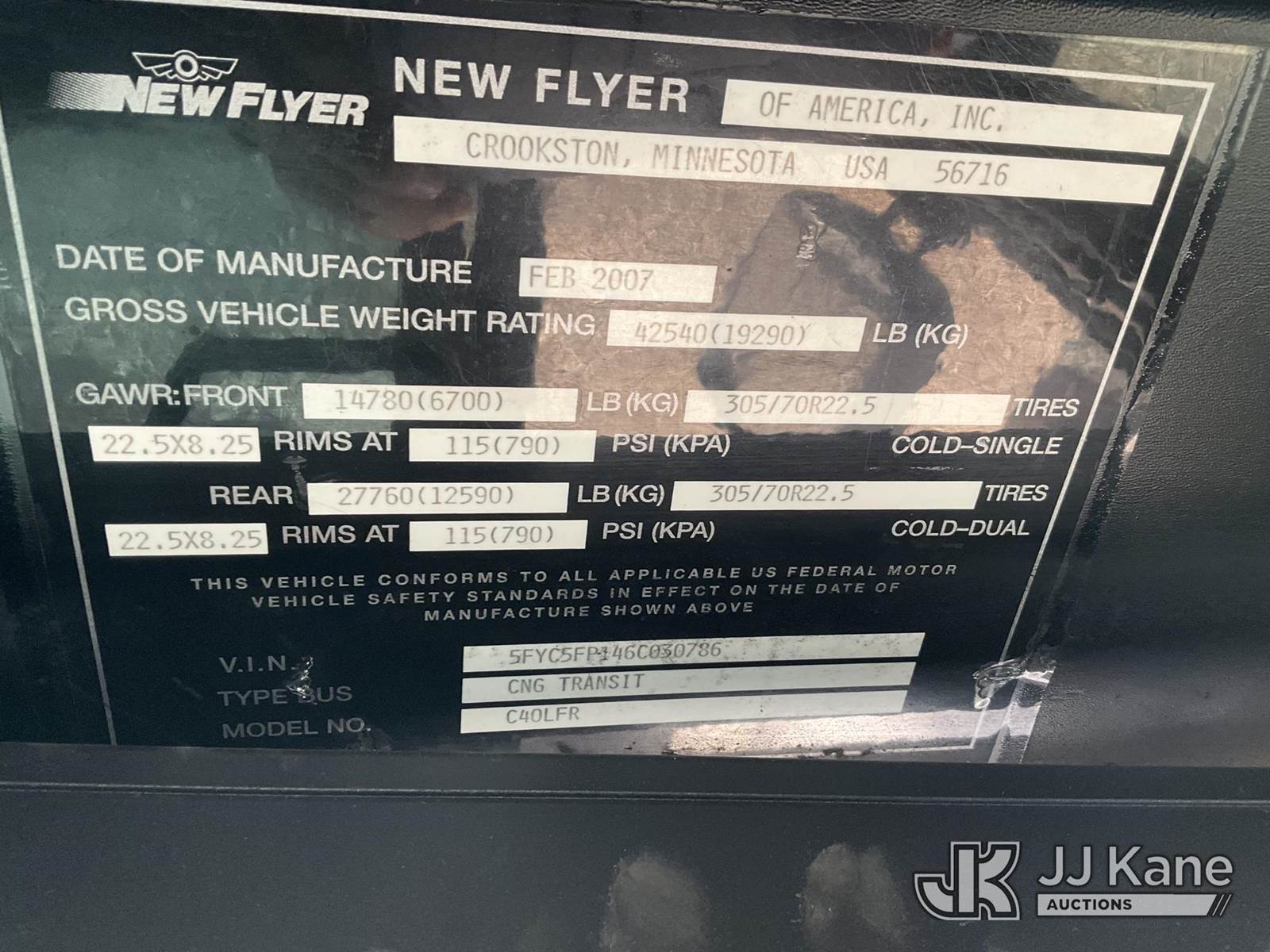 2006 New Flyer C40LFR Passenger Bus, s/n 5FYC5FP146C030786, Cummins CNG Only, Auto, with Aluminum Wheels , (Exempt from Odometer Disclosure - Reads 26,151 miles) (Runs & Moves Cng Tanks Exp Date 2026) (Bidding Restricted to Licensed Vehicle Dealers Only), This is a Titled Item NOTE: This unit is being sold AS IS/WHERE IS via Timed Auction and is located in Jurupa Valley, CA. Inspection & preview days for this unit are the 2 business days prior to the first day of items closing for this auction, item is located at 4510 Muth Way Jurupa Valley, CA 92509 and hours of operations are 8a-4p. For pre-sale questions, please contact please contact Office Staff @ (310) 353-7140. Dealer License Number 45696. (Buyer is responsible for removal. Assistance by consignor or JJ Kane Auctions is not assured.)