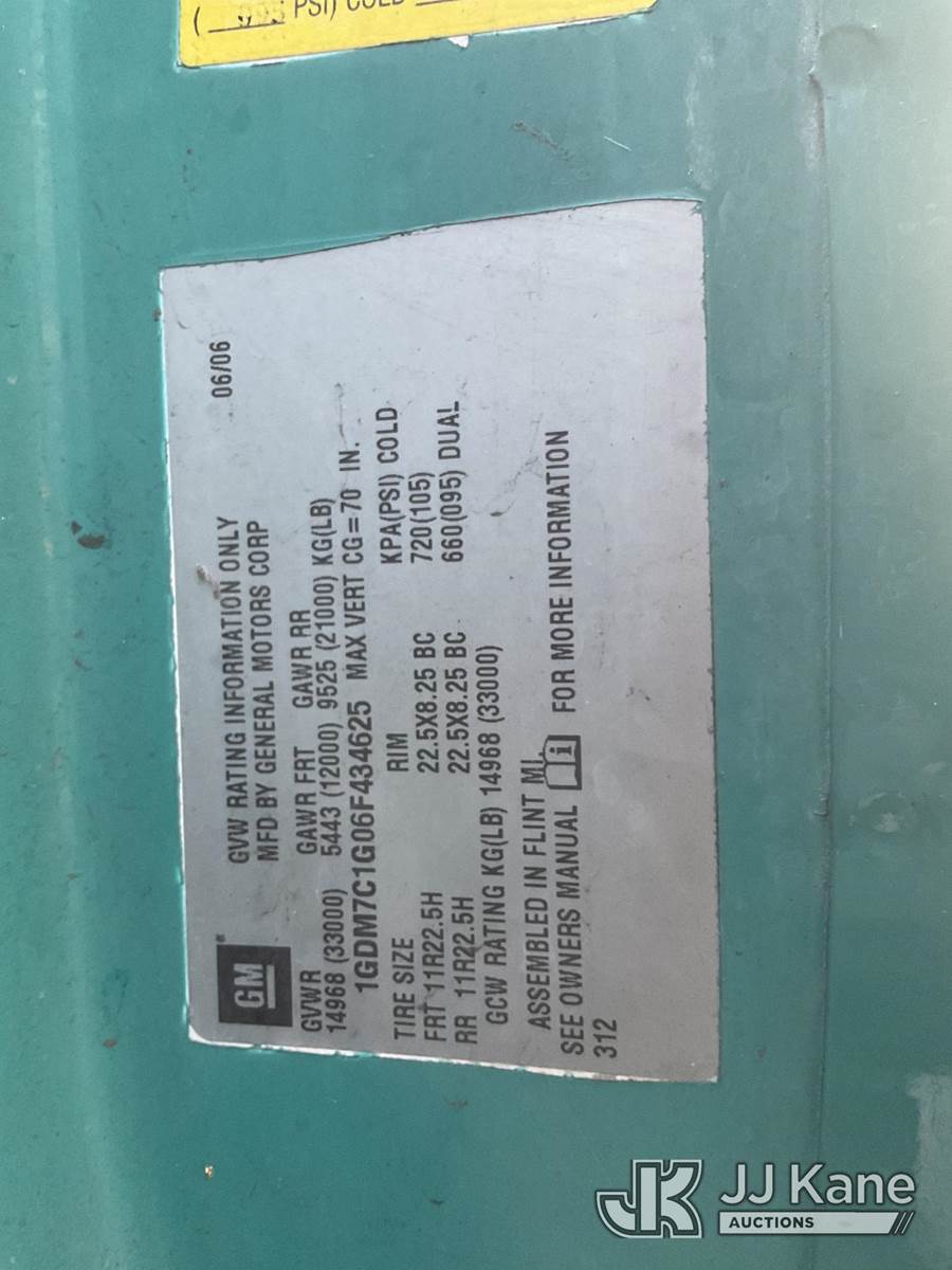 Peterson TL3, 7,100 Lb Hydraulic Crane s/n 0906-2091, mounted behind cab on 2006 GMC C7500 Dump Truck, s/n 1GDM7C1G06F434625, 8.1L V8 OHV 16V Gas, 4X2, Auto, with Aluminum Wheels , (Exempt from Odometer Disclosure - Reads 26,001 miles) (Not Running, Condition Unknown) (Upper Condition Unknown, Dump Condition Unknown) (Stripped Of Parts, Engine Stripped Of Parts, Do Not Turn On Leaking Gas,) (Bidding Restricted to Licensed Vehicle Dealers Only), This is a Titled Item NOTE: This unit is being sold AS IS/WHERE IS via Timed Auction and is located in Jurupa Valley, CA. Inspection & preview days for this unit are the 2 business days prior to the first day of items closing for this auction, item is located at 4510 Muth Way Jurupa Valley, CA 92509 and hours of operations are 8a-4p. For pre-sale questions, please contact please contact Office Staff @ (310) 353-7140. Dealer License Number 45696. (Buyer is responsible for removal. Assistance by consignor or JJ Kane Auctions is not assured.)