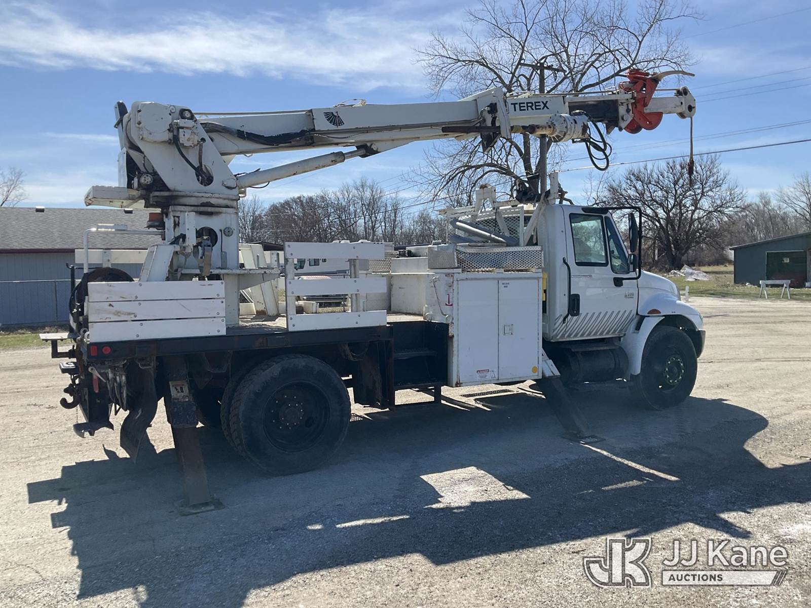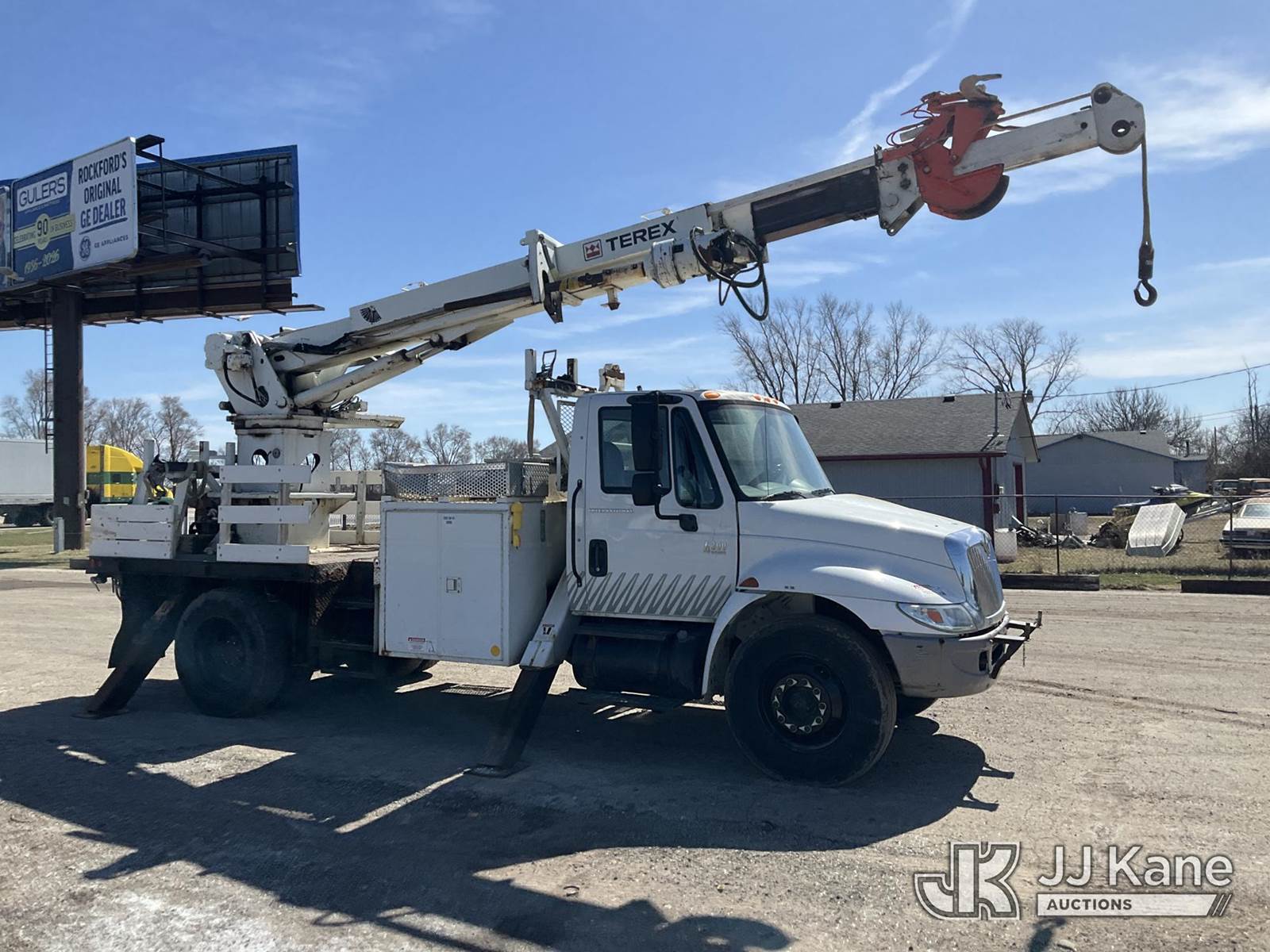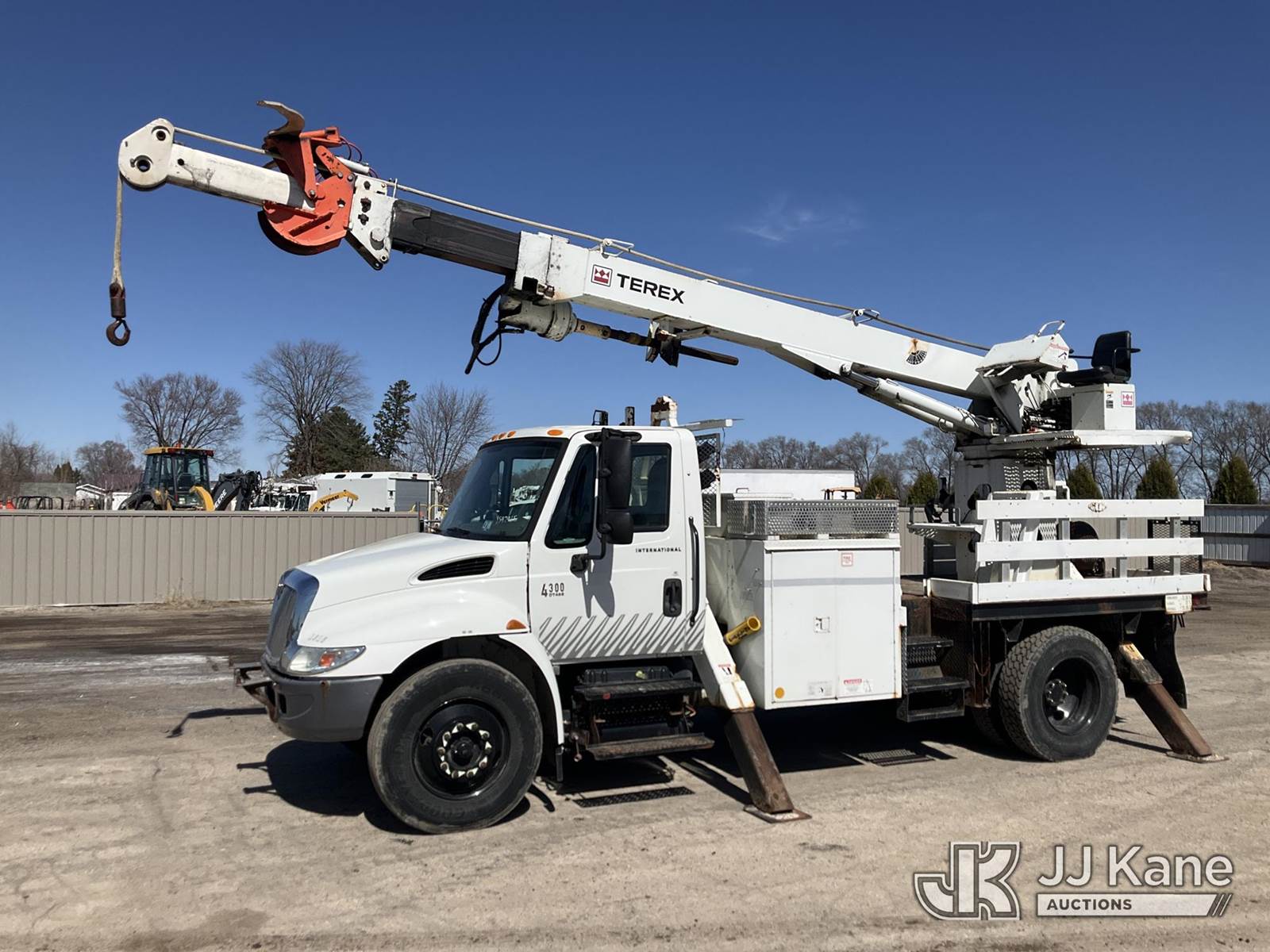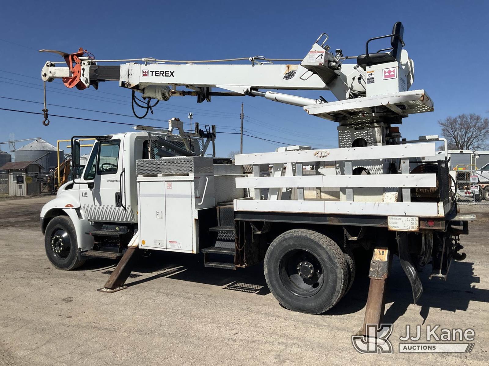 Terex/Telelect Commander 4045, 25,930 Lb Digger Derrick s/n 2051028361, with 45ft. sheave height, 2-spd digger, pole guides, heel winch & riding console, rear mounted on 2006 International 4300 Flatbed Truck, 7.6L diesel, 4X2, Auto, A/C, (Exempt from Odometer Disclosure - Reads 133,619 miles) (Runs, Moves & Upper Operates)(Pole Grab Does Not Tilt) (Reads 9,216 hours) This is a Titled Item NOTE: This unit is being sold AS IS/WHERE IS via Timed Auction and is located in South Beloit, IL. Inspection & preview days for this unit are the 2 business days prior to the first day of items closing for this auction, item is located at 14354 Dearborn Ave South Beloit, IL and hours of operations are 8a-4p. For pre-sale questions, please contact Derek Eklund at (608) 904-0618 or (derek.eklund@jjkane.com). (Missing manuals, See Auction Company for Manufacturers Information to obtain manuals) (Buyer is responsible for removal. Assistance by consignor or JJ Kane Auctions is not assured.)