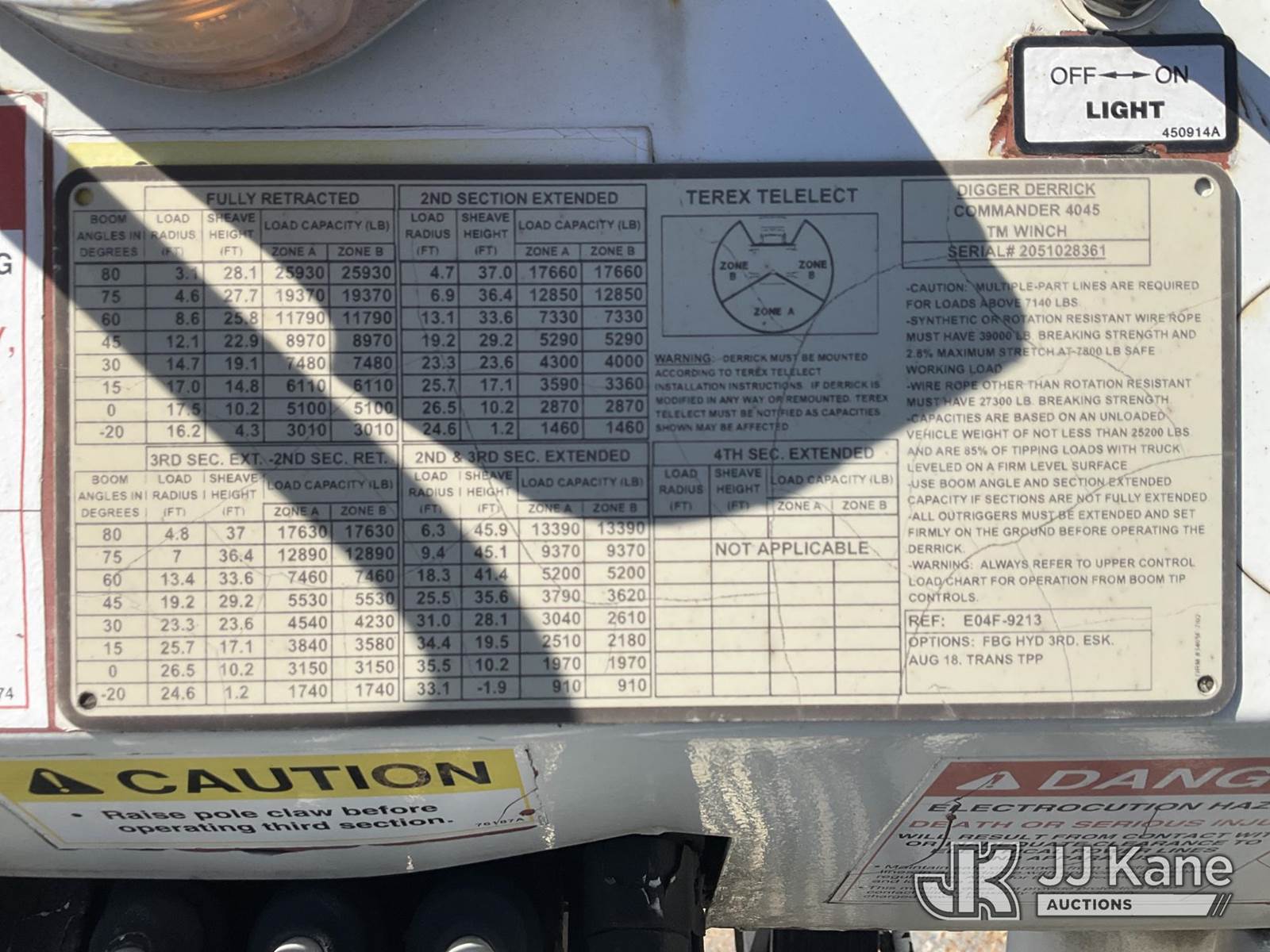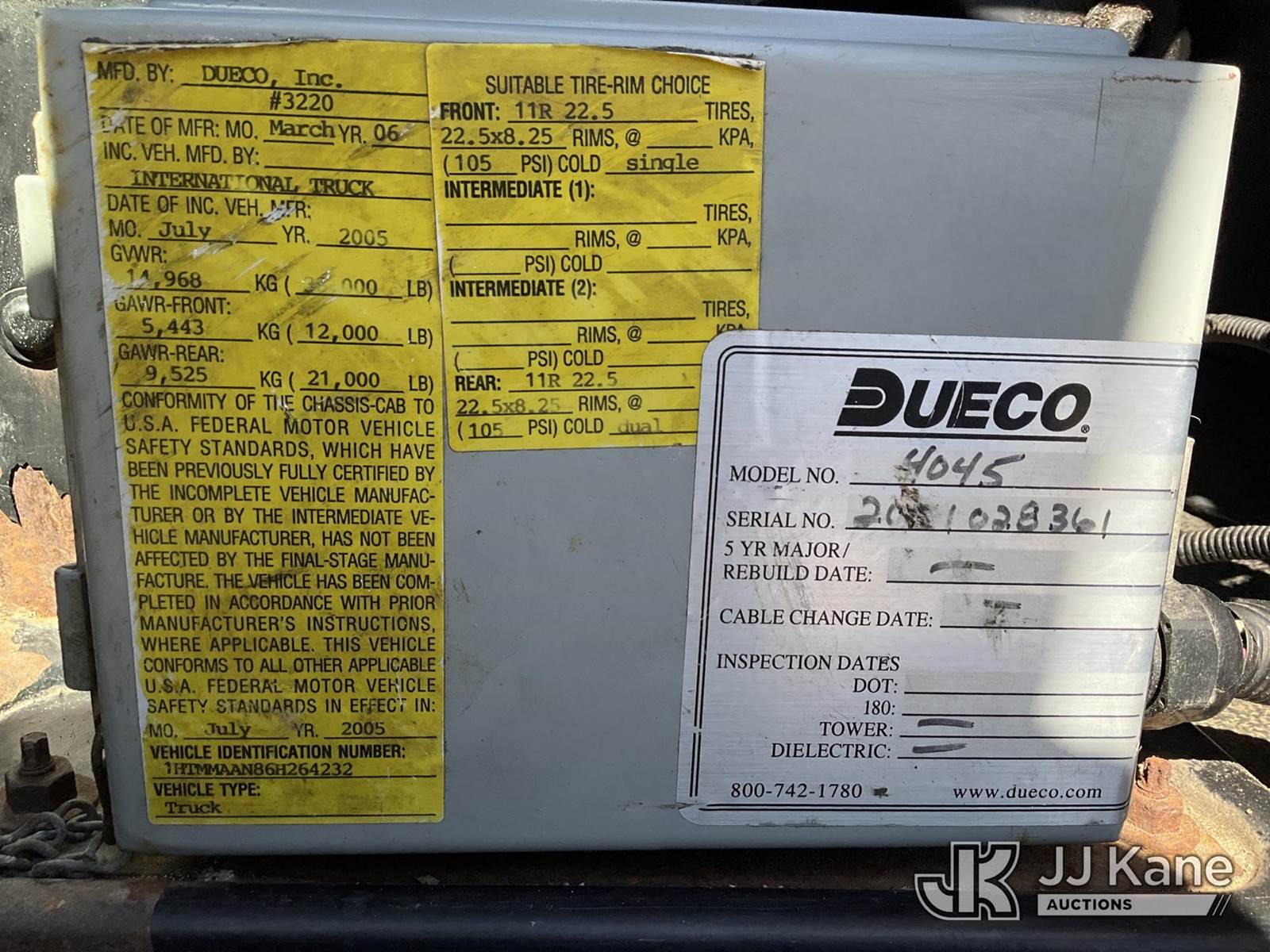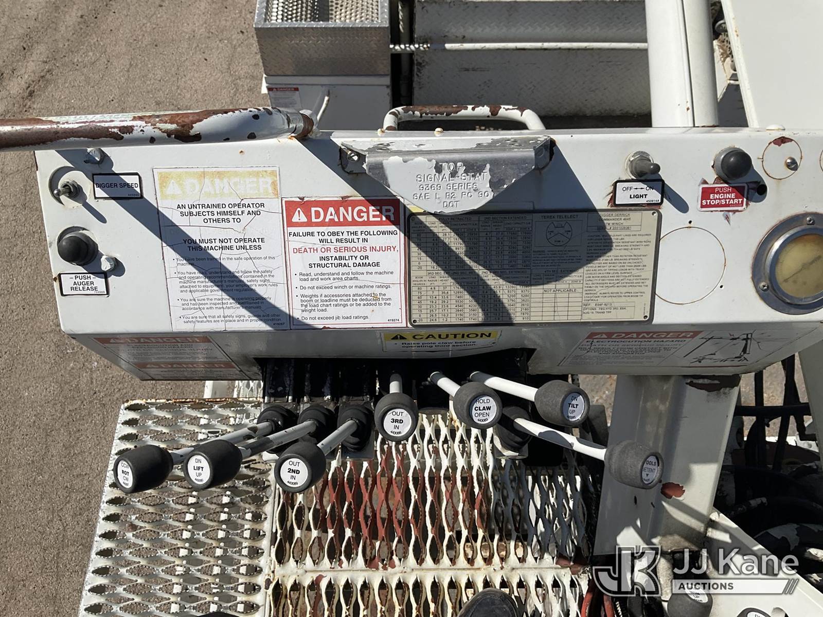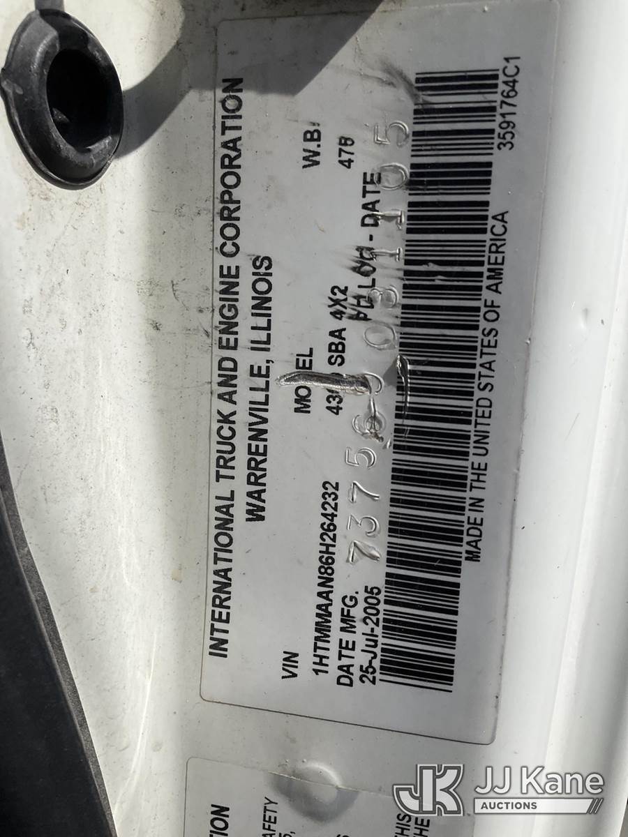 Terex/Telelect Commander 4045, 25,930 Lb Digger Derrick s/n 2051028361, with 45ft. sheave height, 2-spd digger, pole guides, heel winch & riding console, rear mounted on 2006 International 4300 Flatbed Truck, 7.6L diesel, 4X2, Auto, A/C, (Exempt from Odometer Disclosure - Reads 133,619 miles) (Runs, Moves & Upper Operates)(Pole Grab Does Not Tilt) (Reads 9,216 hours) This is a Titled Item NOTE: This unit is being sold AS IS/WHERE IS via Timed Auction and is located in South Beloit, IL. Inspection & preview days for this unit are the 2 business days prior to the first day of items closing for this auction, item is located at 14354 Dearborn Ave South Beloit, IL and hours of operations are 8a-4p. For pre-sale questions, please contact Derek Eklund at (608) 904-0618 or (derek.eklund@jjkane.com). (Missing manuals, See Auction Company for Manufacturers Information to obtain manuals) (Buyer is responsible for removal. Assistance by consignor or JJ Kane Auctions is not assured.)