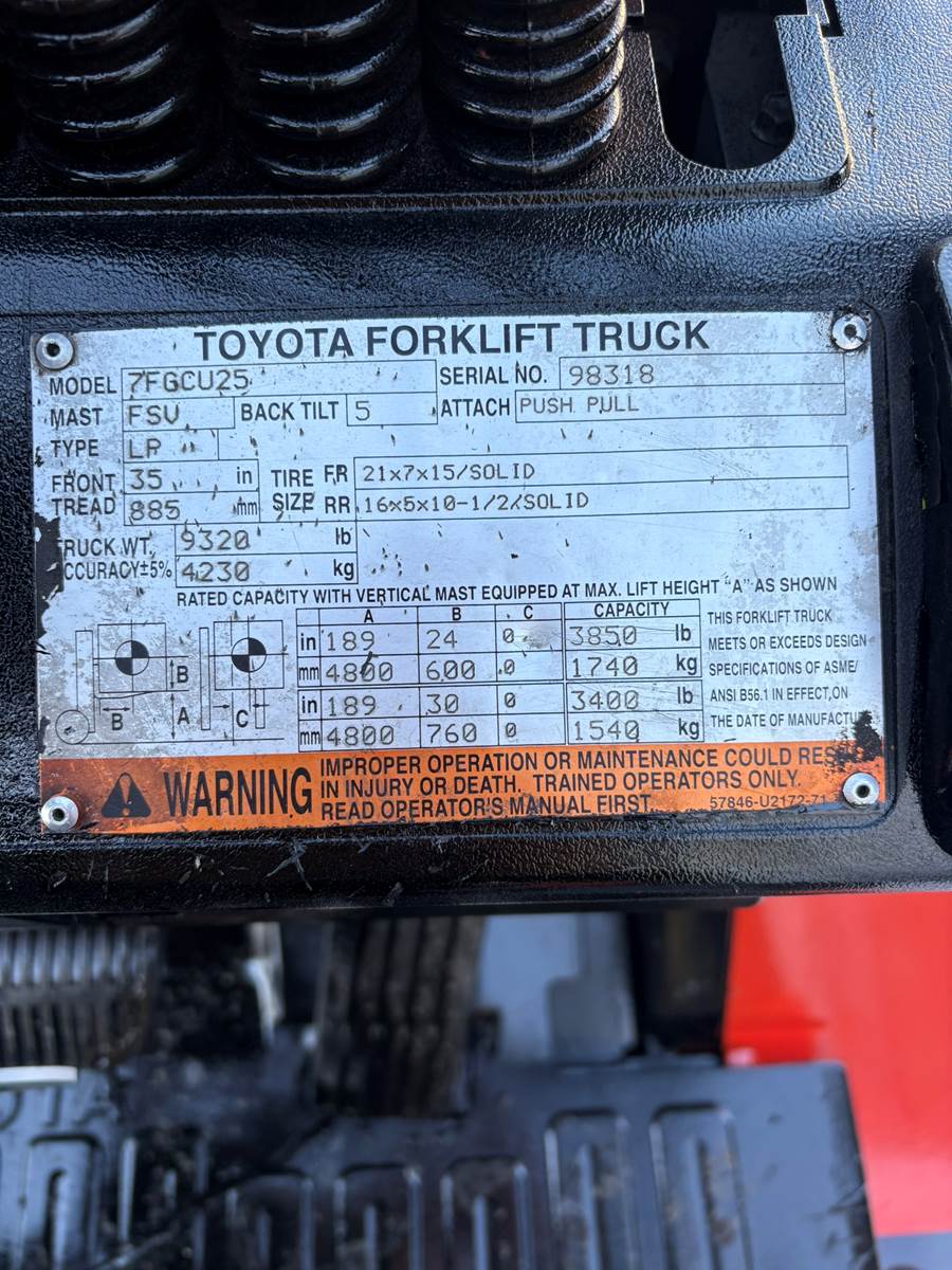 YEAR: 2000, MAKE: TOYOTA, MODEL: 42-6FGCU25, S/N: 78887, CAPACITY: 5000, HOURS: 8181, CUSHION TIRES, LIFT HEIGHT: 80", 42" CLASS II...
