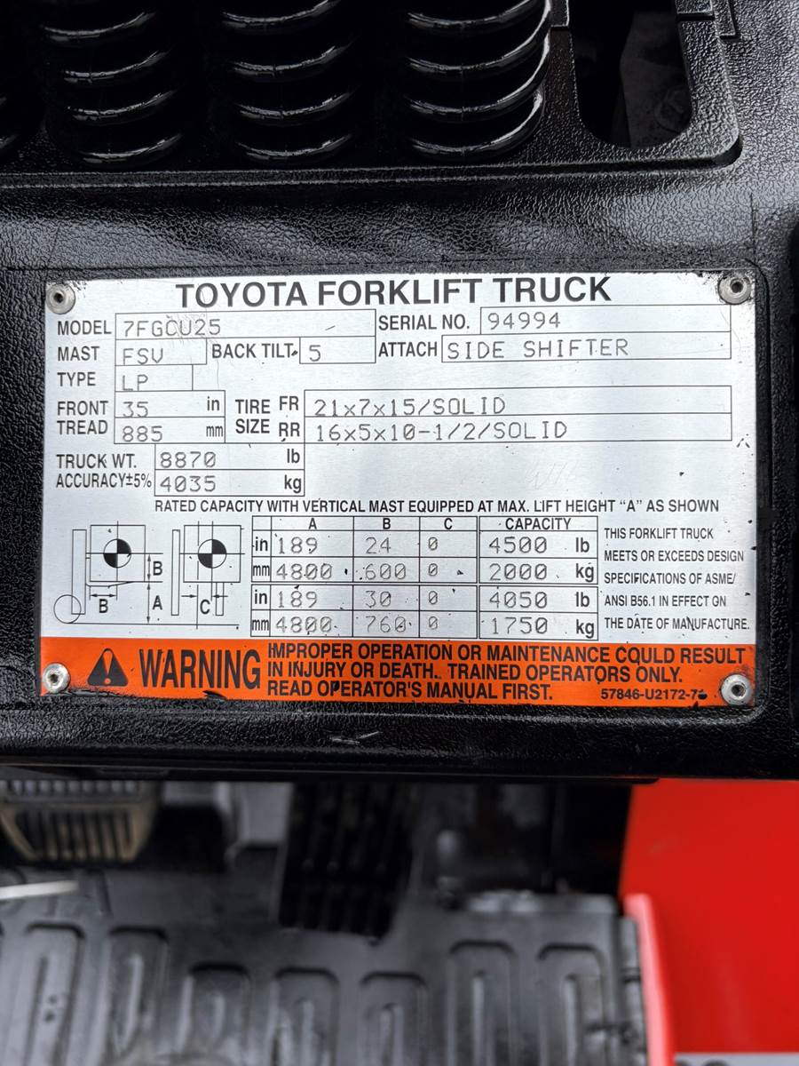 YEAR: 2005, MAKE: TOYOTA, MODEL: 7FGCU25, S/N: 95837, CAPACITY: 5000, HOURS: 8968, CUSHION TIRES, LIFT HEIGHT: 189", 42" CLASS II...