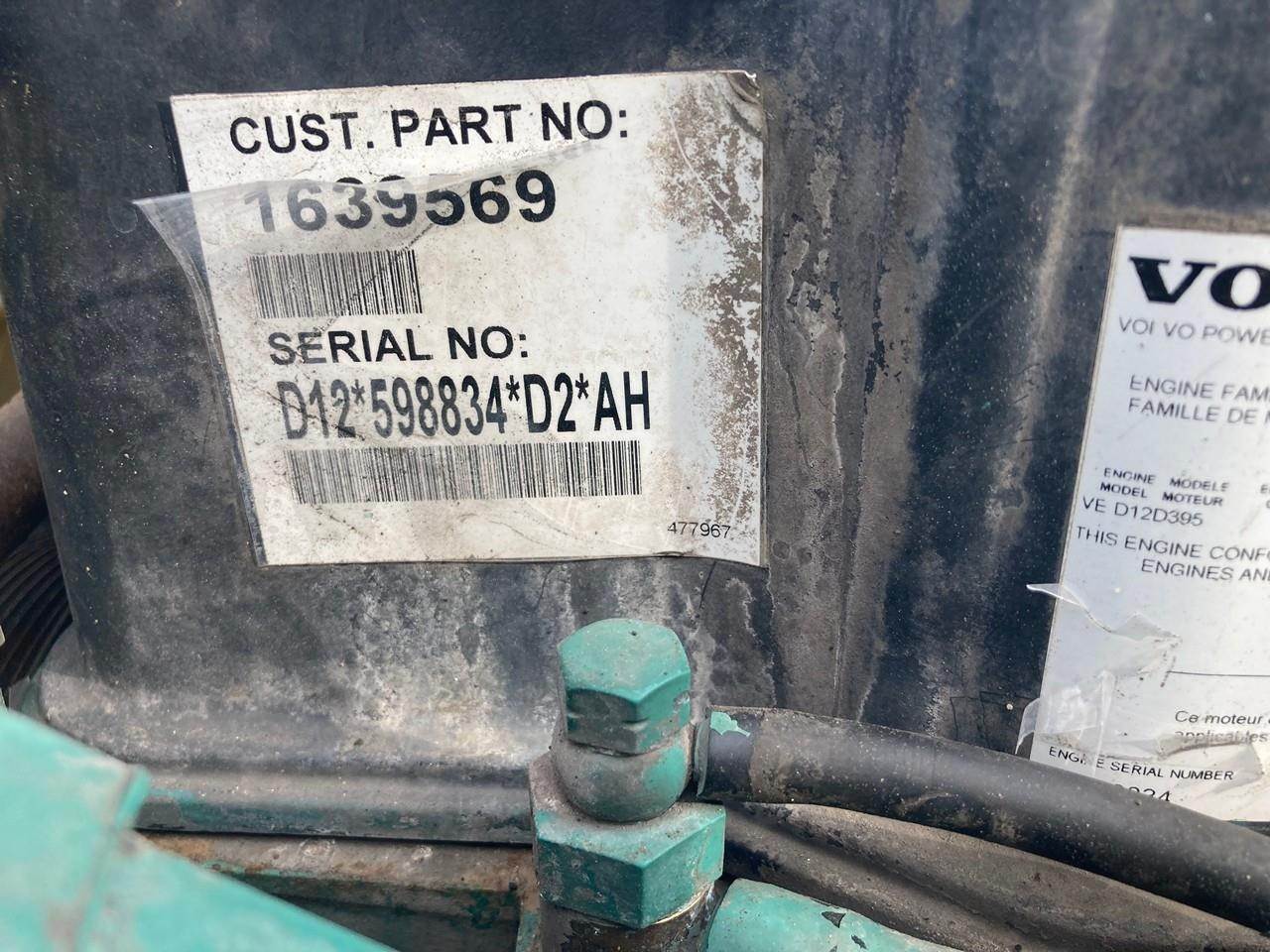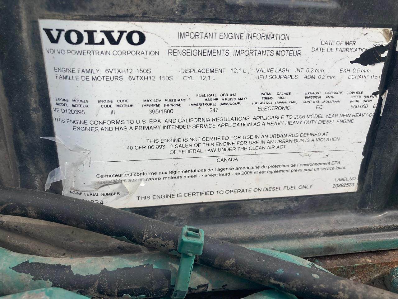 LOW MILEAGE 2006 VOLVO VED12D 395HP DIESEL TAKEOUT ENGINE FOR SALE at ADELMAN’S TRUCK PARTS in CANTON, OHIO. 95,361 MILES SHOWING ON ECM, GOOD USED, COMPLETE and RUN TESTED, ELECTRONIC w/ECM, MODEL VED12D395, EGR EMISSIONS (EPA04), with 6VTXH12.150S FAMILY #, and 60+ LBS OIL PRESSURE. VOCATIONAL APPLICATION.