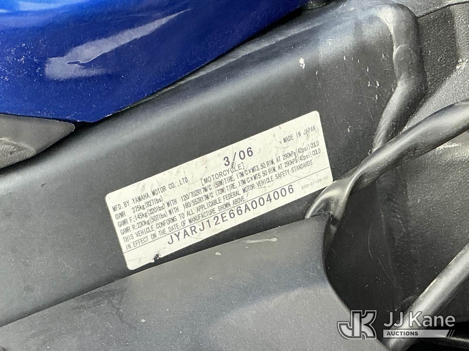 2006 Yamaha YZF-R6 Motorcycle, gas, manual, True Mileage Unknown (Not Running, Condition Unknown) (No Key, Paint & Body Damage) (FL Residents Purchasing Titled Items - tax, title & registration fees will be collected at the maximum rate of $400.00 under 25,999 and $800.00 for Over 26,000 and $250.00 trailers - Proof of insurance is mandatory; Out of State Residents Purchasing Title Items - tax will be collected based upon your state rate.) This is a Titled Item NOTE: This unit is being sold AS IS/WHERE IS via Timed Auction and is located in Thonotosassa, FL. Inspection & preview days for this unit are the 2 business days prior to the first day of items closing for this auction, item is located at 11720 N US 301 Thonotosassa, Fl 33592 and hours of operations are 8a-4p. For pre-sale questions, please contact Office Staff @ (813) 986-2485. (Buyer is responsible for removal. Assistance by consignor or JJ Kane Auctions is not assured.)
