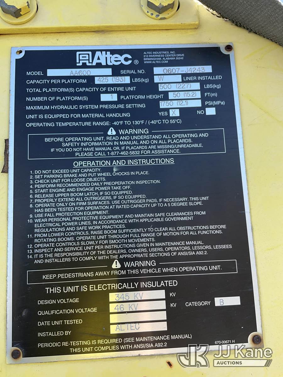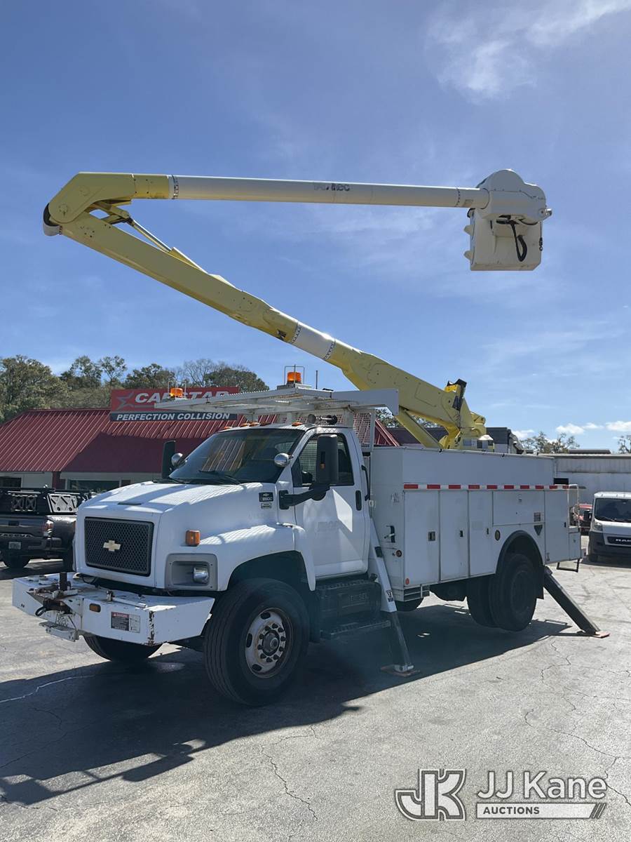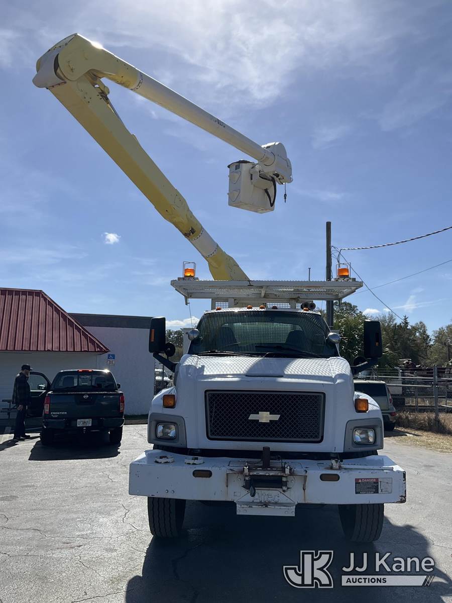 Altec AA600-MH, 55 ft, Material Handling Bucket Truck s/n 0607-J4243, with two-man bucket, rear mounted on 2007 Chevrolet C8500 Utility Truck, Isuzu 7.8L diesel, 4X2, Auto, A/C, with front winch, (68,536 miles) (Runs, Moves & Upper Operates) (Body/Paint Damage) This is a Titled Item NOTE: This unit is being sold AS IS/WHERE IS via Timed Auction and is located in Ocala, FL. For more information & removal arrangements please contact Mike Lessard @ 352-629-6677. (Manuals provided in cab) (Buyer is responsible for removal. Assistance by consignor or JJ Kane Auctions is not assured.)