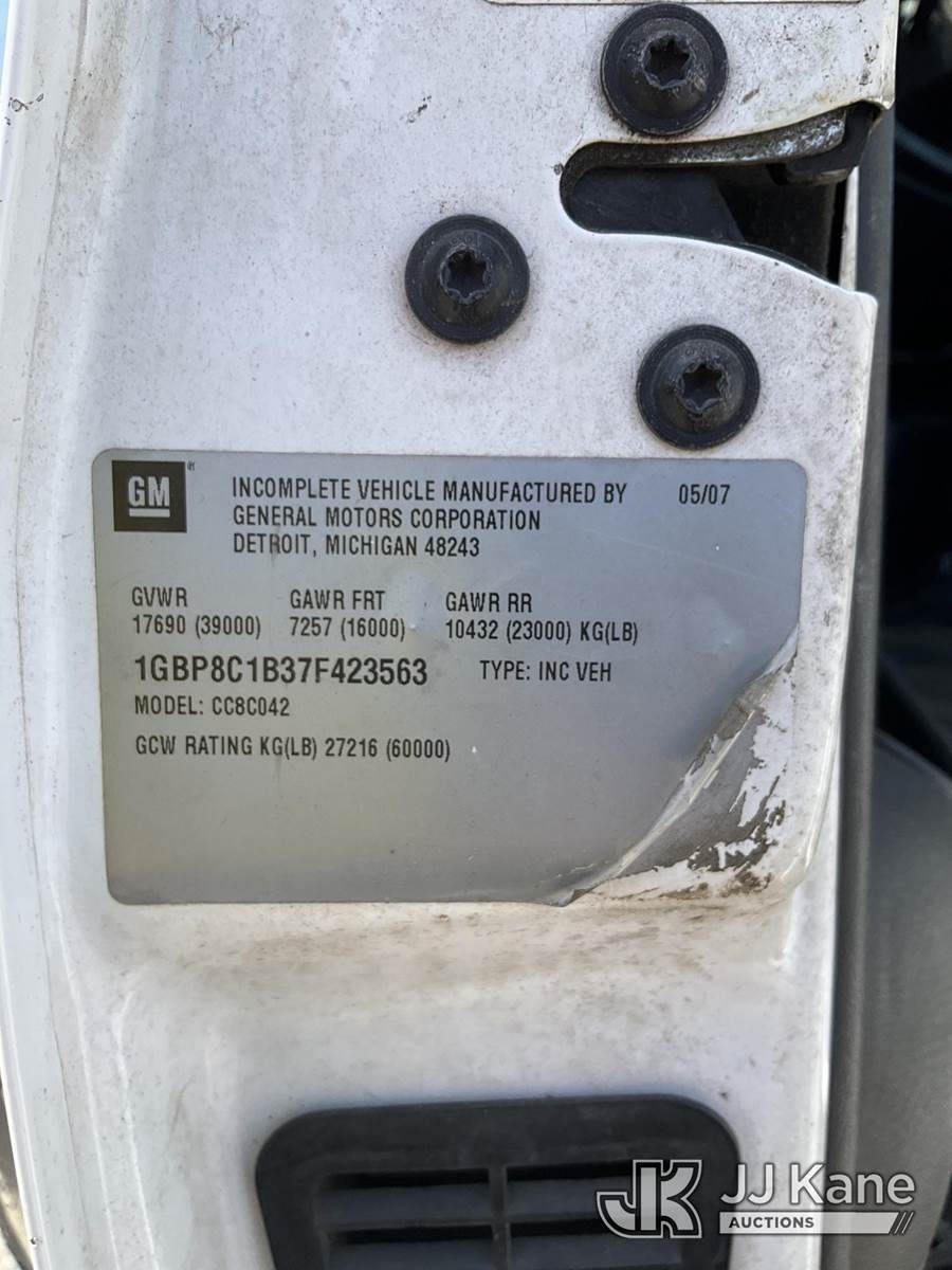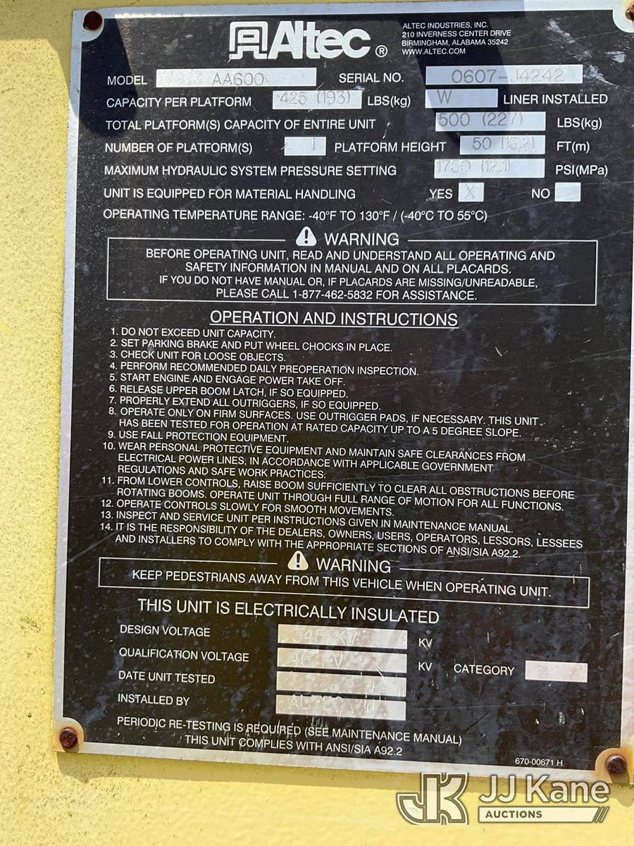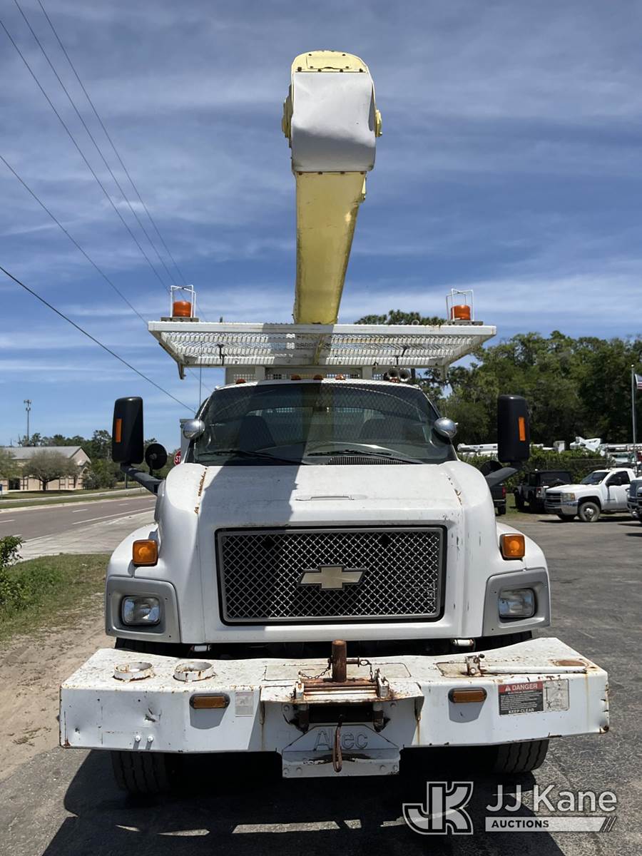 Altec AA600-MH, 55 ft, Material Handling Bucket Truck s/n 0607-J4242, with two-man bucket & 4 hyd outriggers, rear mounted on 2007 Chevrolet C8500 Utility Truck, Isuzu 7.8L 4X2, diesel, Auto, A/C, with front winch, (90,328 miles) (Runs, Will Move, Transmission Is Not Shifting Right) (Seller States: Upper Unit Is Disabled For Safety Reasons, Boom Leveling Cables Are Out Of Date, Missing Manual Tilt Safety Pin, Boom Has Been Disabled At Batteries, Truck ECM Is Bad Most Dash Functions Do Not Work, Check Engine Light Is) (Bidding Restricted to Licensed Vehicle Dealers Only), This is a Titled Item NOTE: This unit is being sold AS IS/WHERE IS via Timed Auction and is located in Ocala, FL. Inspection & preview days for this unit are by appointment only; please contact us at contact@jjkane.com or 84-Go-JJKane for more details. For more information & removal arrangements please contact Mike Lessard @ (352) 629-6677. (Missing manuals, See Auction Company for Manufacturers Information to obtain manuals) (Buyer is responsible for removal. Assistance by consignor or JJ Kane Auctions is not assured.)