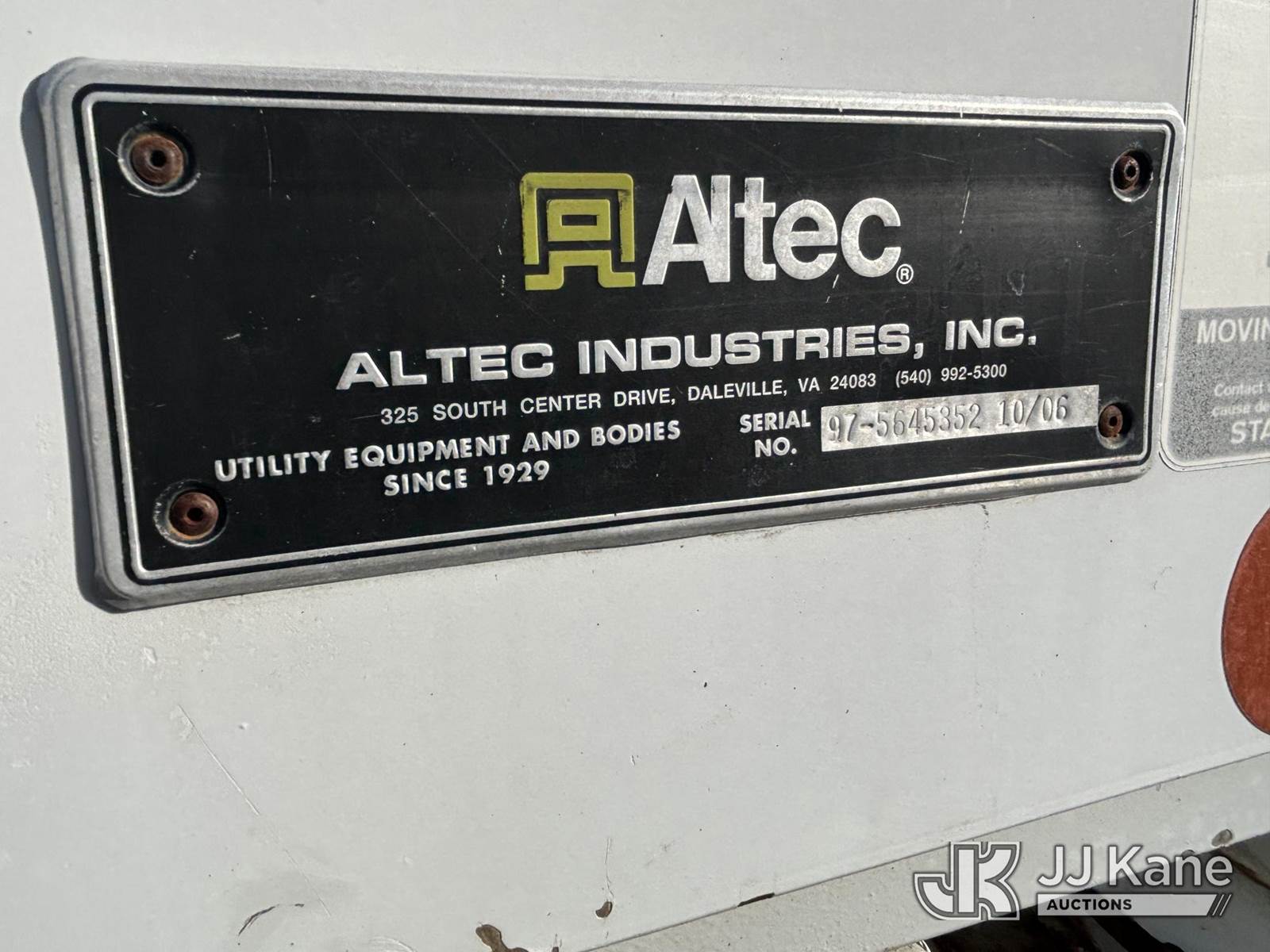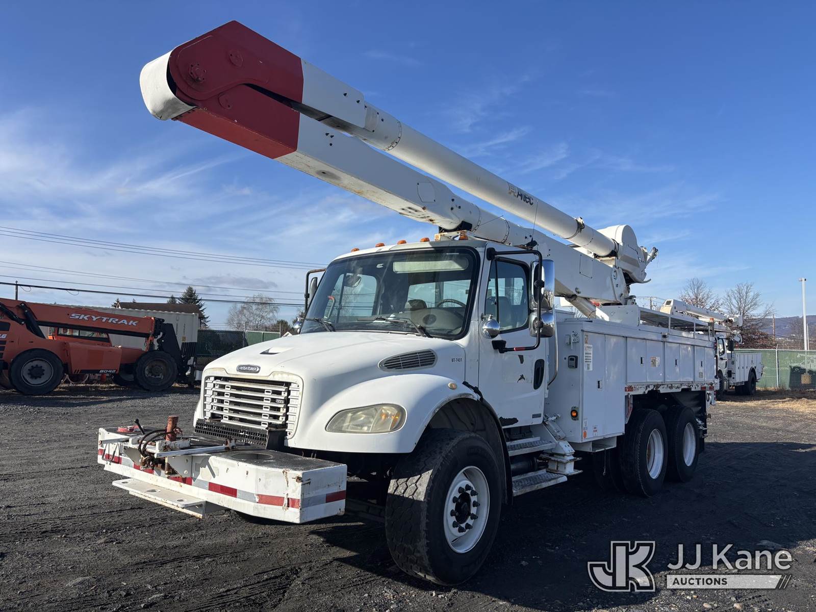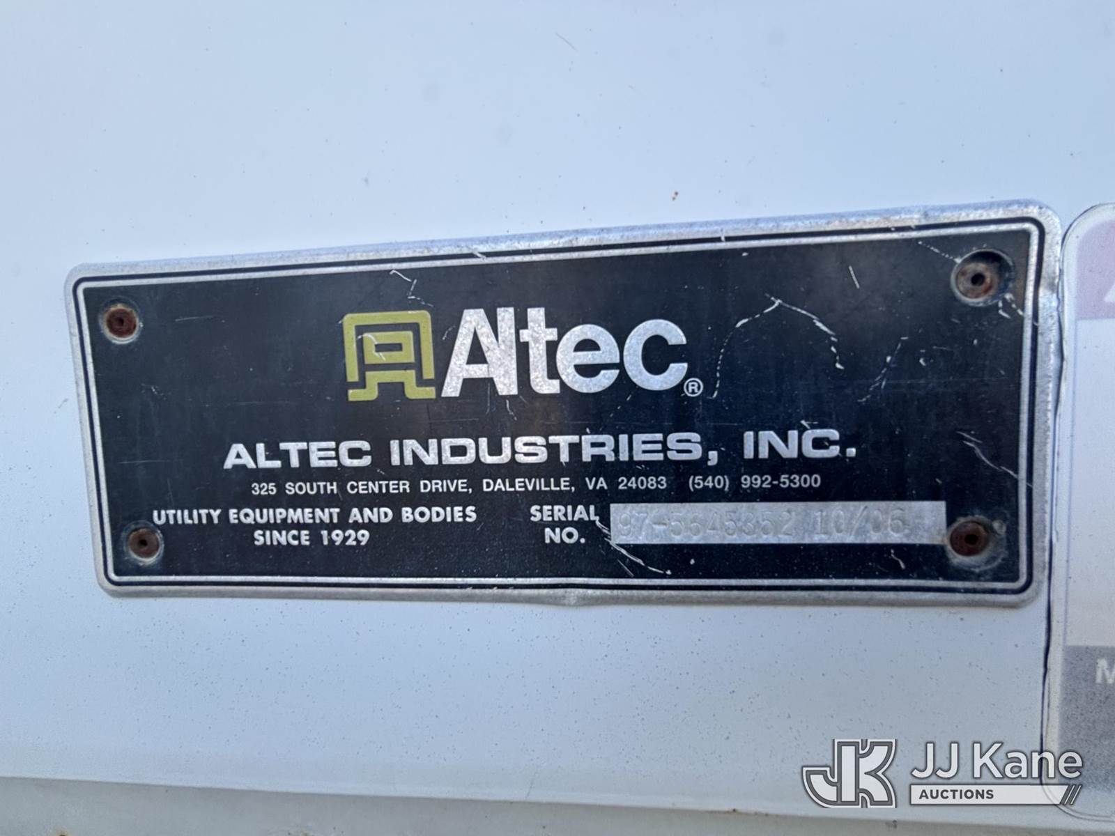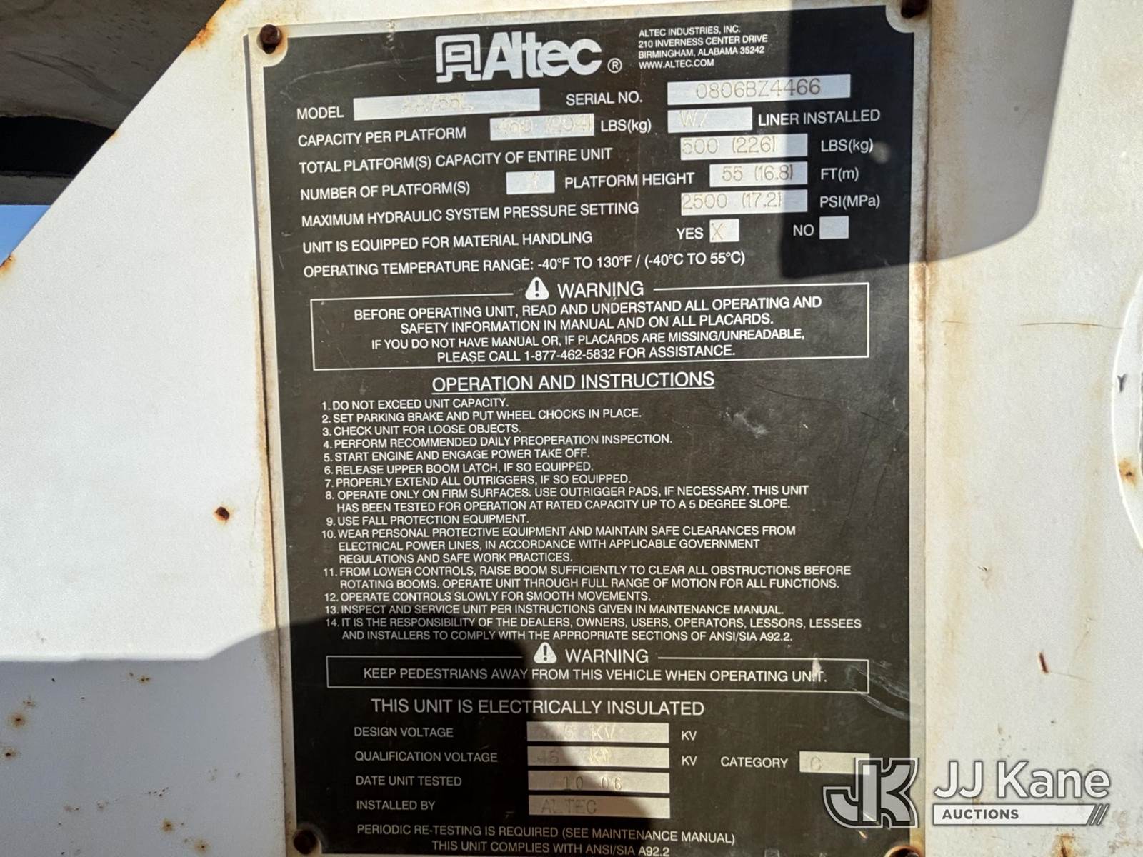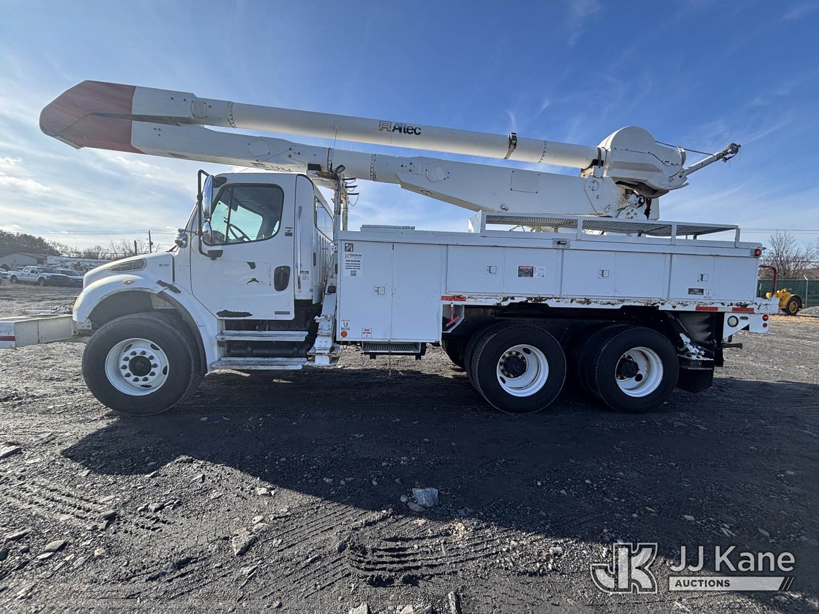 Altec AA755, 55 ft, Material Handling Bucket Truck s/n 0806BZ4466, with Two-Man Bucket, rear mounted on 2007 Freightliner M2 106 T/A Utility Truck, Cat C7 Diesel, Auto, A/C, with Front End Cable Winch & Rope, (138,789 miles) (Runs & Moves, Does Not Operate, Unit Main Fuse Leads Corroded & Cut, Condition Unknown, Several Areas of Fiberglass Damage, Cracked Hoses, Boom Tip Damage, Body & Rust Damage; Requires ANSI Inspection for repair/replacement requirements) (Reads 1,394 hours) This is a Titled Item NOTE: This unit is being sold AS IS/WHERE IS via Timed Auction and is located in Plains, PA. Inspection & preview days for this unit are the 2 business days prior to the first day of items closing for this auction, item is located at 250 Laird St Plains, PA 18705 and hours of operations are 8a-4p.For pre-sale questions, please contact Mary Darlington @ (570) 899-4930 or Mary.Darlington@JJKane.com. (Missing manuals, See Auction Company for Manufacturers Information to obtain manuals) (Buyer is responsible for removal. Assistance by consignor or JJ Kane Auctions is not assured.)
