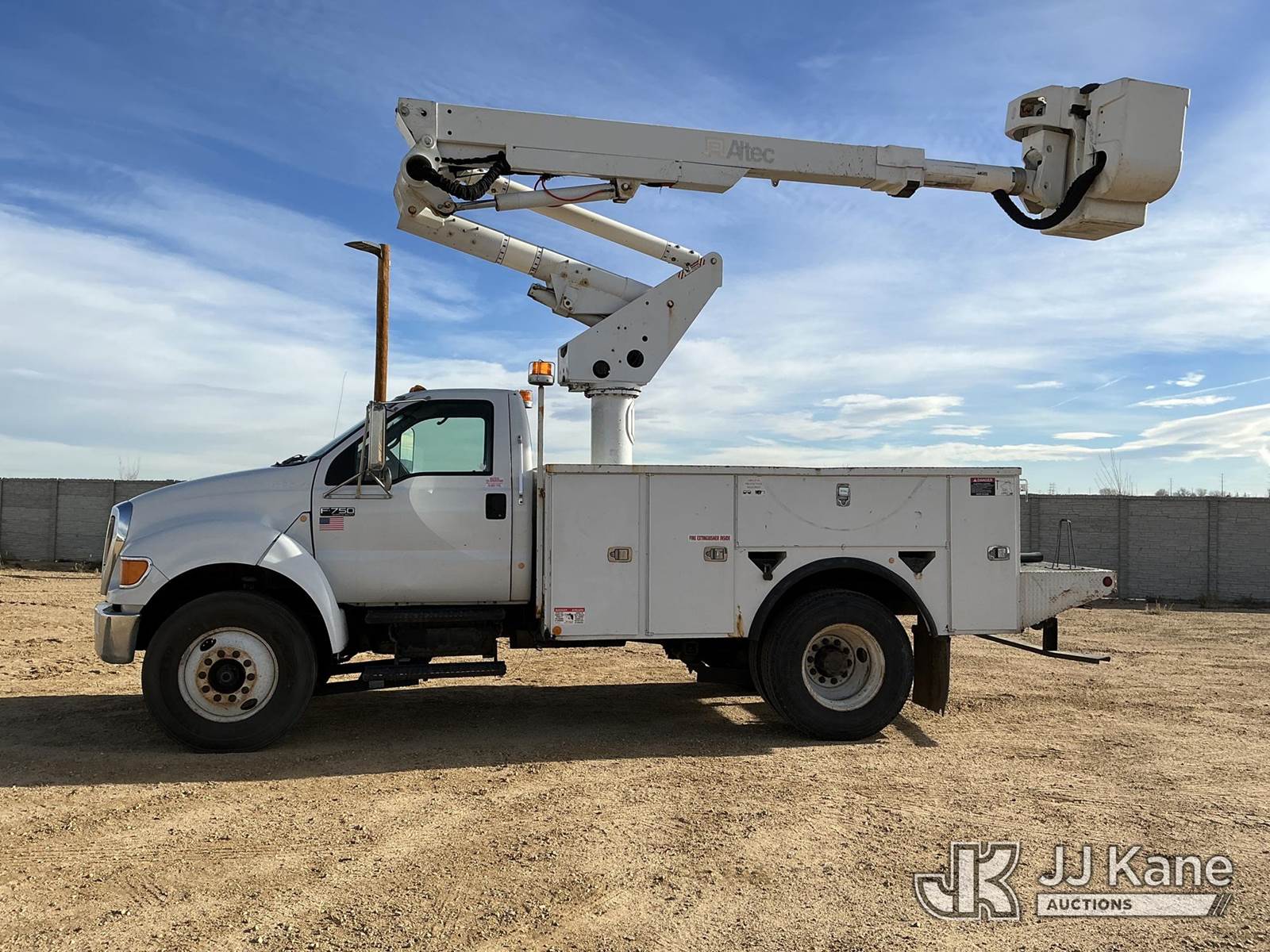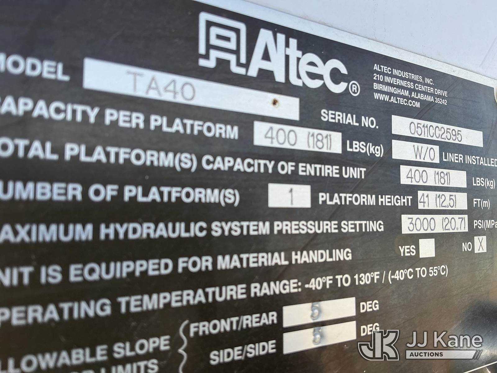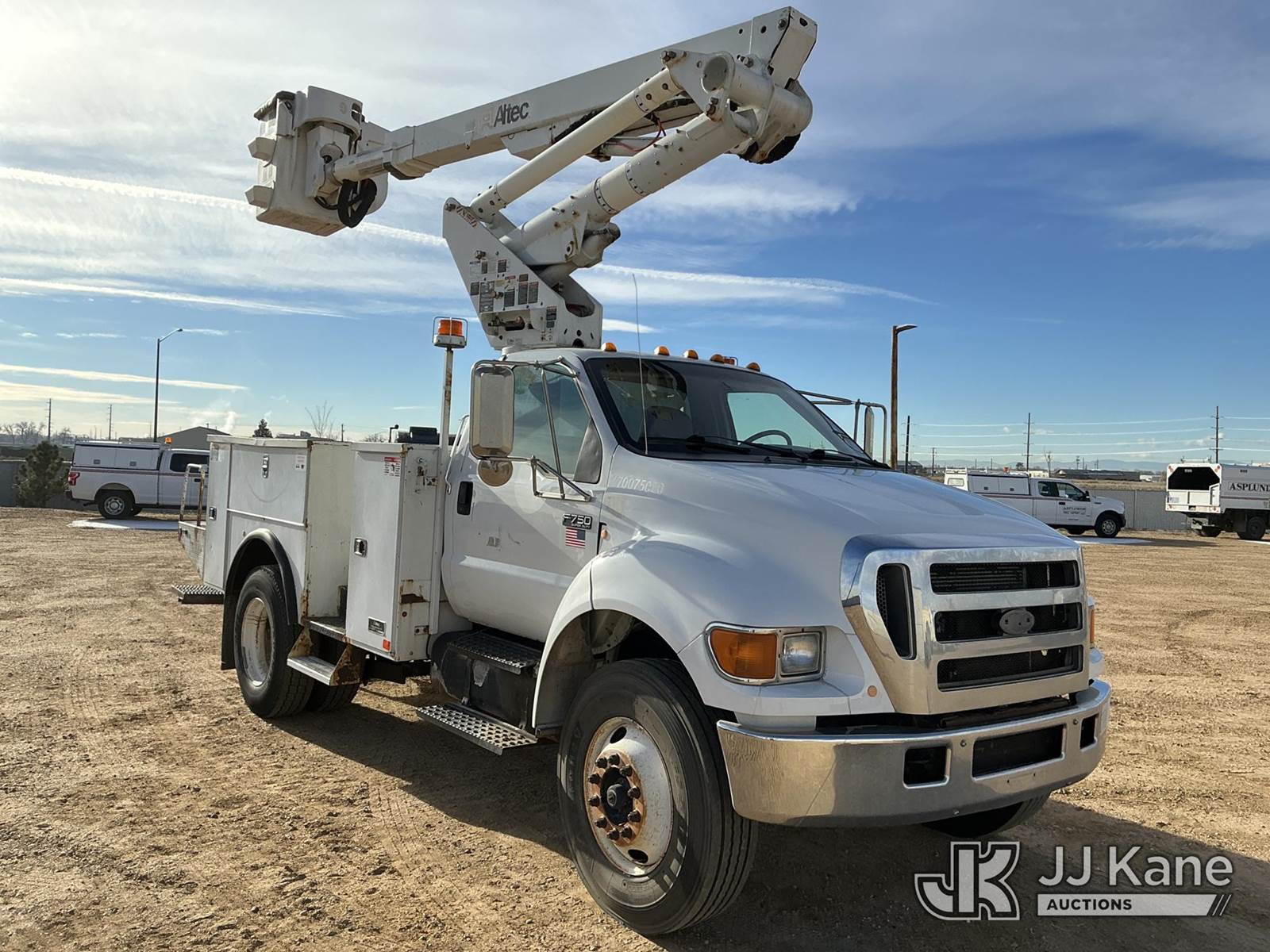 Altec TA40, 46 ft, Articulating & Telescopic Bucket Truck s/n 0511CC2595, with Single-Man Bucket, mounted behind cab on 2007 FORD F750 Utility Truck, Cat C7 Acert Auto, diesel, A/C, (149,384 miles) (Runs, Moves & Upper Operates) (No Emissions)) (Reads 3,285 hours) This is a Titled Item NOTE: This unit is being sold AS IS/WHERE IS via Timed Auction and is located in Fort Lupton, CO. Inspection & preview days for this unit are the 2 business days prior to the first day of items closing for this auction, item is located at 2105 Northland Dr Fort Lupton, CO 80621 and hours of operations are 8a-4p. For pre-sale questions, please contact Dakota Hoffman @ (720) 621-0786. Dealer License Number 47109. (Manuals provided in cab) (Buyer is responsible for removal. Assistance by consignor or JJ Kane Auctioneers is not assured.)