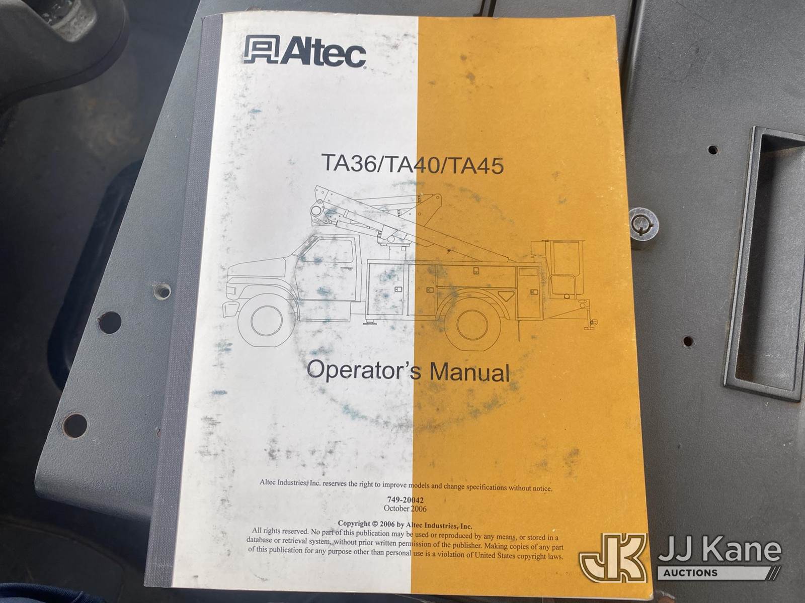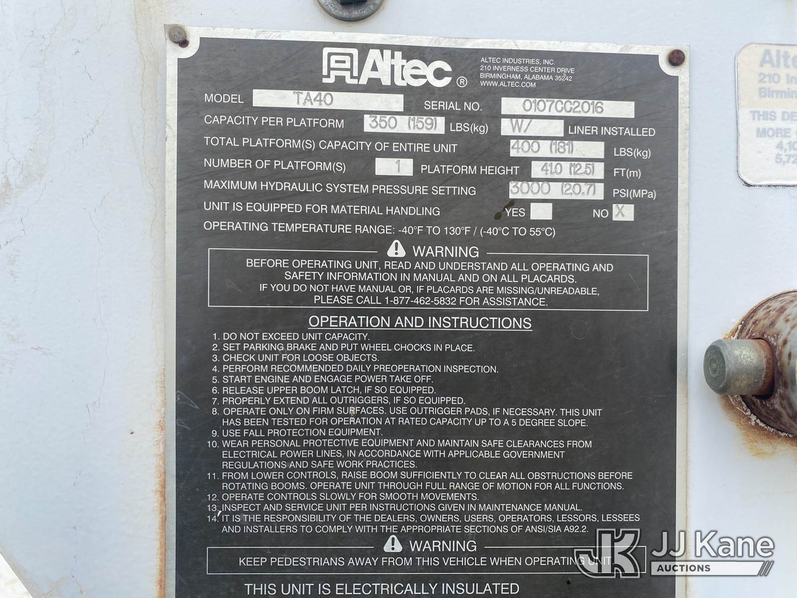 Altec TA40, 46 ft, Articulating & Telescopic Bucket Truck s/n 0107CC2016, with single-man bucket, mounted behind cab on 2007 Freightliner M2 106 Medium Duty Utility Truck, Caterpillar 3126 Diesel 4X2, Auto, A/C, (239,151 miles) 2007 FREIGHTLINER BUCKET (Runs, Moves & Upper Operates) (Bucket Damage, Hydraulic Oil Leak, Cracked Windshield) (Reads 21,871 hours) This is a Titled Item NOTE: This unit is being sold AS IS/WHERE IS via Timed Auction and is located in Villa Rica, GA. Inspection & preview days for this unit are the 2 business days prior to the first day of items closing for this auction, item is located at 100 Liberty Rd Villa Rica, GA 30180 and hours of operations are 8a-4p. For pre-sale questions, please contact Office Staff @ (470) 590-8453. (Manuals provided in cab) (Buyer is responsible for removal. Assistance by consignor or JJ Kane Auctions is not assured.)