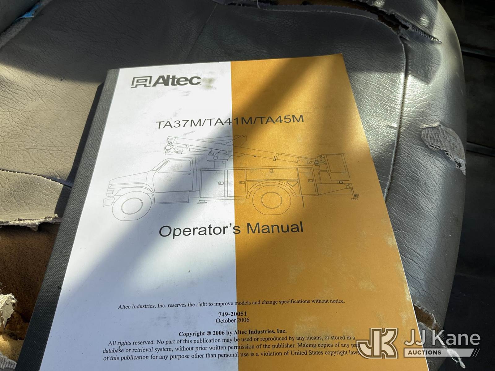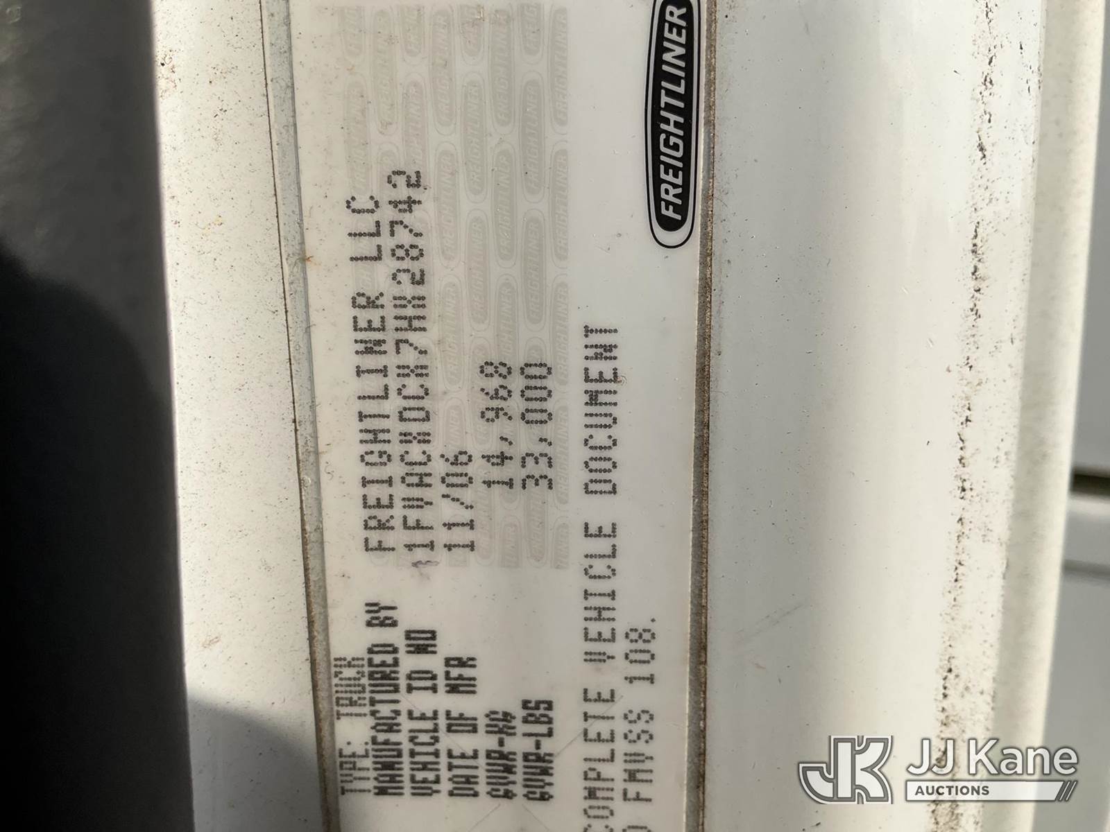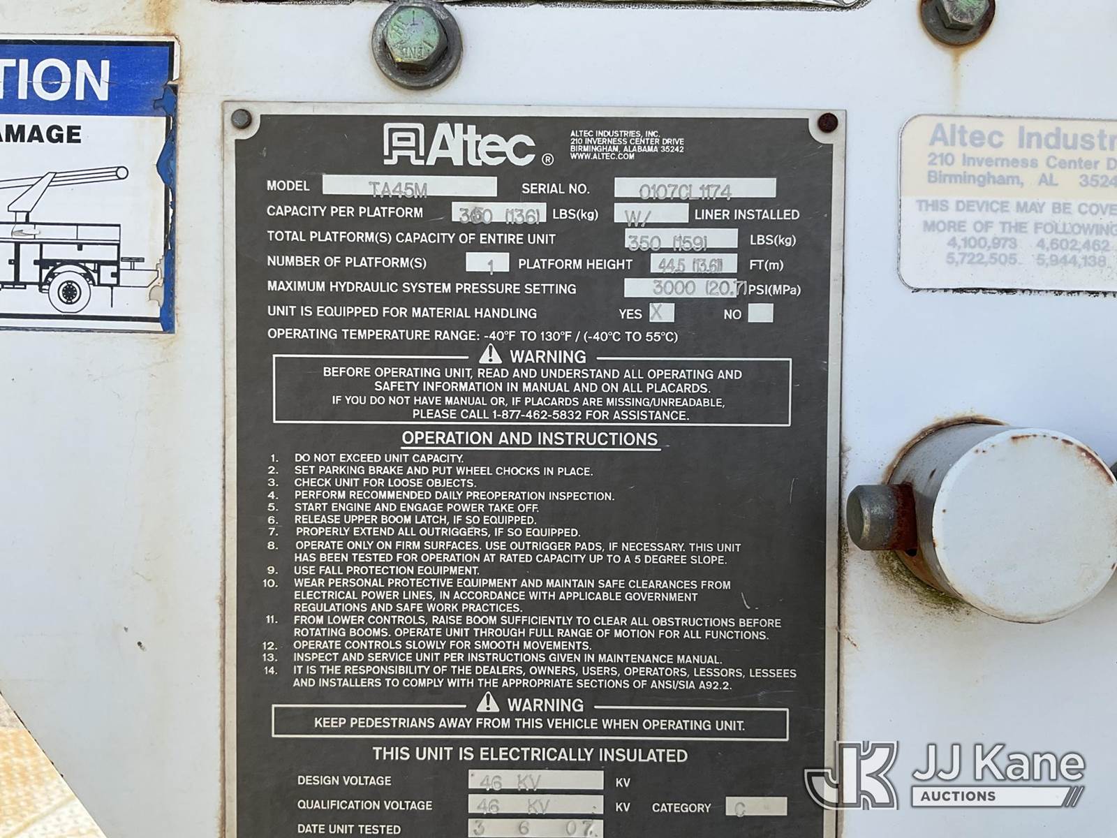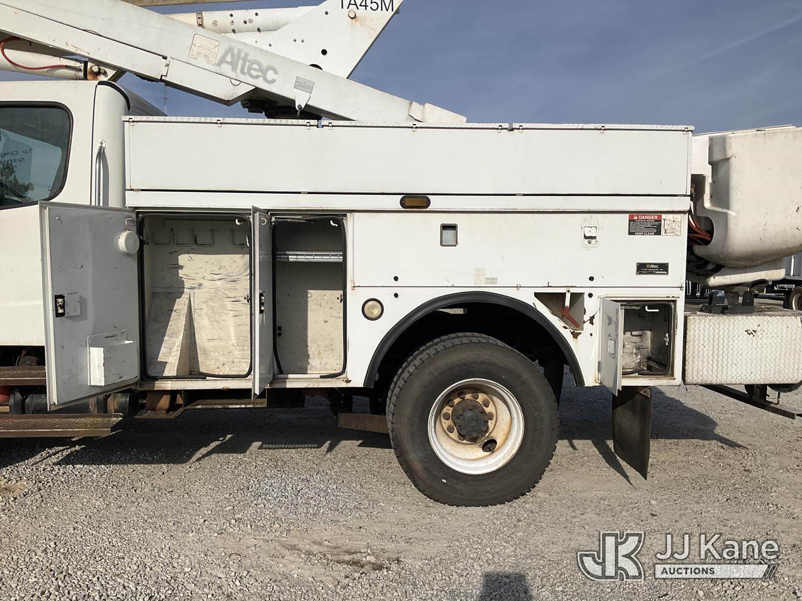 Altec TA45M, 50 ft, Articulating & Telescopic Bucket s/n 0107CL1174, with single-man bucket, mounted behind cab on 2007 Freightliner M2 106 Medium Duty Service Truck, Cat 4X2, diesel, Auto, A/C, (268,067 miles) (Runs, Moves & Upper Operates) (The manufacturer has notified JJ Kane that this equipment is subject to an open recall. CSN 643 TA Winch Brake Inspection The equipment should not be operated until this is addressed. Buyer is responsible for reviewing the recall notice and contacting the manufacturer to schedule the recommended corrective actions. Associated costs may be covered by the manufacturer in some cases.) This is a Titled Item NOTE: This unit is being sold AS IS/WHERE IS via Timed Auction and is located in Villa Rica, GA. Inspection & preview days for this unit are the 2 business days prior to the first day of items closing for this auction, item is located at 100 Liberty Rd Villa Rica, GA 30180 and hours of operations are 8a-4p. For pre-sale questions, please contact Office Staff @ (470) 590-8453. (Manuals provided in cab) (Buyer is responsible for removal. Assistance by consignor or JJ Kane Auctions is not assured.)