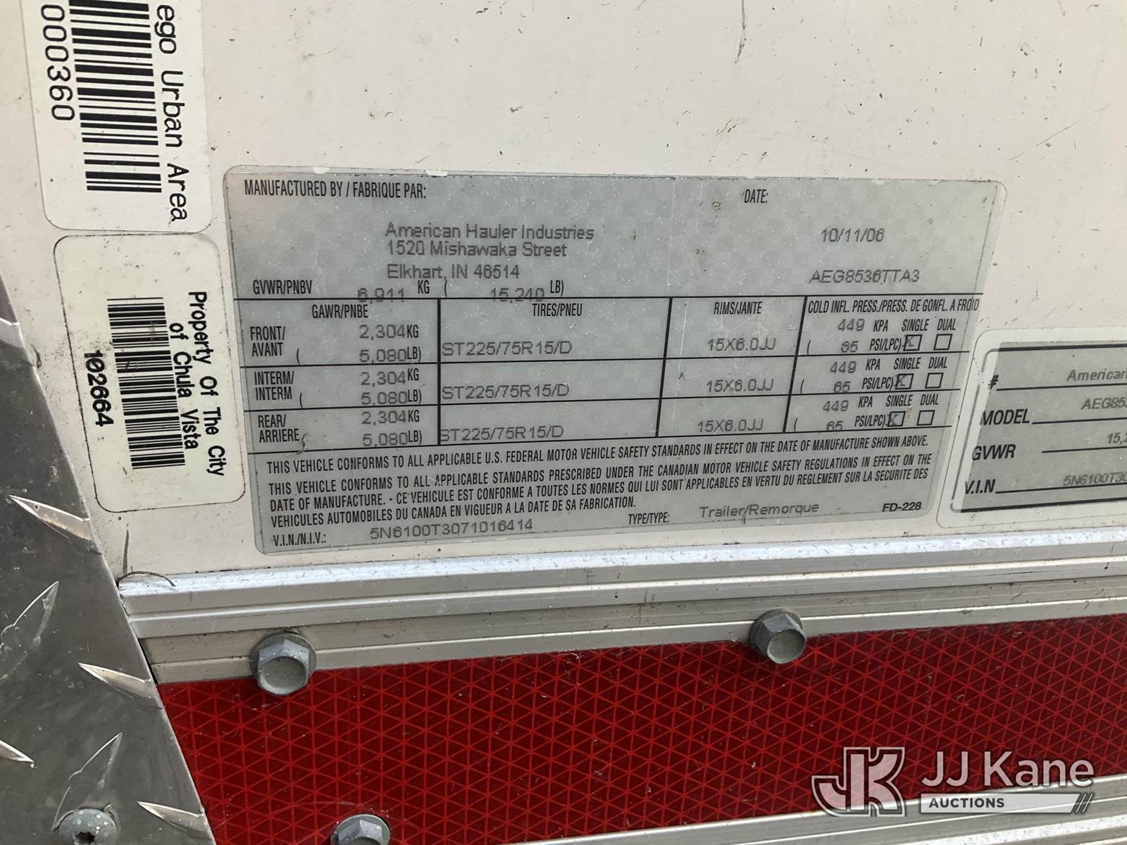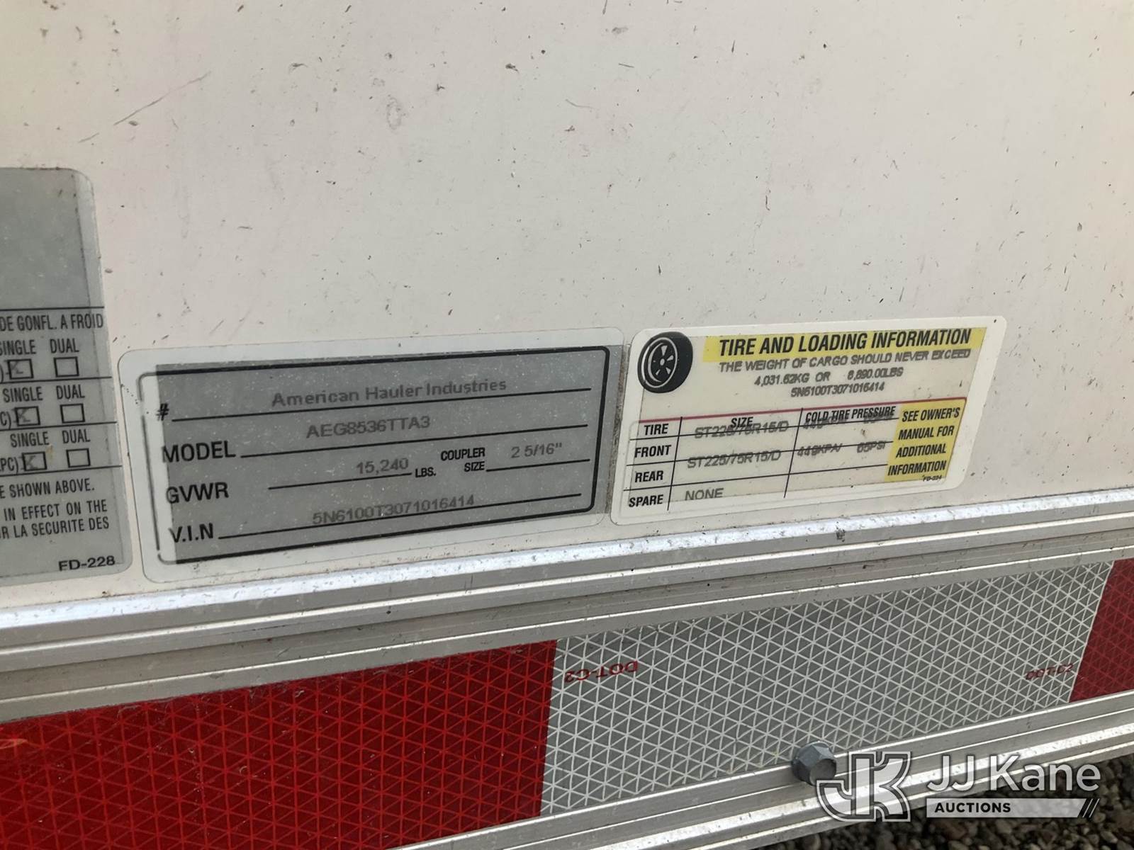 2007 American Hauler Enclosed Cargo Trailer, with trailer length = 29ft 6in trailer width = 8ft 5in, total trailer length = 34ft 10in, This is a Titled Item NOTE: This unit is being sold AS IS/WHERE IS via Timed Auction and is located in Jurupa Valley, CA. Inspection & preview days for this unit are the 2 business days prior to the first day of items closing for this auction, item is located at 4510 Muth Way Jurupa Valley, CA 92509 and hours of operations are 8a-4p. For pre-sale questions, please contact please contact Office Staff @ (310) 353-7140. Dealer License Number 45696. (Buyer is responsible for removal. Assistance by consignor or JJ Kane Auctions is not assured.)