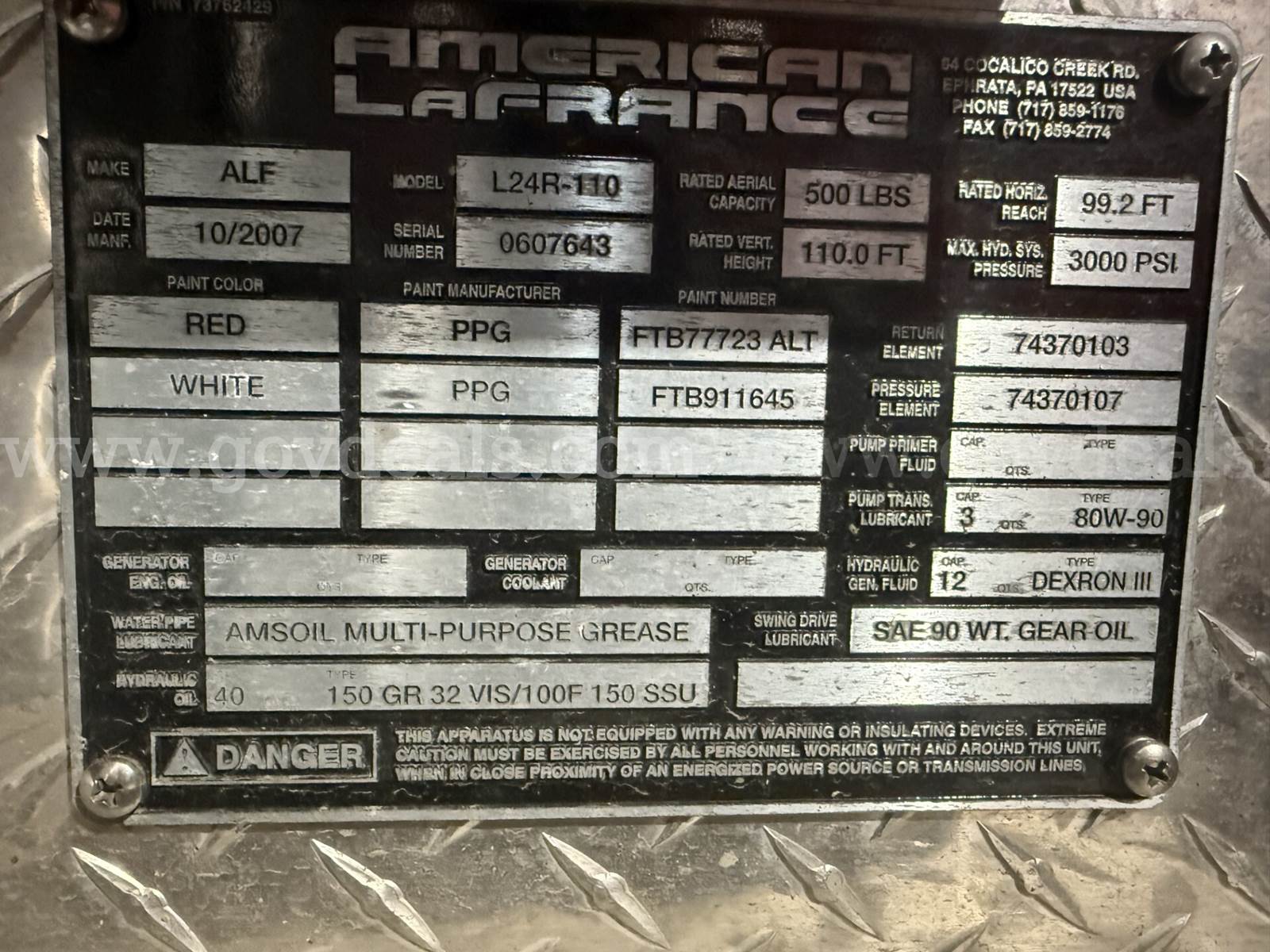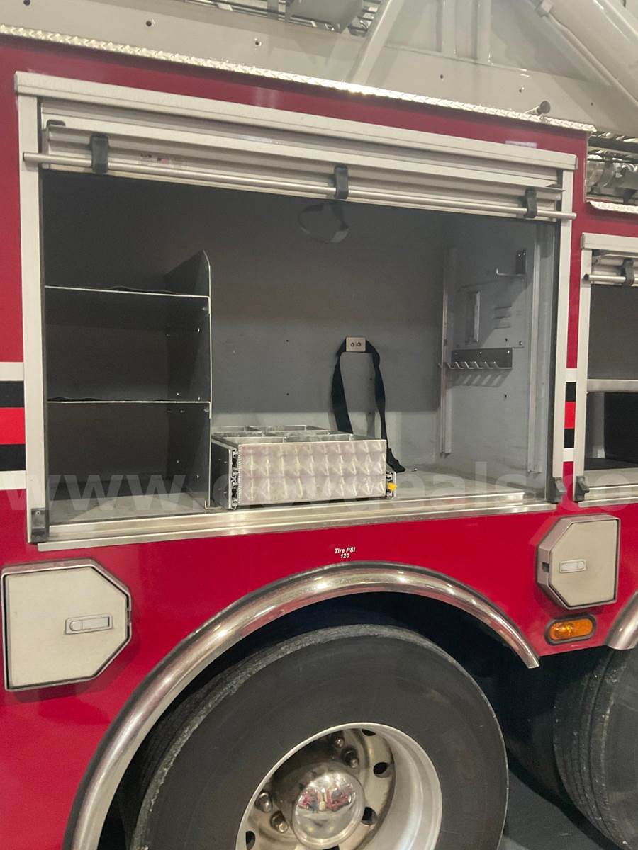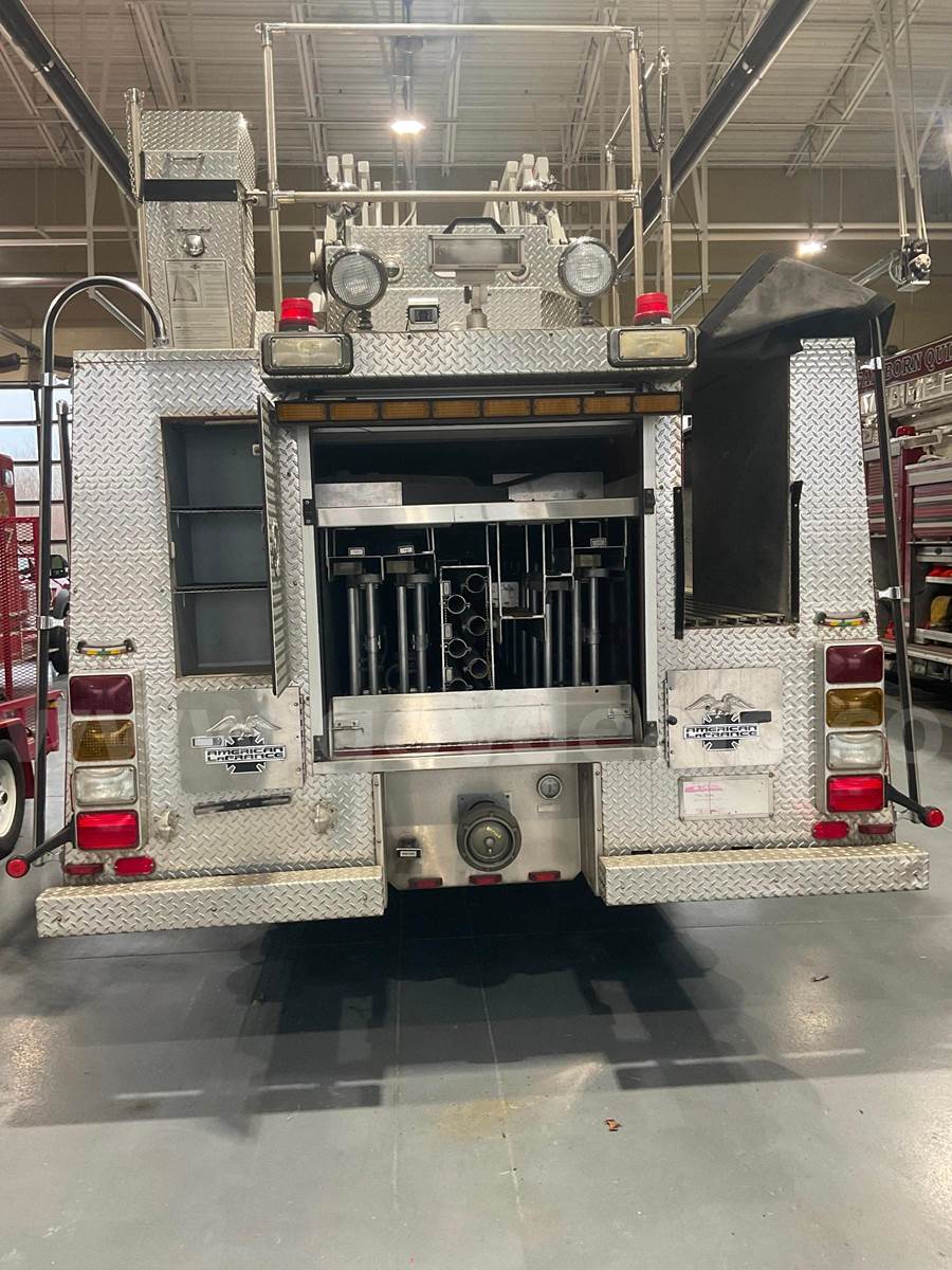 2007 American LaFrance Eagle. Removed from service 1/2026 - All 4 new drive axle air bags 6/23 - New radiator 4/24 - In frame overhaul on engine 8/24 – Cost $40,218.52 - 4 new rear drive tires 9/25 - Passed 2025 Aerial, pump and ground ladder inspections - Aerial is out of service due to PTO not working - 8,000 watt hydraulic driven generator - 2 roof ladders, 2 – 35’ extension ladders, 1 – 28’ extension ladder - has a Hale 2000 GPM pump - 110 foot Aerial ladder