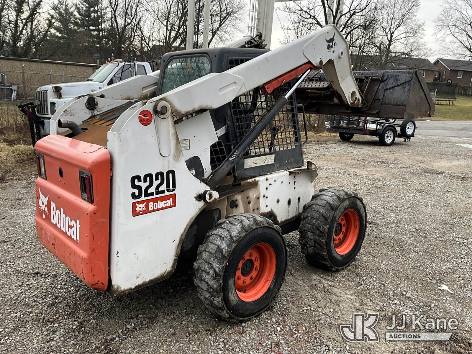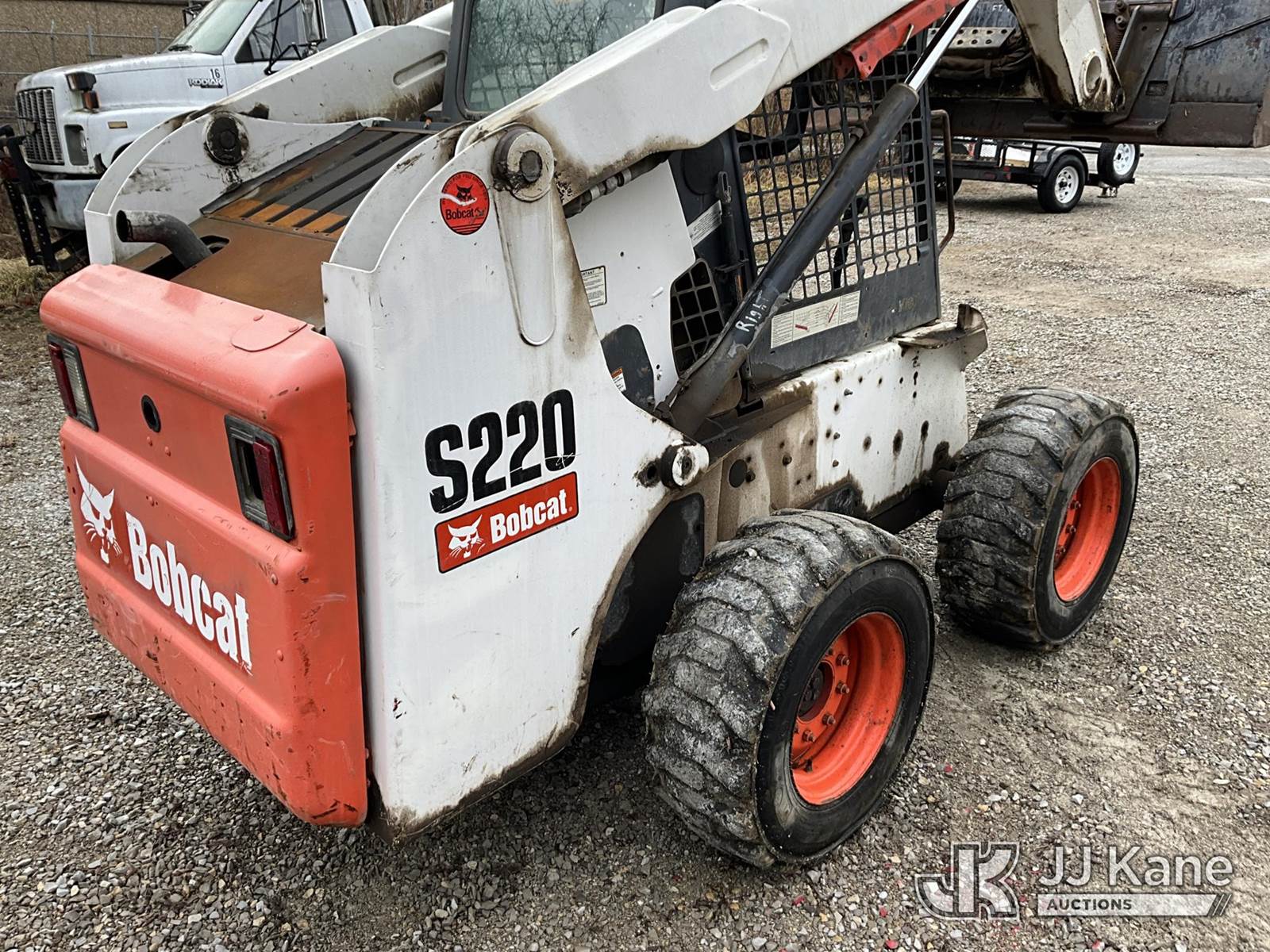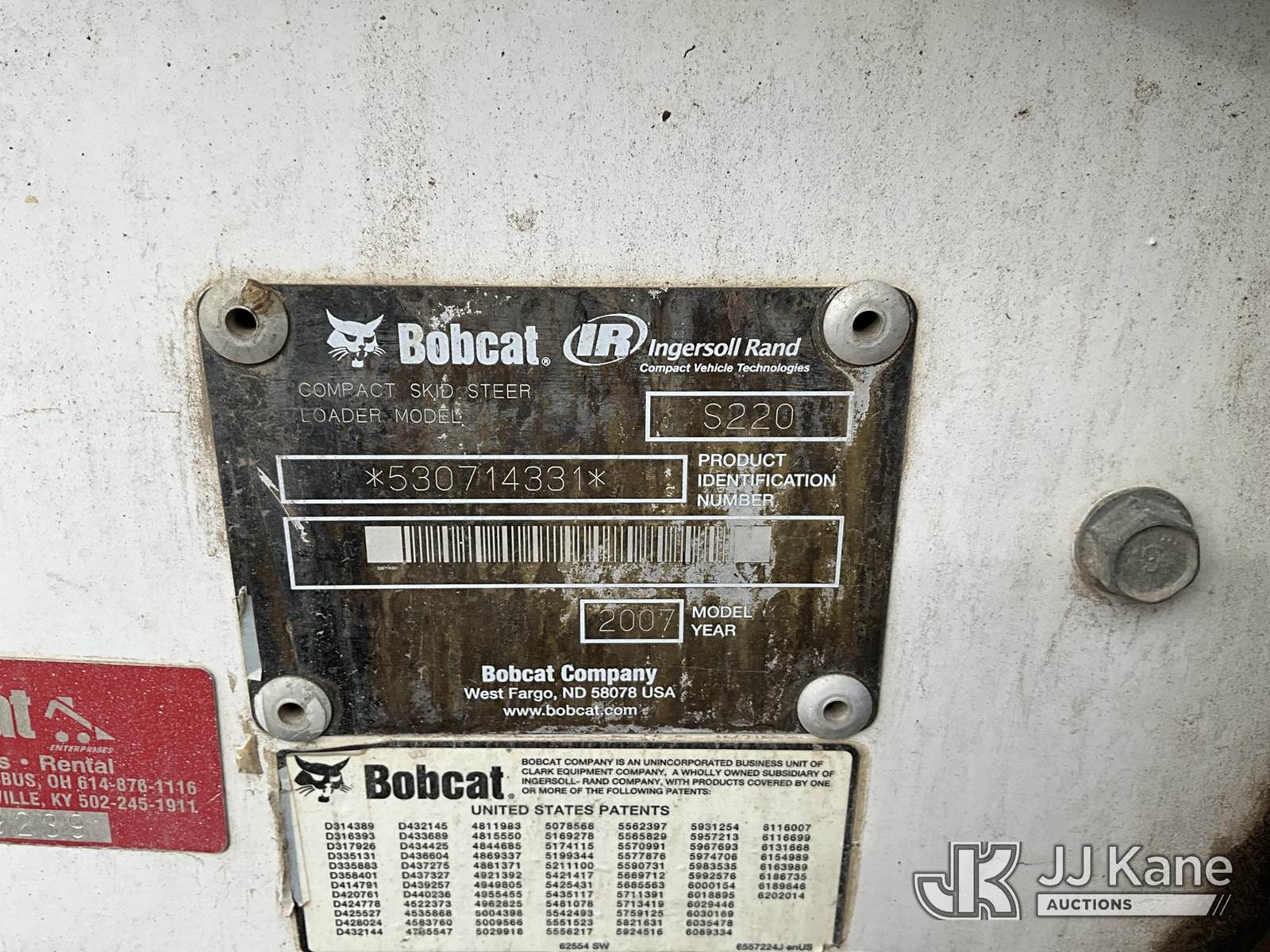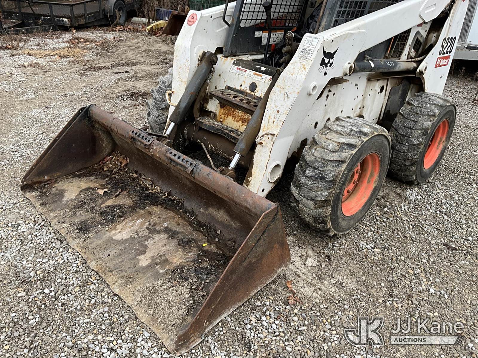 2007 Bobcat S220 Rubber Tired Skid Steer Loader, s/n 530714331, Bobcat diesel, Hydrostatic, with 2 spd. hyd. flow, aux. hydraulics & 74 in GP bucket, (Runs & Operates) (Seller States: Hyd. Leak) (Reads 2,732 hours) NOTE: This unit is being sold AS IS/WHERE IS via Timed Auction and is located in Fort Thomas, KY. For more information & removal arrangements please contact Spencer Owen @ 502-232-2541. Load Out will be by appointment only M-F; must call 24 HRS. in advance. Buyer/Hauler must present copy of paid invoice upon arrival. Purchaser acknowledges ALL lots must be removed within 5 business days of Auction, or a storage fee may be incurred. This item is used and may contain defects that are not immediately detectable. Text description and photos given are meant to be used as a guide only. The conditions are provided by the consignor; you are responsible for inspecting item before bidding. All information provided is believed to be correct but no warranty as such is either intended or implied. All items are sold AS IS - WHERE IS AND WITH ALL FAULTS AND DEFECTS THEREIN. Auctioneer Michael Whitebread / License # 256617 (Buyer is responsible for removal. Assistance by consignor or JJ Kane Auctions is not assured.)