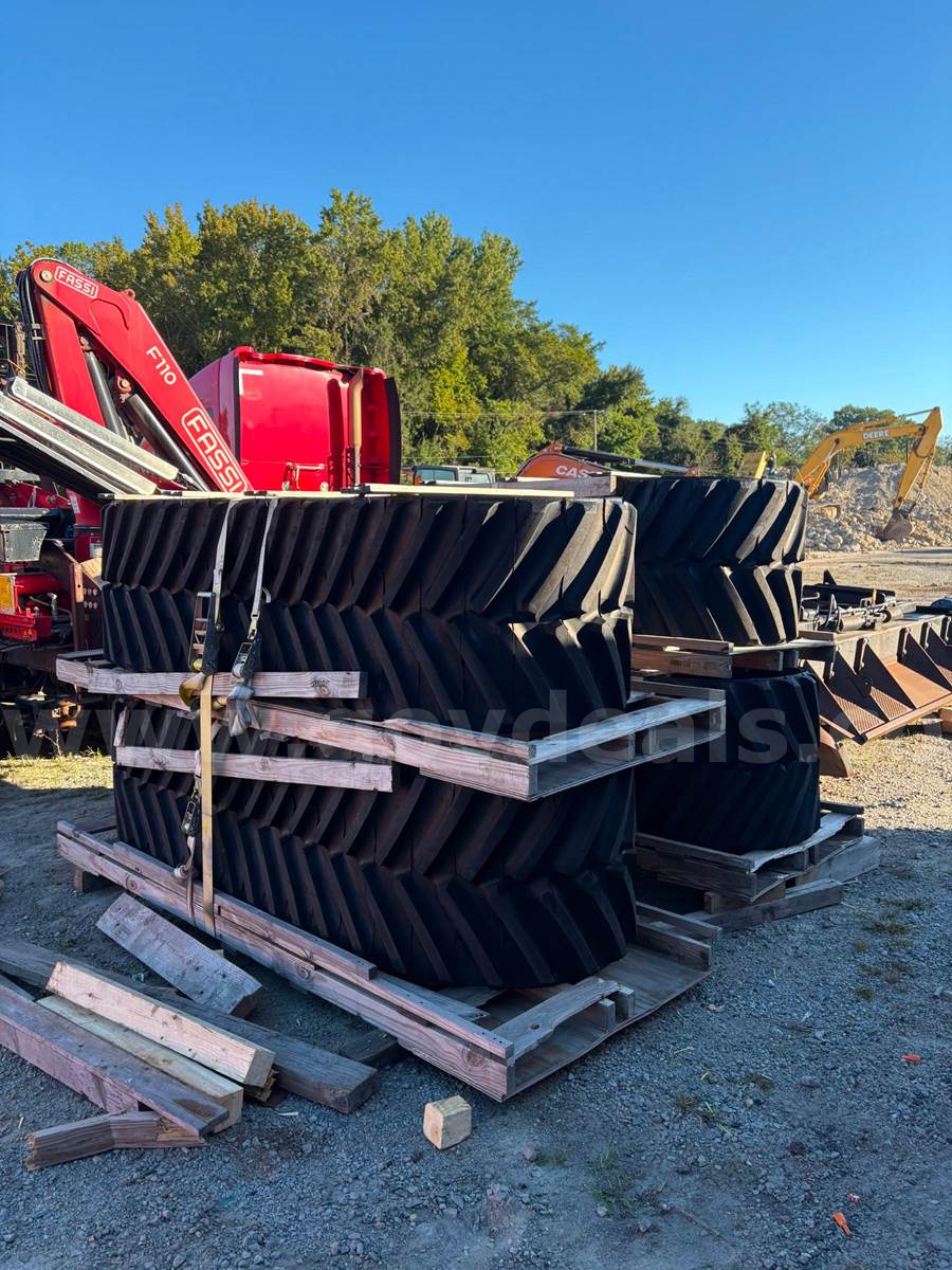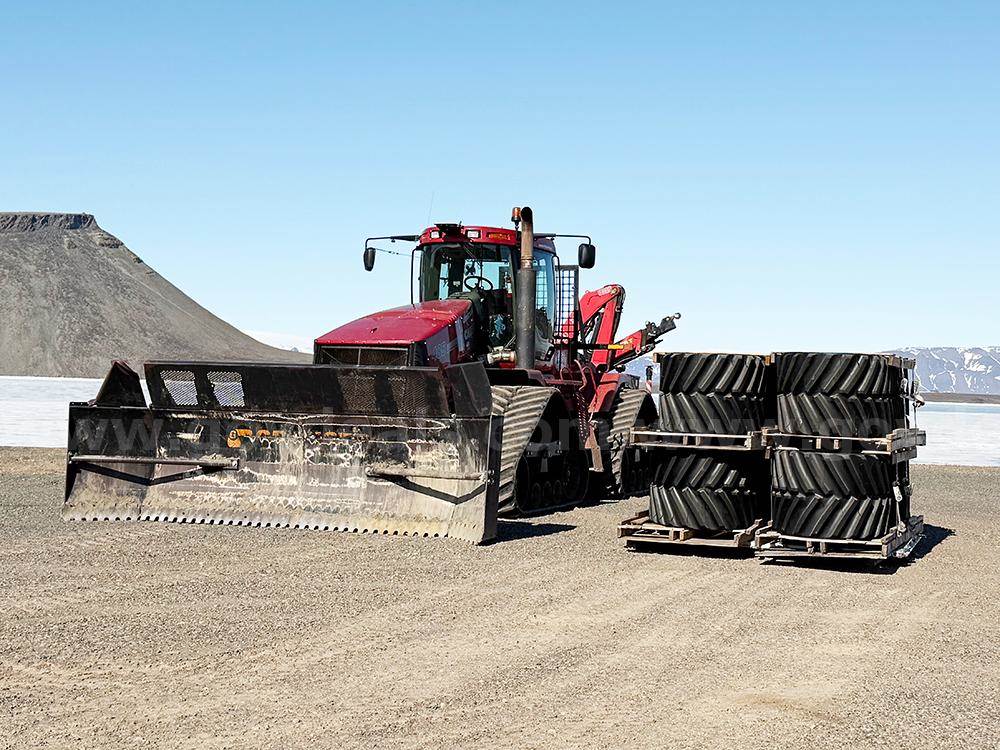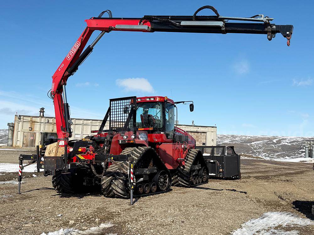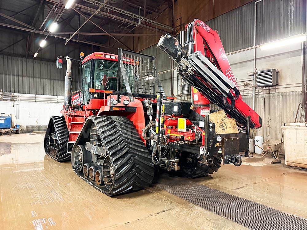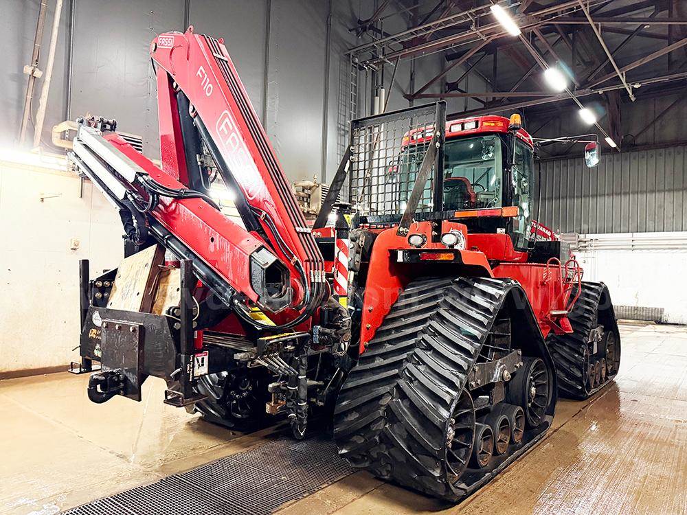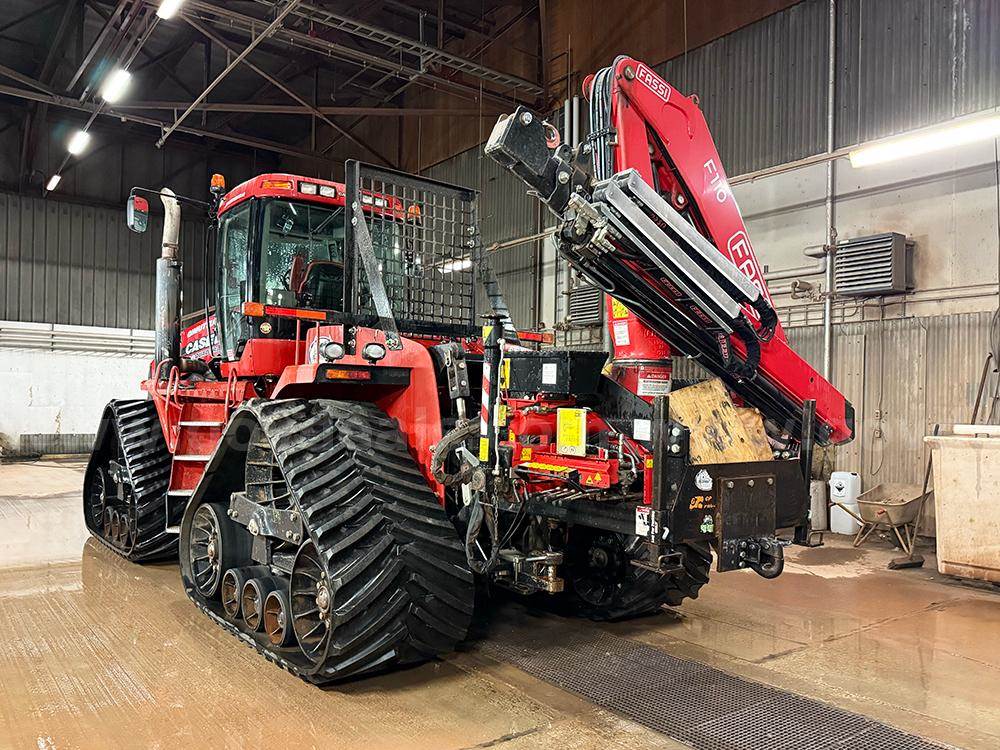 2008 Case Quadtrac 485 with push frame & blade and Fassi crane rear mounted to the 3-point hitch. This 2008 Quadtrac currently has a problem with internal engine seals failing from the last several years of cold storage, it is leaking coolant into the engine oil crankcase and some coolant going into the fuel system. Oil filters and engine oil were changed out when brought out of cold storage in May 2025 (essentially in cold storage since fall 2016). The engine still runs well but long-term engine damage will be the result if this machine is used for any length of time without the engine being repaired. The left rear drive wheel has some cracks in the steel casting; this drive wheel should be replaced before the tractor is put into working service.
