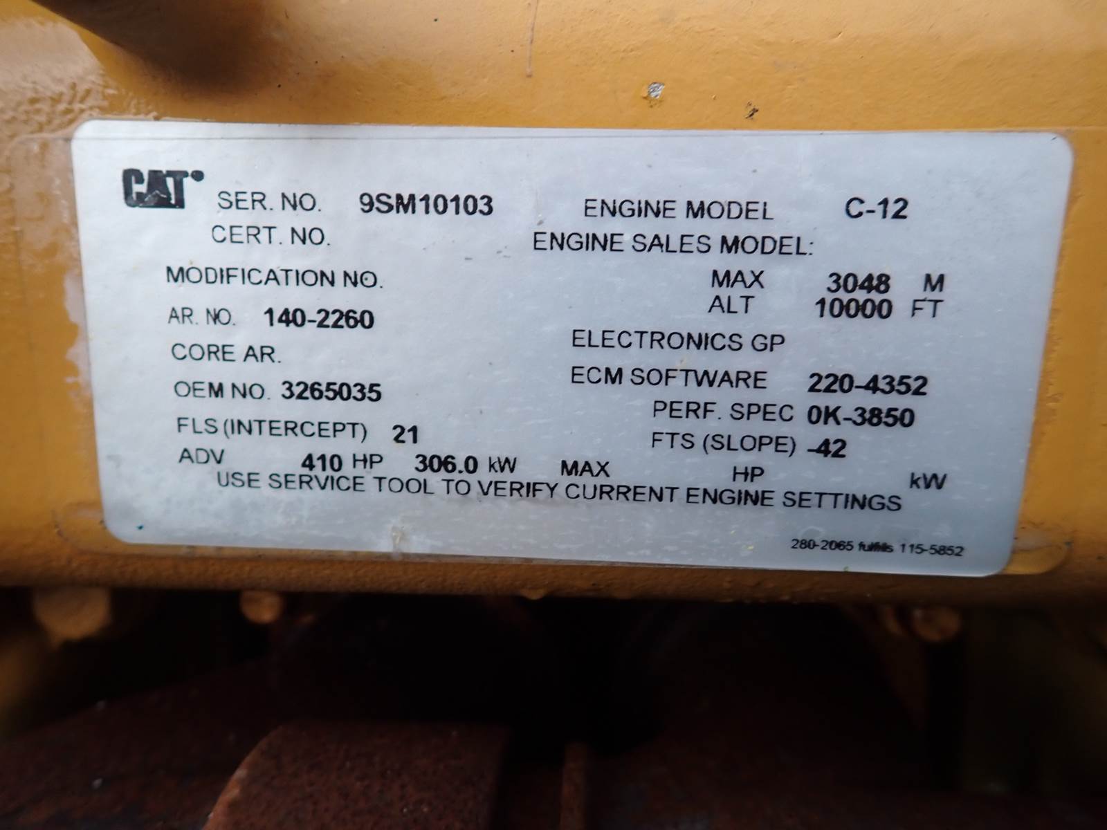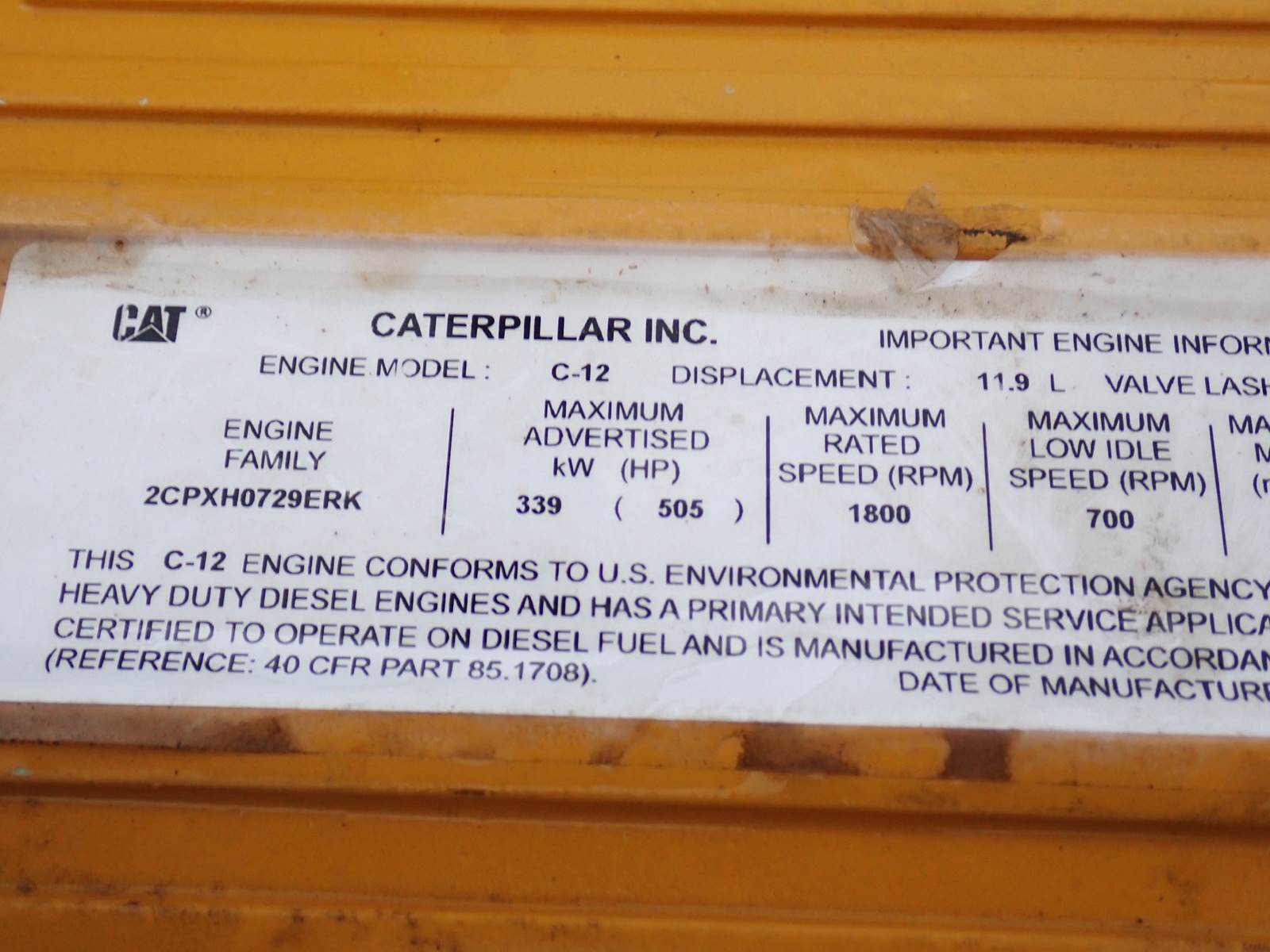 2007 Caterpillar C12 diesel engine, on-road truck applications, removed from an Oshkosh military vehicle, jake brakes, 410 HP rating, 9SM prefix, 70 pin ECM, AR # 140-2260 (1402260,) 232 total run hours, 91 idle hours, 2,855 original miles. ENGINE HAS NO TIME AT ALL - AS CLOSE TO NEW AS YOU'LL EVER SEE! RUNS OUT EXCELLENT, SEE VIDEO. IMPOSSIBLE TO FIND -- WILL GO RIGHT INTO YOUR TRUCK !!