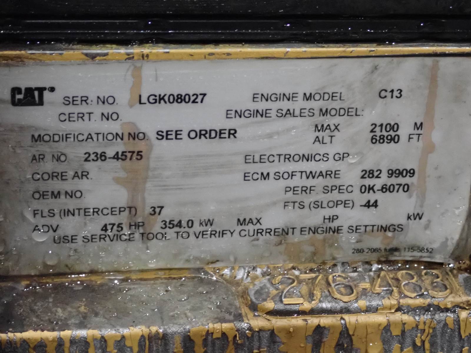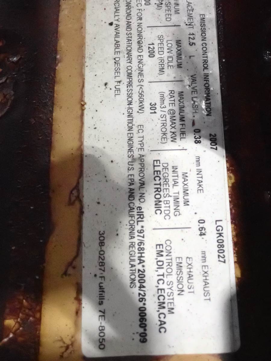 2007 Caterpillar C13 diesel engine, 475 HP at 2200 RPM rating, arrangement # 236-4575 (2364575,) LGK prefix, PRE EMISSIONS, 4441 total run hours. REMOVED FROM AN MB AIRPORT SWEEPER IN STRONG RUNNING CONDITION -- SEE VIDEO. NO SMOKE OR BLOWBY OBSERVED DURING COLD TEST RUN, GOOD OIL PRESSURE.