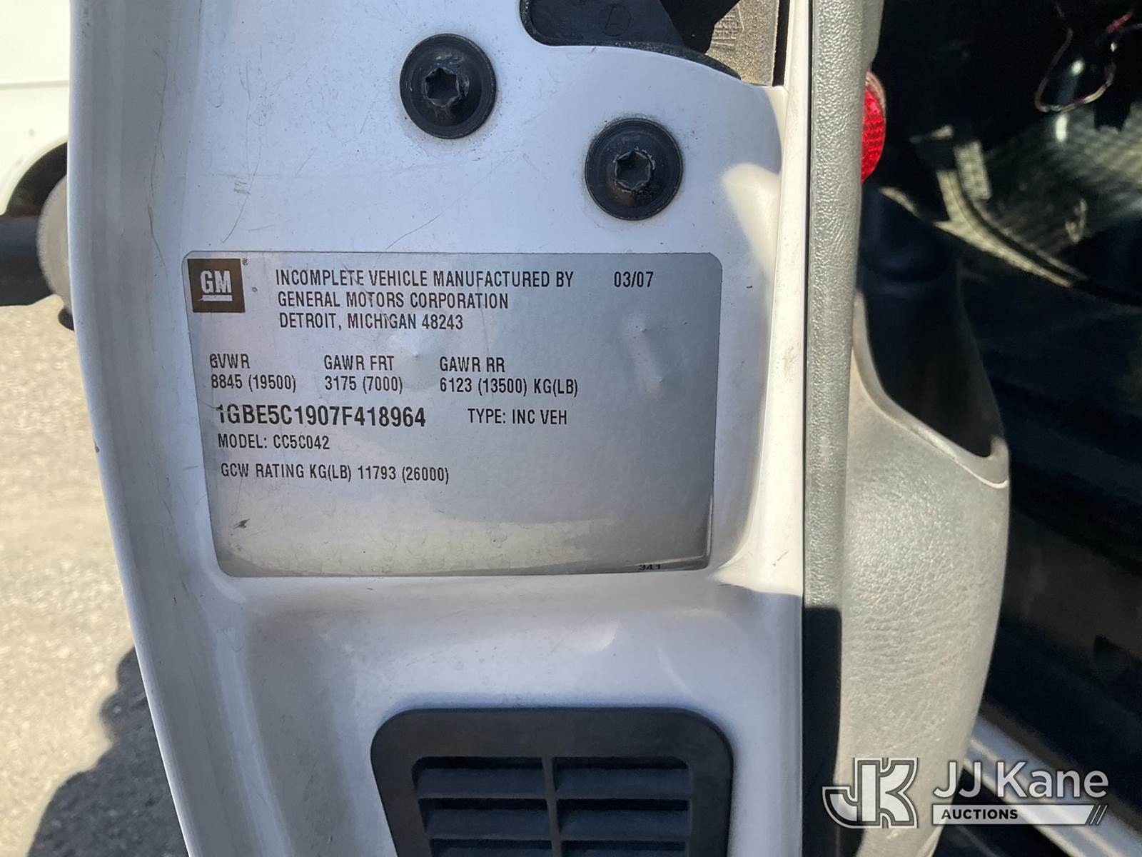 2007 Chevrolet C5C042 Mechanics Service Truck, s/n 1GBE5C1907F418964, 6.6L Turbo Diesel Auto, 4X2, A/C, with Auto Crane w/ Remote Control, Tow Package, Welder, Hose Reel, Vise Grip, (42,361 miles) (Runs, Moves & Crane Operates) Welder Missing Parts) Subject to CARB Regs,CARB non Compliant,Cannot Operate on CA Roads/Highways until Compliant This is a Titled Item NOTE: This unit is being sold AS IS/WHERE IS via Timed Auction and is located in Jurupa Valley, CA. Inspection & preview days for this unit are the 2 business days prior to the first day of items closing for this auction, item is located at 4510 Muth Way Jurupa Valley, CA 92509 and hours of operations are 8a-4p. For pre-sale questions, please contact please contact Office Staff @ (310) 353-7140. Dealer License Number 45696. (Buyer is responsible for removal. Assistance by consignor or JJ Kane Auctions is not assured.)