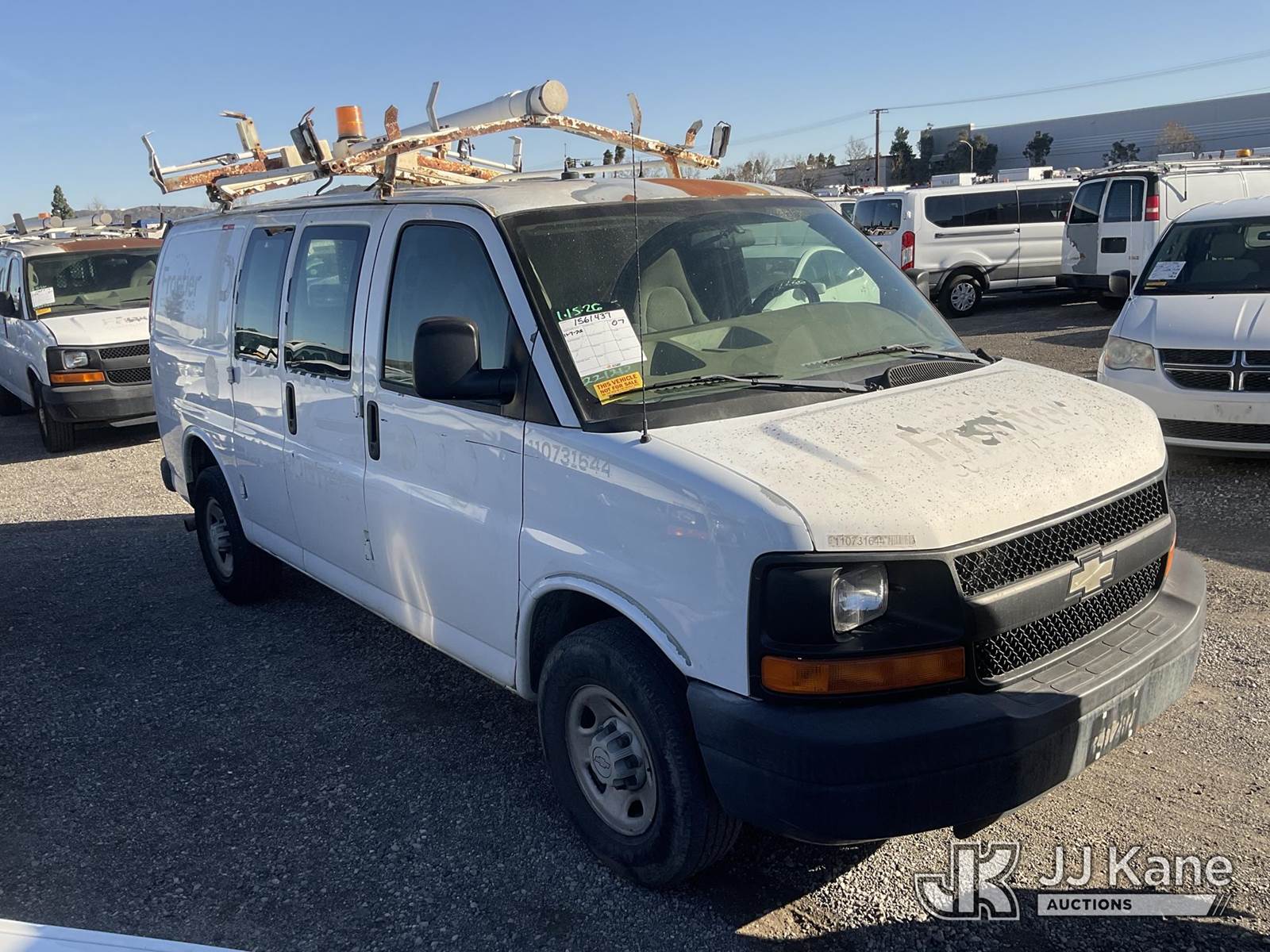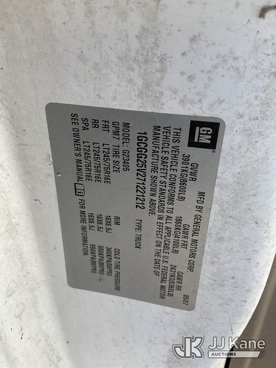 2007 Chevrolet Express 2500 Cargo Van, 4.8L V8 OHV 16V Gas 4-Speed Automatic, RWD, A/C, with Ladder Rack, Metal Shelves, (158,999 miles) (Runs & Moves) (Roof Paint Damage, Needs New Battery, Won’t Clear Drive Cycle) (Bidding Restricted to Licensed Vehicle Dealers Only), This is a Titled Item NOTE: This unit is being sold AS IS/WHERE IS via Timed Auction and is located in Jurupa Valley, CA. Inspection & preview days for this unit are the 2 business days prior to the first day of items closing for this auction, item is located at 4510 Muth Way Jurupa Valley, CA 92509 and hours of operations are 8a-4p. For pre-sale questions, please contact please contact Office Staff @ (310) 353-7140. Dealer License Number 45696. (Buyer is responsible for removal. Assistance by consignor or JJ Kane Auctions is not assured.)