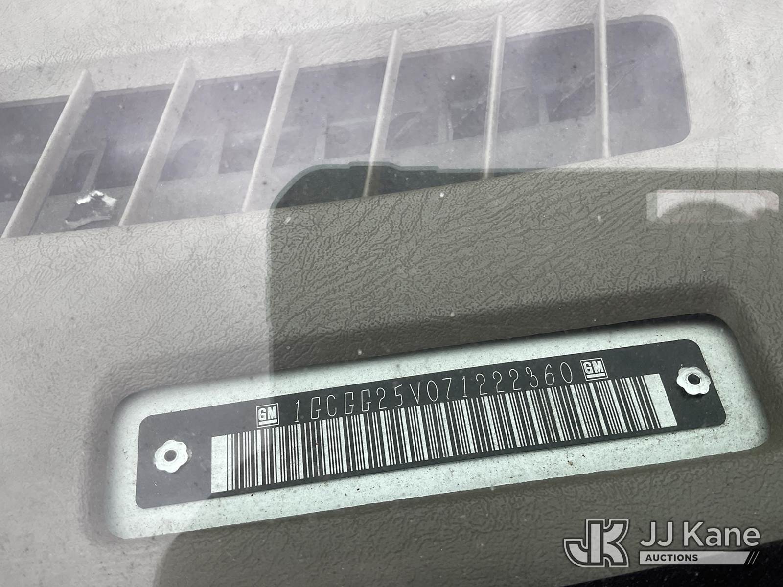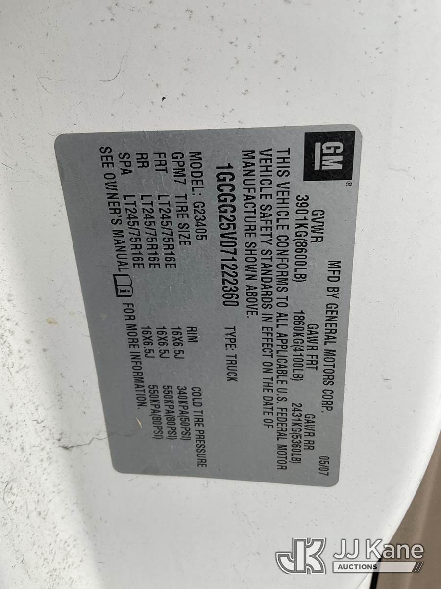2007 Chevrolet Express 2500 Cargo Van, s/n 1GCGG25V071222360, 8-cyl gas, 4-Speed Automatic, A/C, with Ladder Rack, Metal Shelves, (144,200 miles) (Runs & Moves) (Tire has Dry Rot) (Bidding Restricted to Licensed Vehicle Dealers Only), This is a Titled Item NOTE: This unit is being sold AS IS/WHERE IS via Timed Auction and is located in Jurupa Valley, CA. Inspection & preview days for this unit are the 2 business days prior to the first day of items closing for this auction, item is located at 4510 Muth Way Jurupa Valley, CA 92509 and hours of operations are 8a-4p. For pre-sale questions, please contact please contact Office Staff @ (310) 353-7140. Dealer License Number 45696. (Buyer is responsible for removal. Assistance by consignor or JJ Kane Auctions is not assured.)