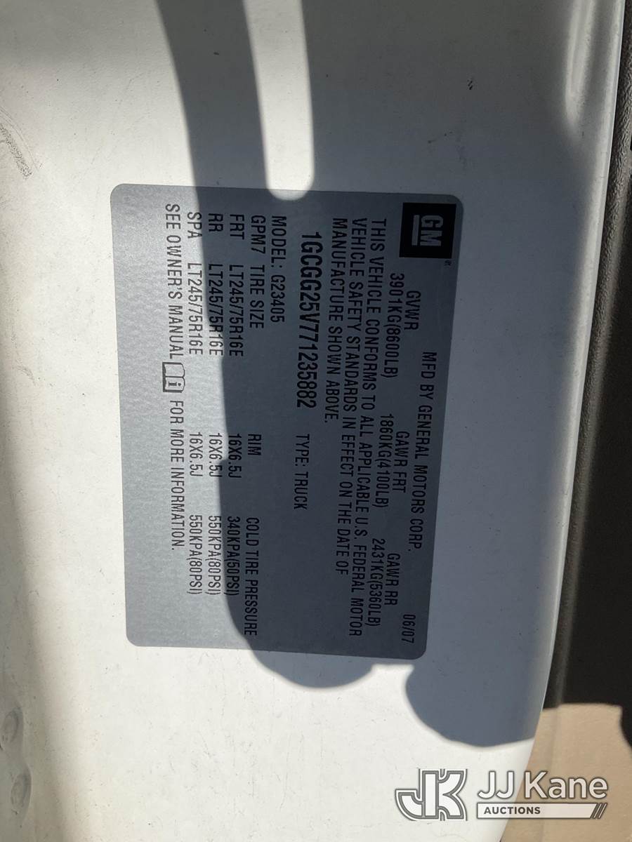 2007 Chevrolet Express 2500 Cargo Van, s/n 1GCGG25V771235882, 4.8L V8 OHV 16V Gas, 4-Speed Automatic, RWD, A/C, with ladder rack, (125,401 miles) (Runs & Moves) This is a Titled Item NOTE: This unit is being sold AS IS/WHERE IS via Timed Auction and is located in Jurupa Valley, CA. Inspection & preview days for this unit are the 2 business days prior to the first day of items closing for this auction, item is located at 4510 Muth Way Jurupa Valley, CA 92509 and hours of operations are 8a-4p. For pre-sale questions, please contact please contact Office Staff @ (310) 353-7140. Dealer License Number 45696. (Buyer is responsible for removal. Assistance by consignor or JJ Kane Auctions is not assured.)