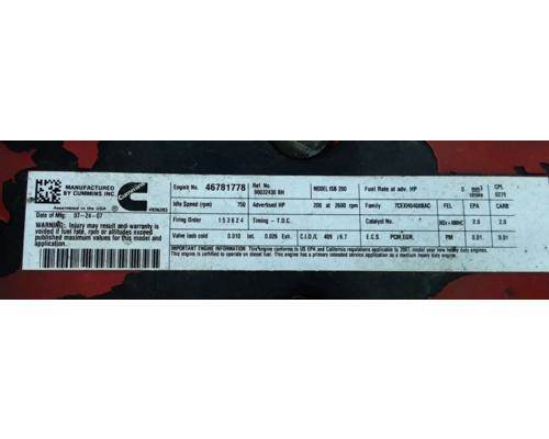 ISB 6.7, 200 HP, EPA 2007, S/N 46781778 , CPL-0279, CM2150, Running Engine 61,142 Odometer Miles 76,653.5 ECM Miles 19,825 Engine Hours