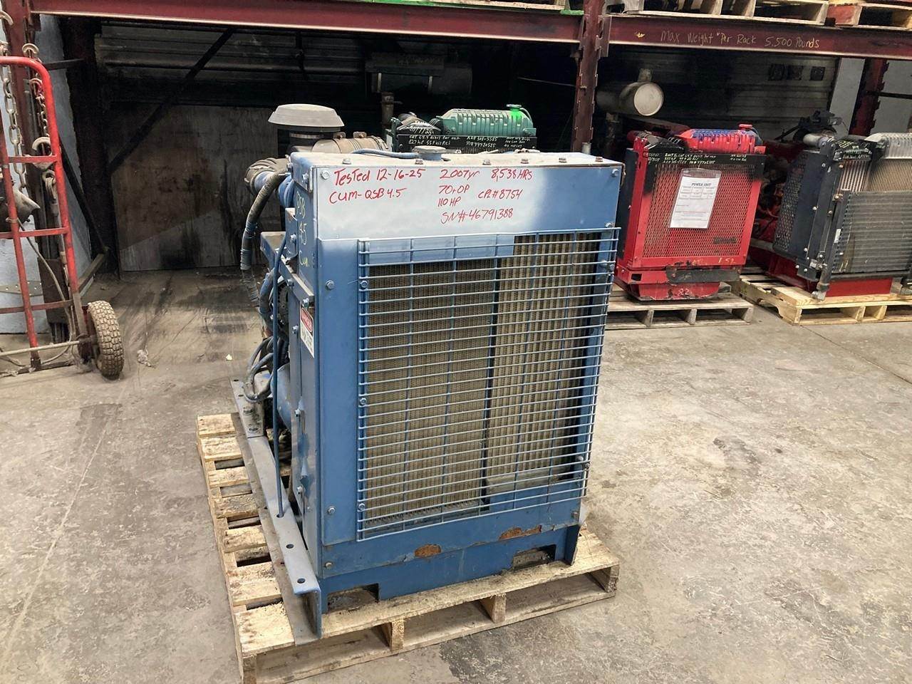 GOOD USED 2007 CUMMINS QSB4.5 HYDRAULIC DIESEL POWER UNIT FOR SALE at ADELMAN’S TRUCK PARTS in CANTON, OHIO. 8,538 HOURS SHOWING ON ECM, RUN TESTED and COMPLETE with RADIATOR and CHARGE AIR COOLER, STARTER, ALTERNATOR, and PUMP DRIVE (NO PUMPS). COMES WITH CONTROL BOX, 110 HP @ 2500 RPM, 7CEXL0275AAG FAMILY #, with DDI, ECM, TC, & CAC EMISSIONS CONTROL SYSTEMS, TIER 3, 8754 CPL#, CM850 with COMMON RAIL FUEL SYSTEM, and 70+ LBS OIL PRESSURE.