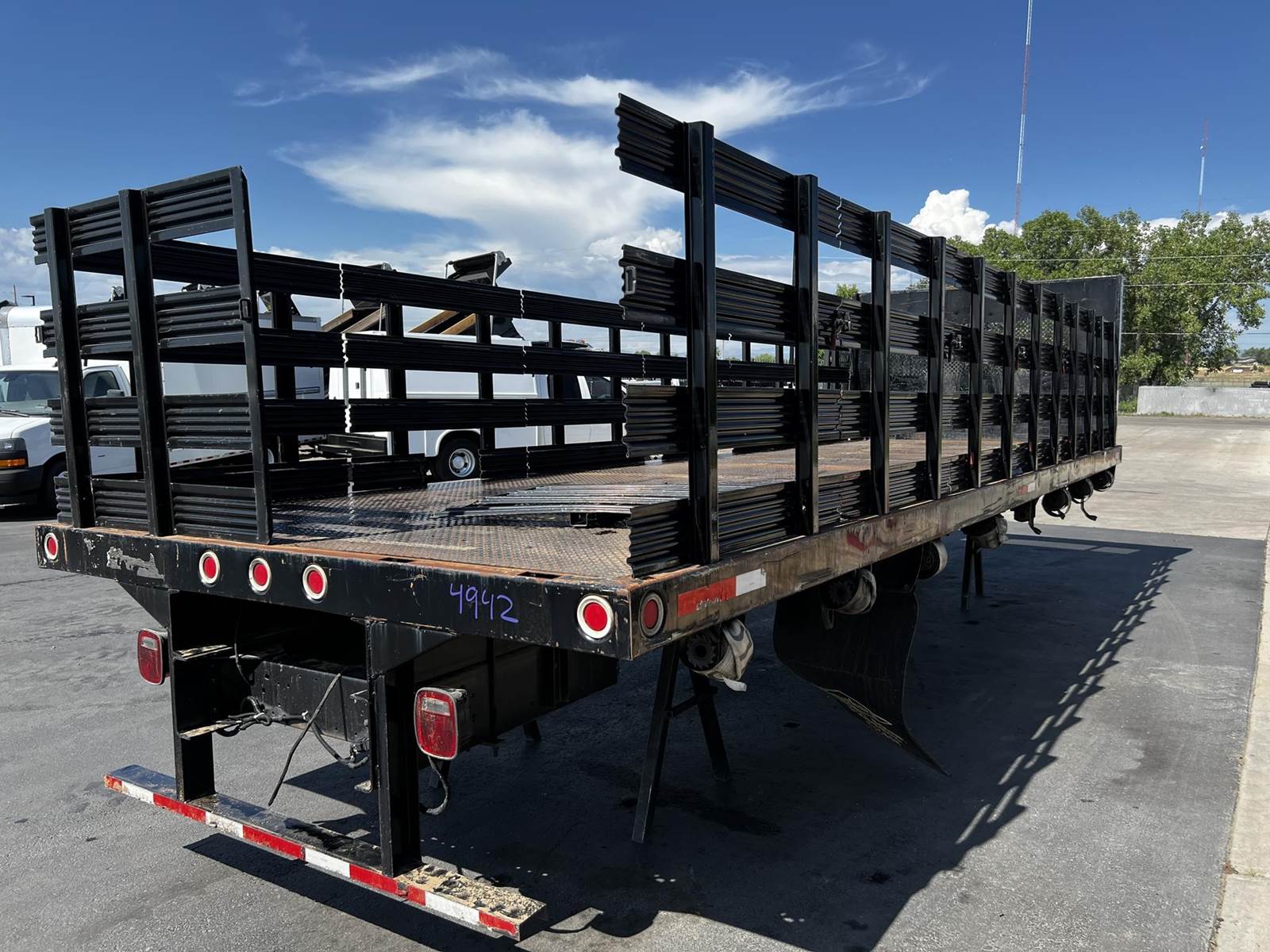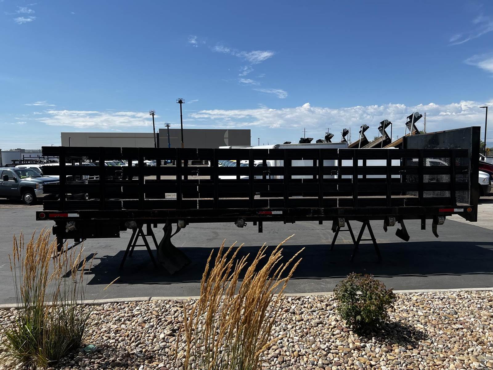24'L 96"W Stake side flatbed, Dimond Plate Steel Deck, Mounted Ratchet Strap Tie downs, Removeable Metal Stake Sides Racks. Includes Stacked Panels. Quality Install Available, Ship Ready, Call DTI Trucks for more information and a shipping quote.